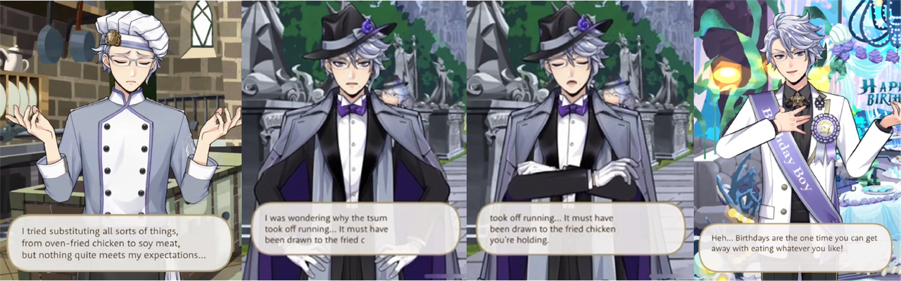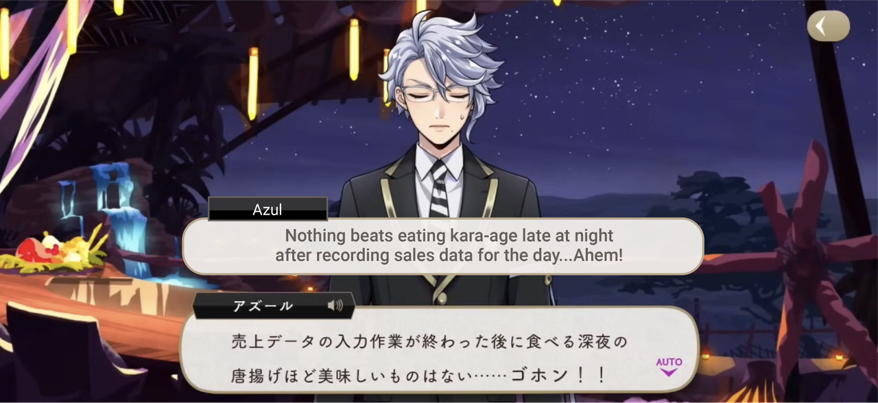 Azul’s favorite food is kara-age (localized as “fried chicken” on EN), and he says he has tried recreating it with healthier alternatives (using oven-fried chicken and soy meat as examples), but “nothing quite meets (his) expectations…”