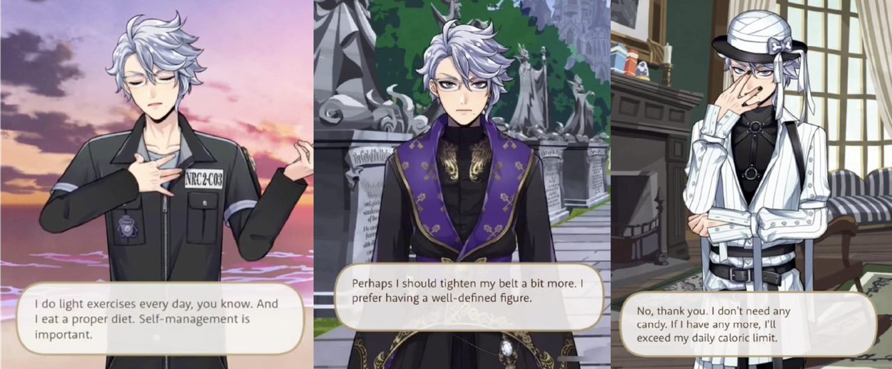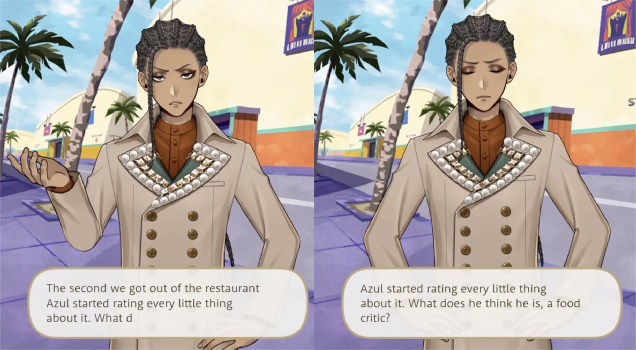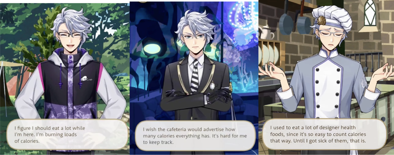 Azul has multiple lines in the game about tracking calories, mentioning not wanting to exceed his “daily caloric limit,” saying, “I wish the cafeteria would advertise how many calories everything has. It’s hard for me to keep track,” and, “I used to eat a lot of designer health foods, since it’s so easy to count calories that way. Until I got sick of them, that is.”