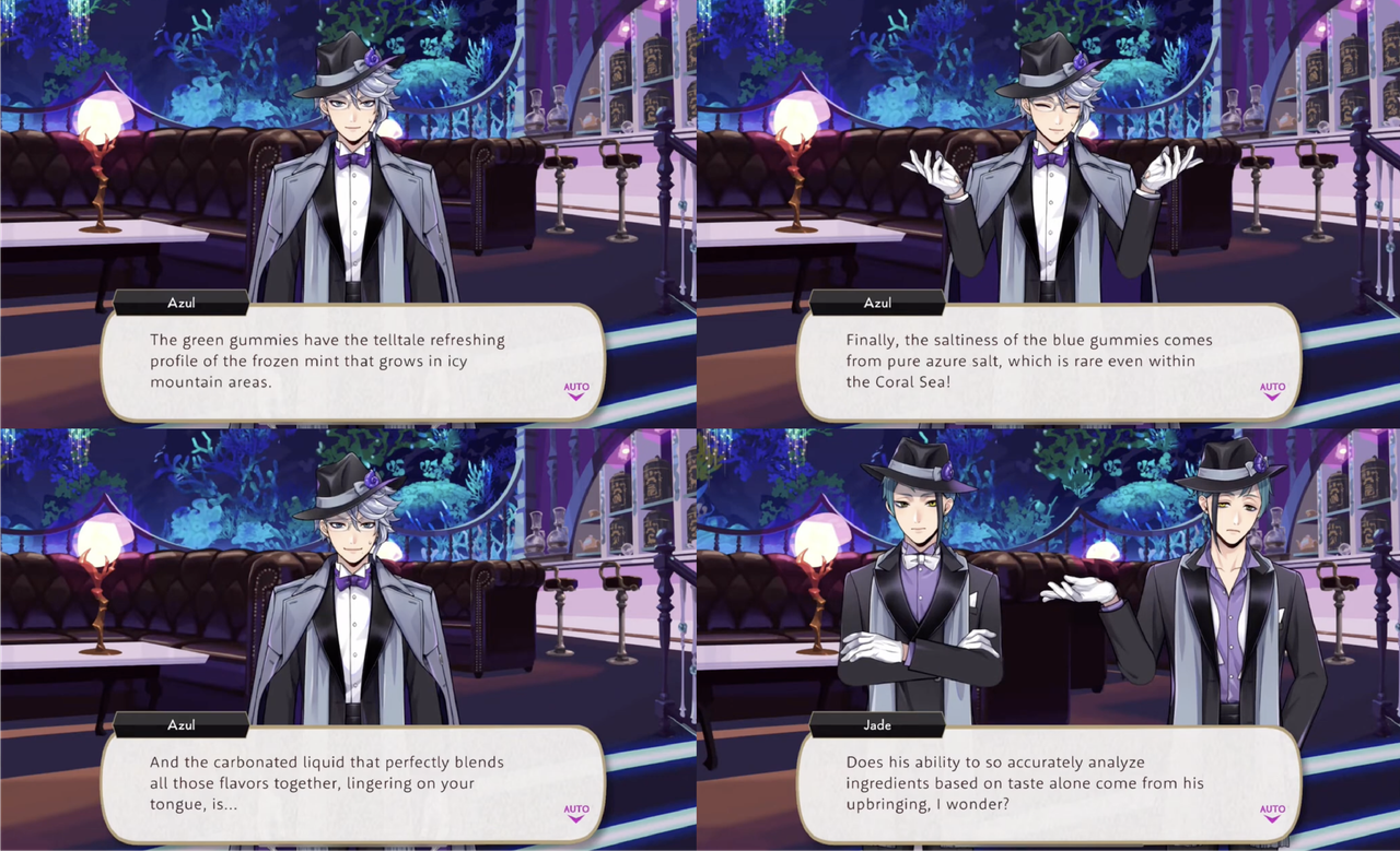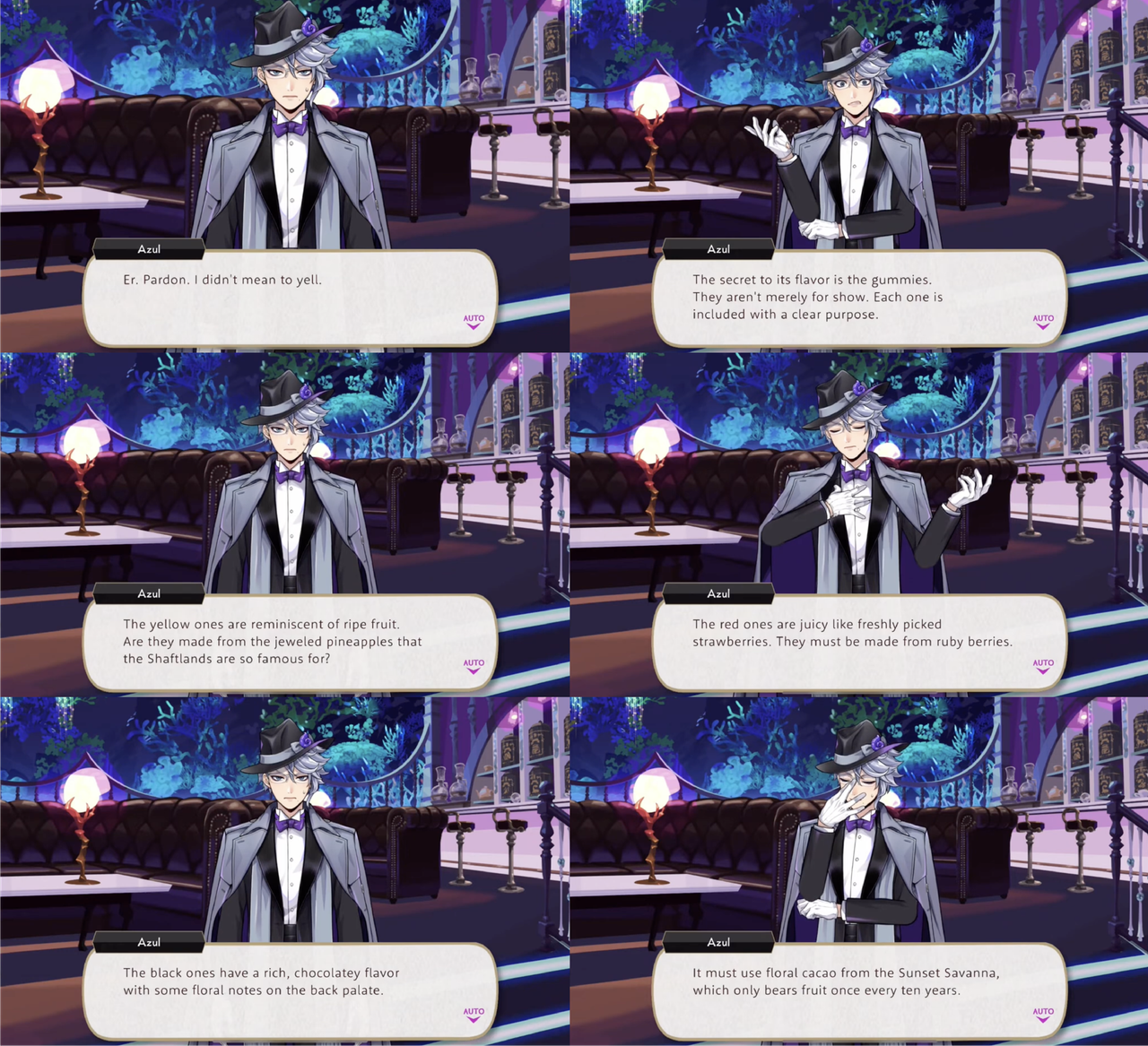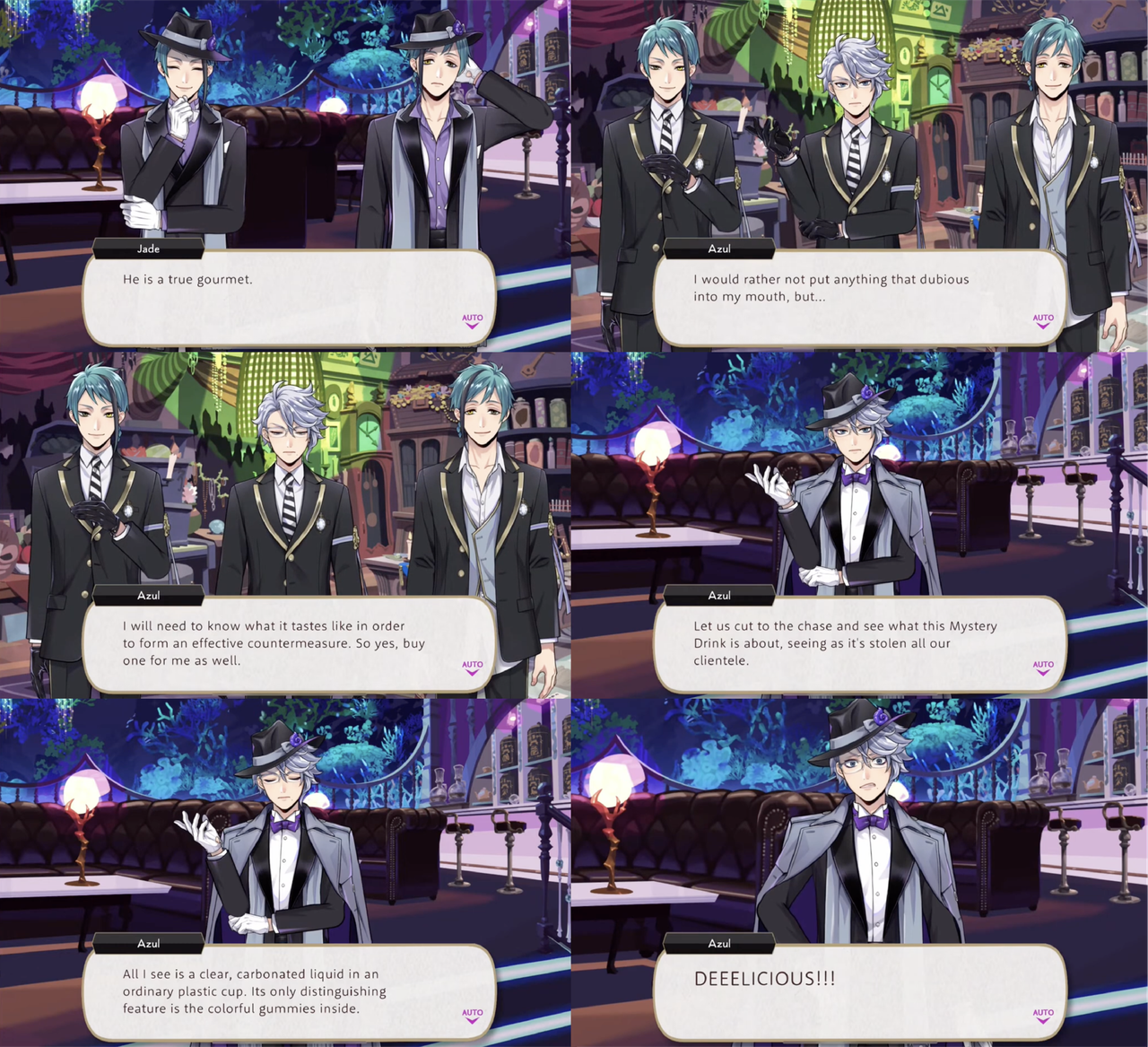 Jade describes Azul as “a true gourmet,” and our earliest example of this might be in Azul’s dorm vignette: despite not wanting to “put anything that dubious into (his) mouth,” he concedes to trying the school store’s “Mystery Drink” in order to “form an effective countermeasure.”