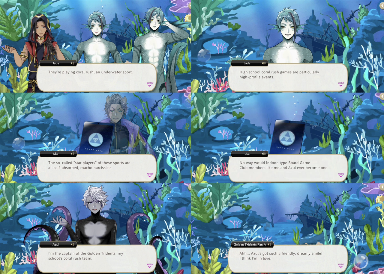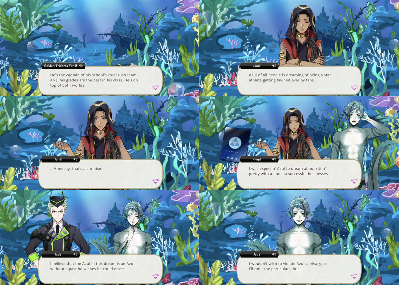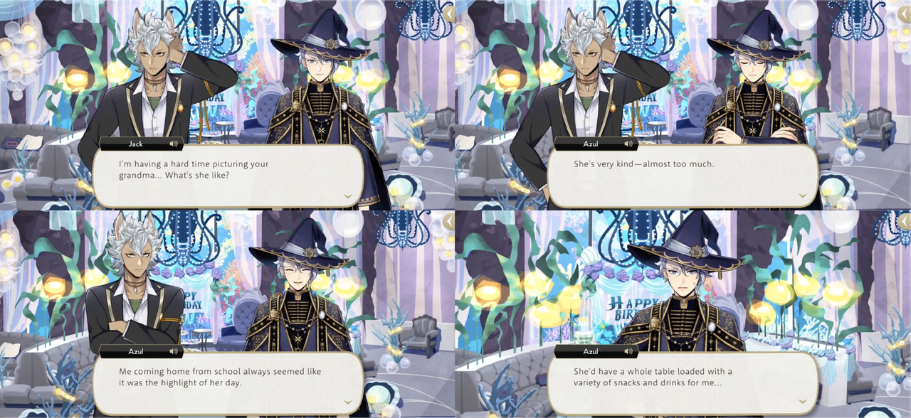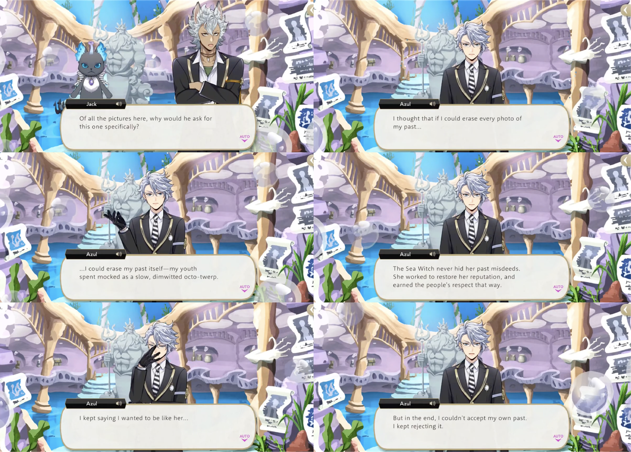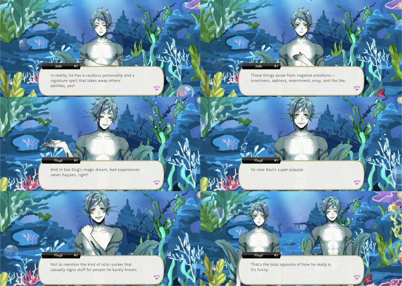 In Azul’s dream of Book 7 he surprises everyone by becoming a star player of a high school sports team, and Jade observes, “the Azul in this dream is an Azul without a past he wishes he could erase:” Azul’s “cautious personality” and unique magic were born from negative emotions (“loneliness, sadness, resentment, envy, and the like”), and without that background he became “super popular” and “the total opposite of how he really is.”