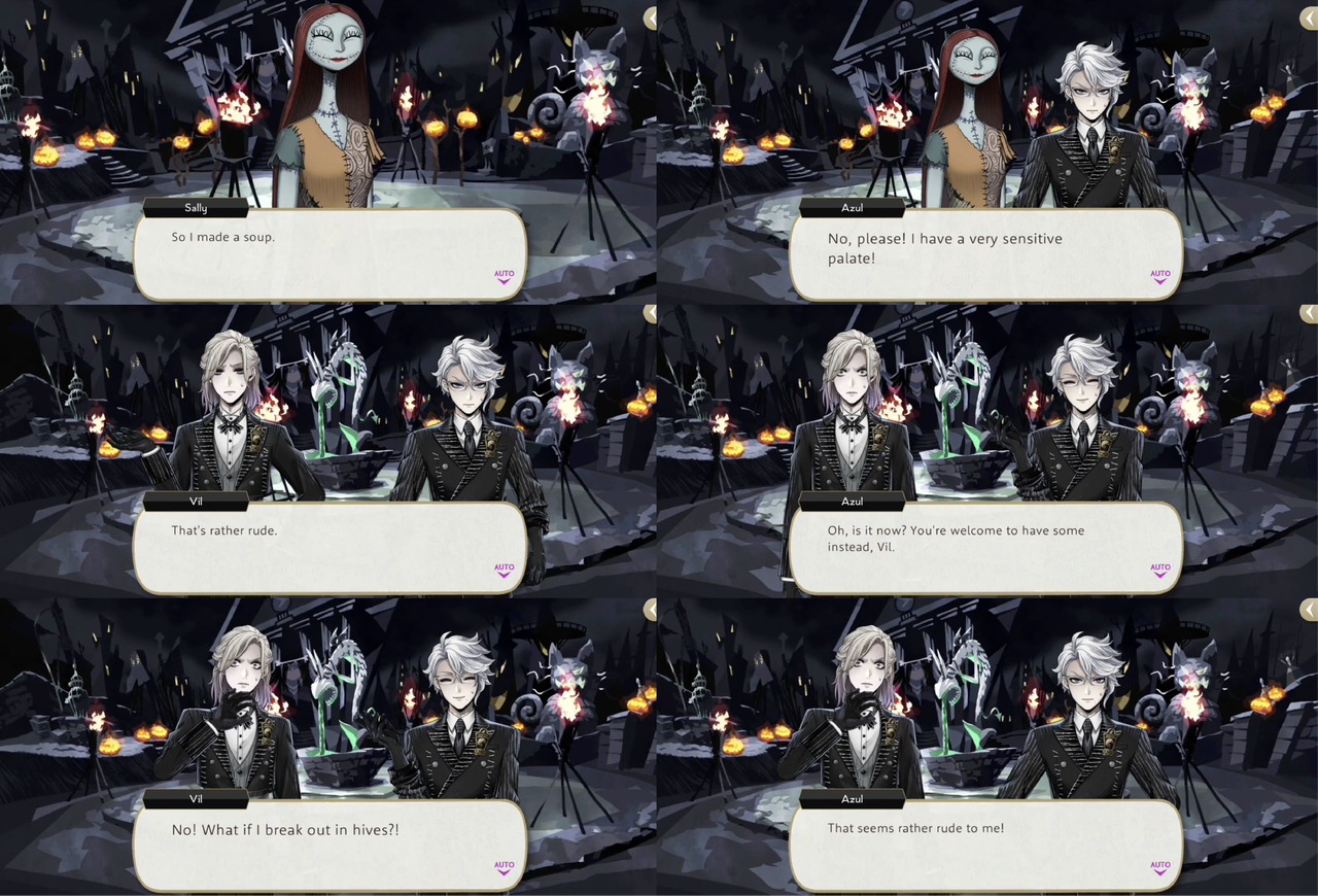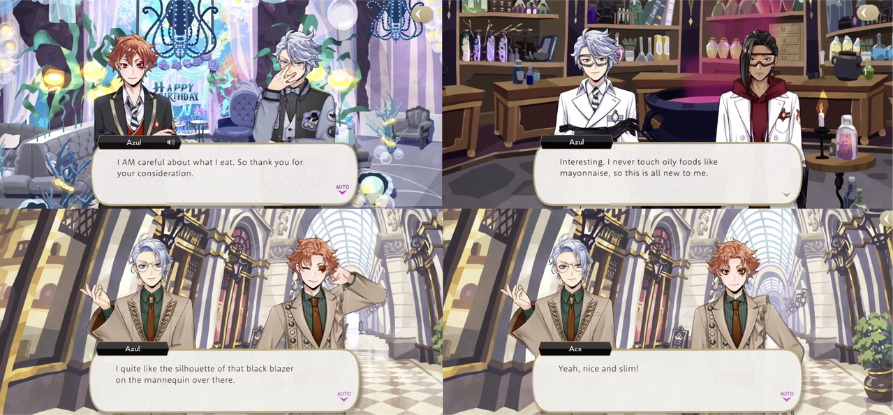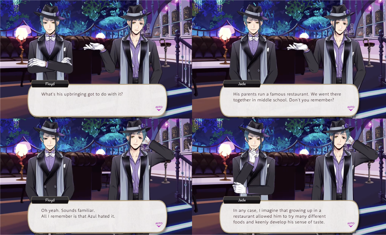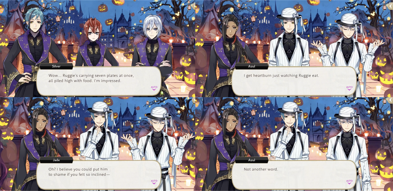 After seeing Ruggie carrying seven plates of food at NRC’s Halloween party Azul says, “I get heartburn just watching Ruggie eat.” Jade responds, “I believe you could put him to shame if you felt so inclined—“ (Azul: “Not another word.”)