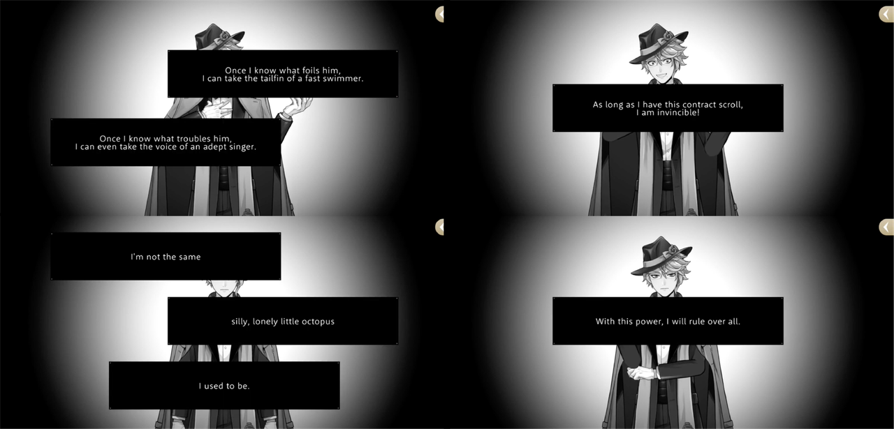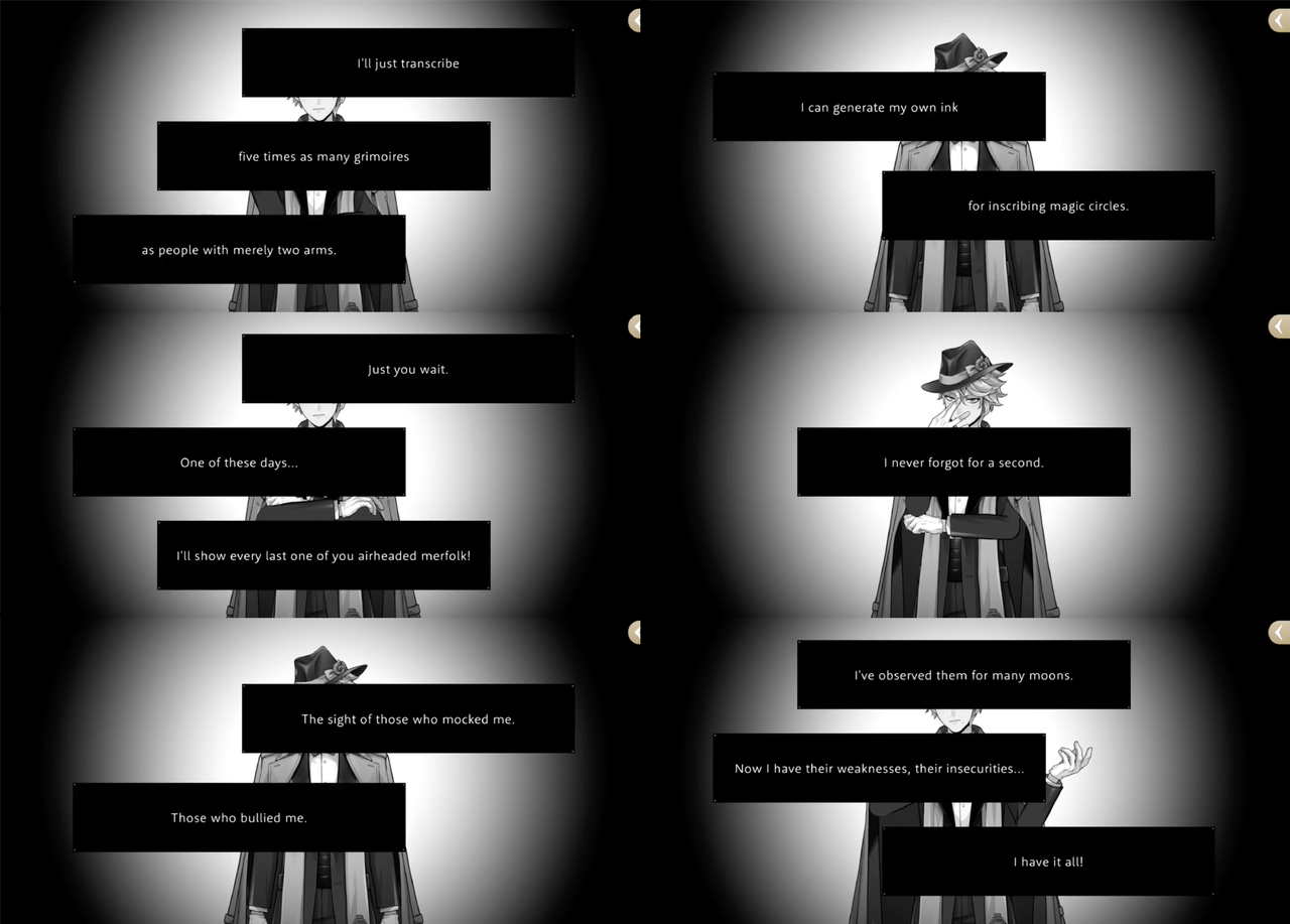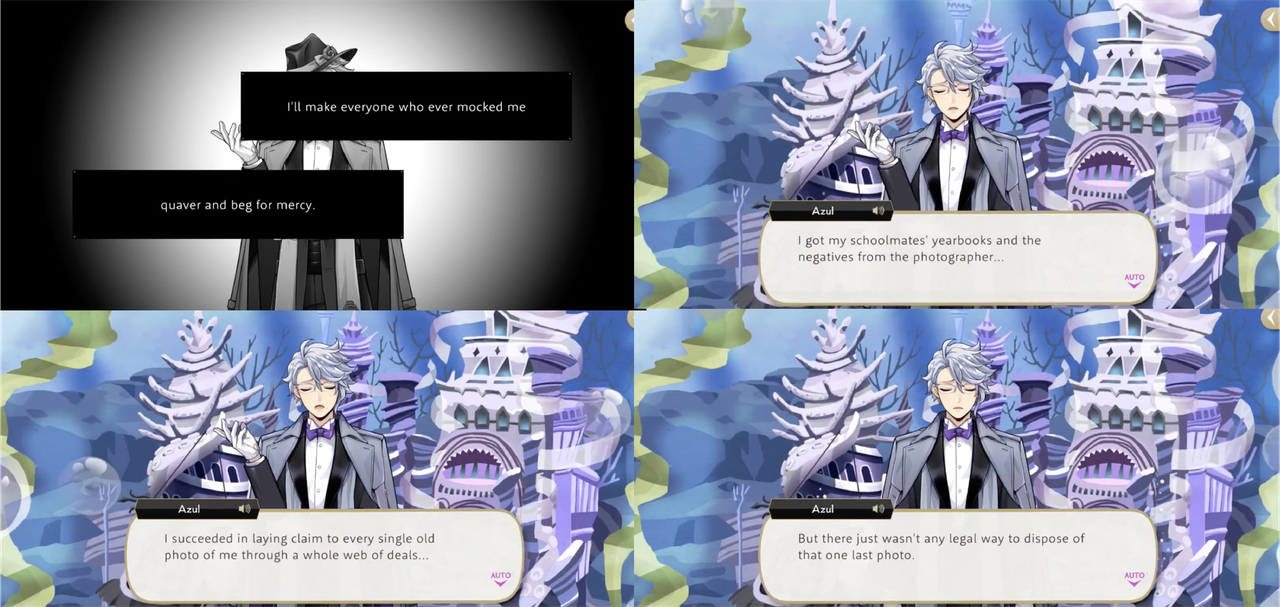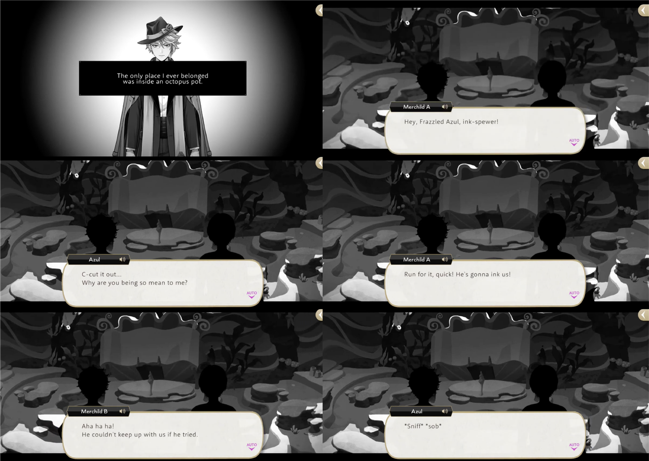 We see a flashback where mermaid children comment on child-Azul creating ink when he cries, being slow and being boring to play with. This seems to have been the catalyst in Azul becoming who he is present day: he resolves to turn his disadvantages into strengths and get revenge, saying, “I never forgot for a second the sight of those who mocked me. Those who bullied me.”