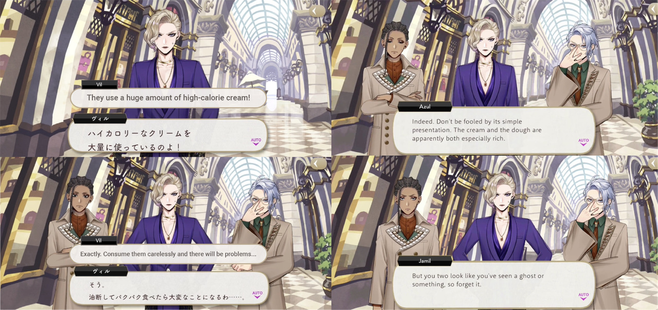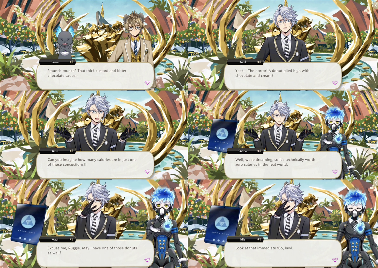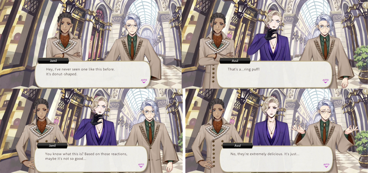 Azul overlaps with doughnuts again during Tapis Rouge, reacting strongly to a ring puff doughnut (along with Vil) due to the “huge amount of high-calorie cream.” After seeing Vil and Azul’s reactions, Jamil decides to not buy the doughnut.