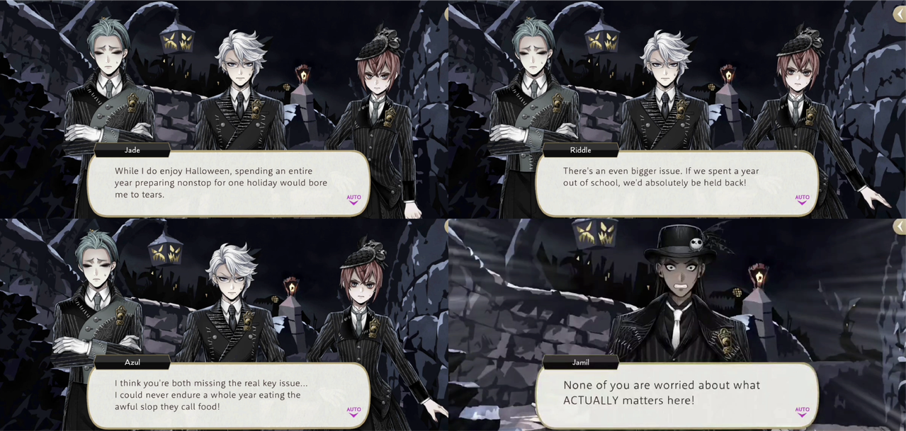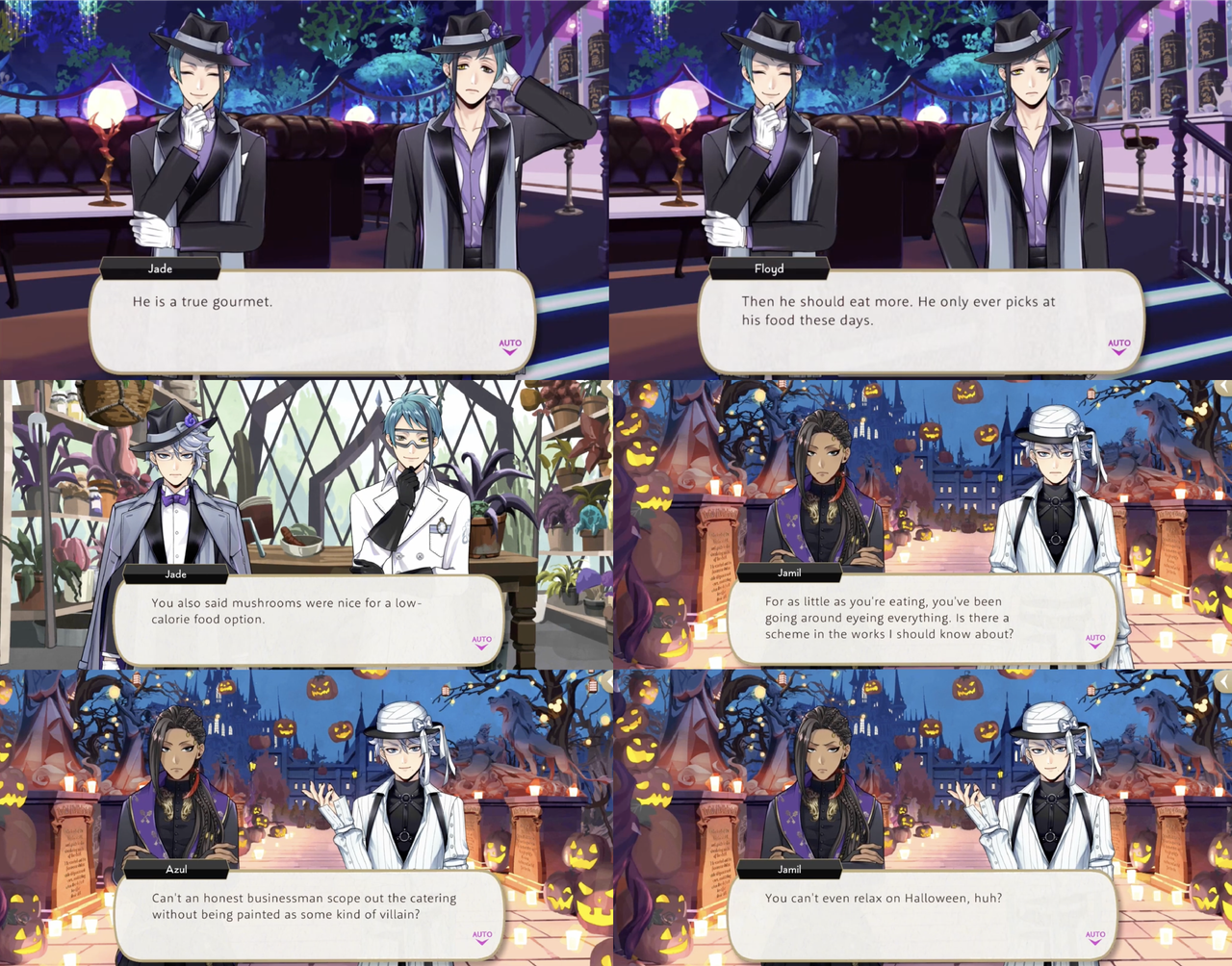 Jamil makes a similar comment during Halloween, but instead of making the connection that Azul is counting calories he seems to suspect Azul of plotting something (“For as little as you’re eating, you’ve been going around eyeing everything. Is there a scheme in the works I should know about?”).