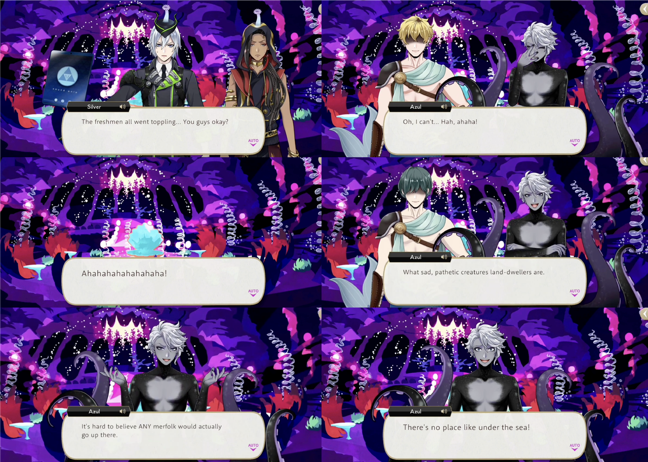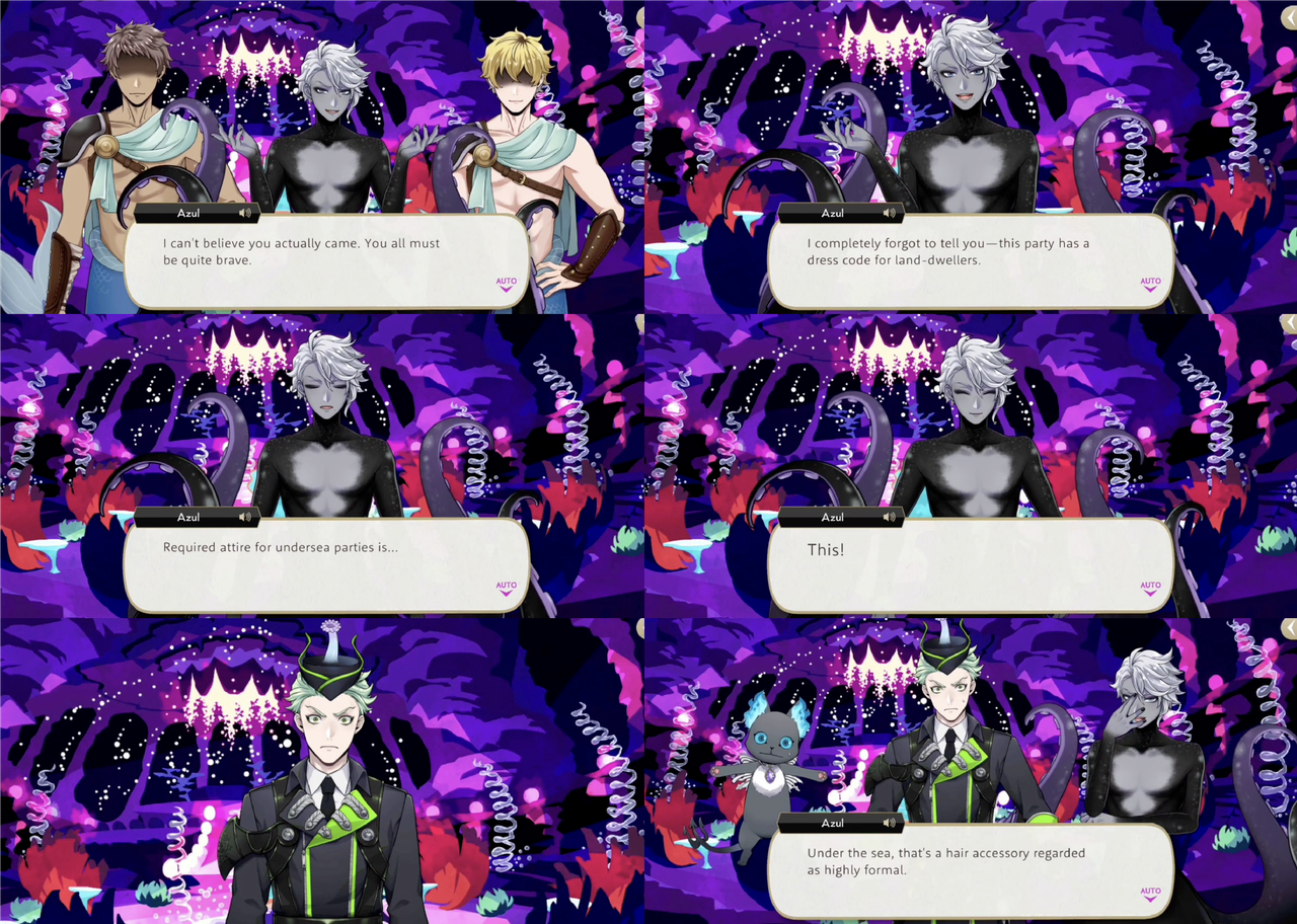 In Azul’s dream of Book 7 he invites Jade, Floyd, and the group of “land dwellers” to his mother’s restaurant, forcing the non-mermaid members to wear sea anemones on their heads in what he claims is a fashion statement (later proven to be a malicious joke).