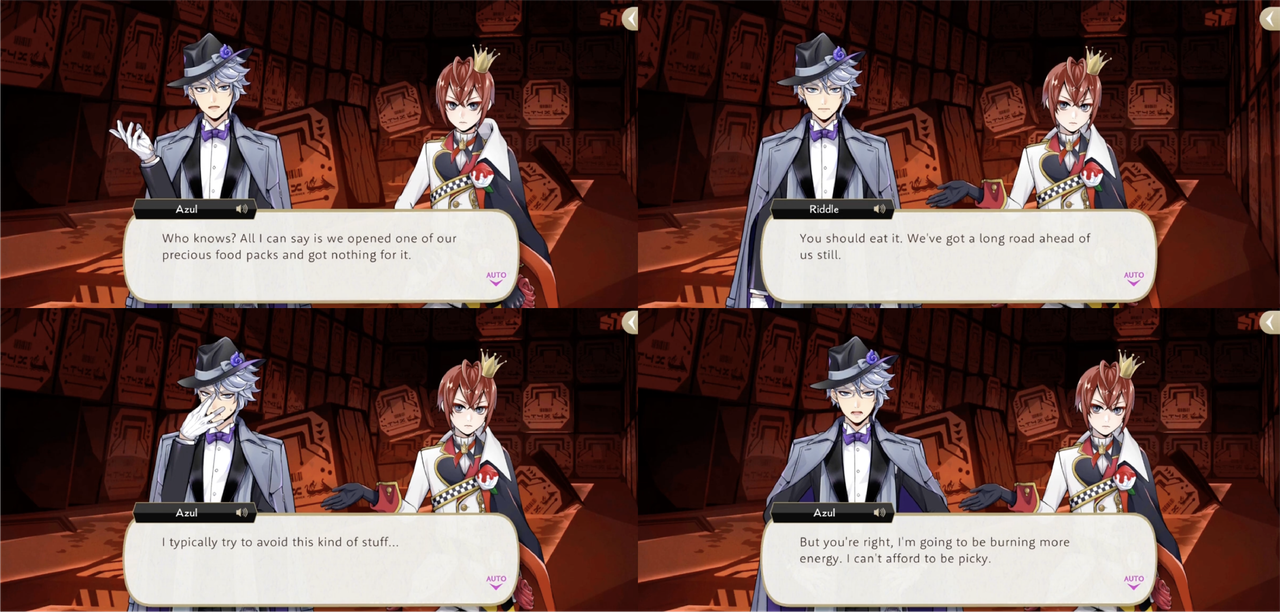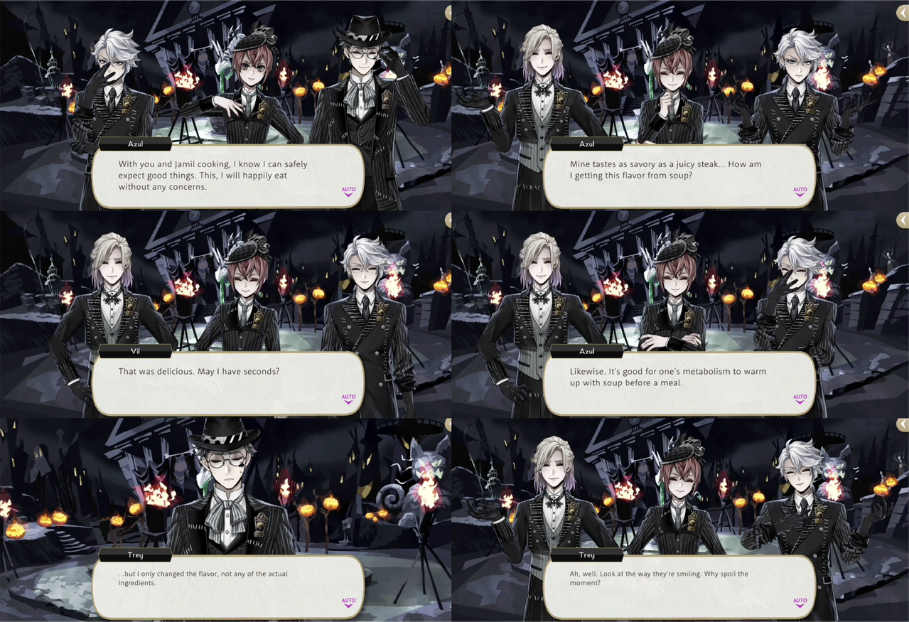 After Trey uses his unique magic on Sally’s soup during NBC, Azul follows Vil’s lead and asks for seconds, and he also eats one of the food packs they find at STYX in between battles in Tartarus (“I typically try to avoid this kind of stuff…but you’re right, I’m going to be burning more energy. I can’t afford to be picky.”)