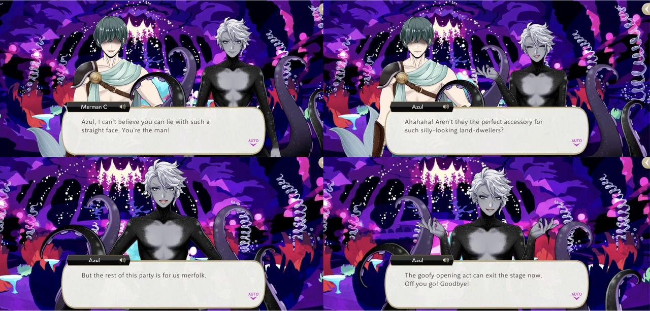 After the first-year students are invited to dance and fall over themselves Azul joins other mermaids in laughing at them, calling them “sad, pathetic creatures,” having himself become one of the bullies he hates.