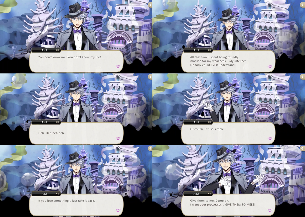 An overblotting Azul decides to protect himself from his own past by forcibly draining power from those around him (“I’m going to revert back to my old self if I don’t act now!”).