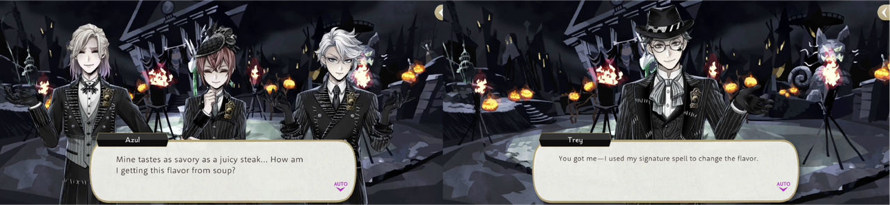 After Trey uses his unique magic on Sally’s soup during NBC, Azul follows Vil’s lead and asks for seconds, and he also eats one of the food packs they find at STYX in between battles in Tartarus (“I typically try to avoid this kind of stuff…but you’re right, I’m going to be burning more energy. I can’t afford to be picky.”)