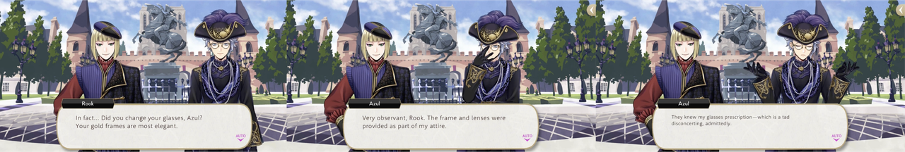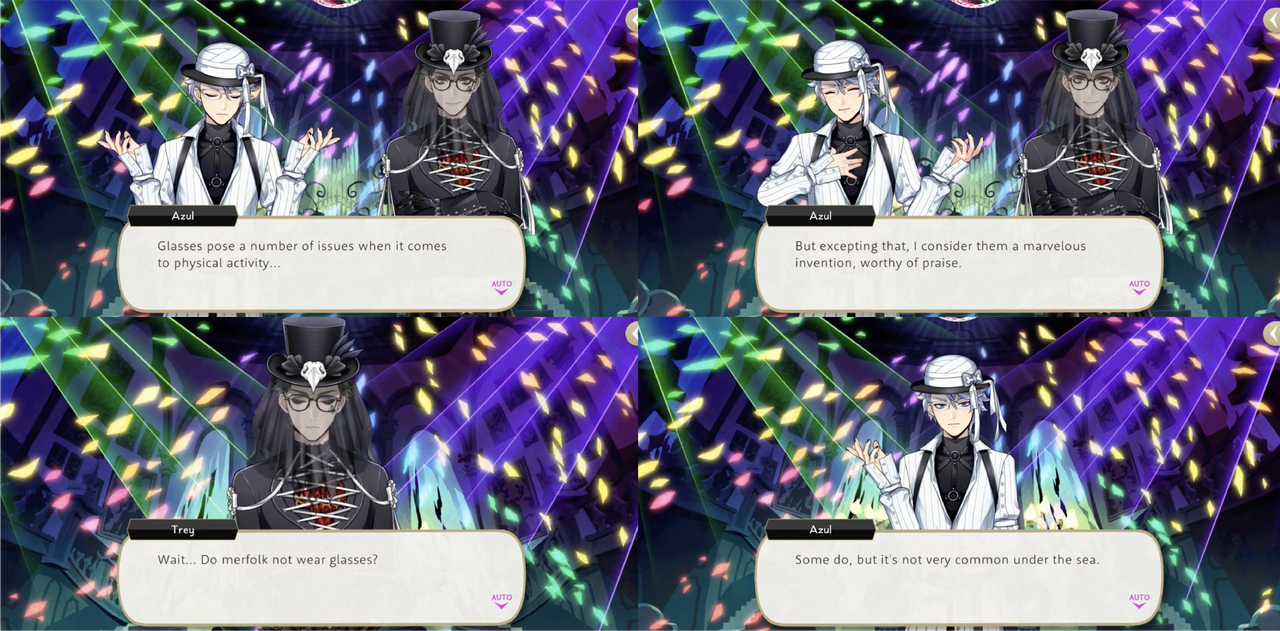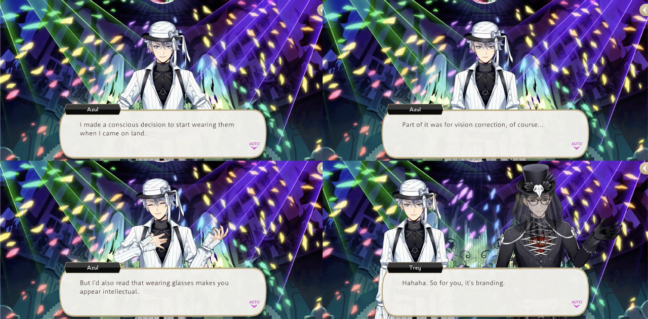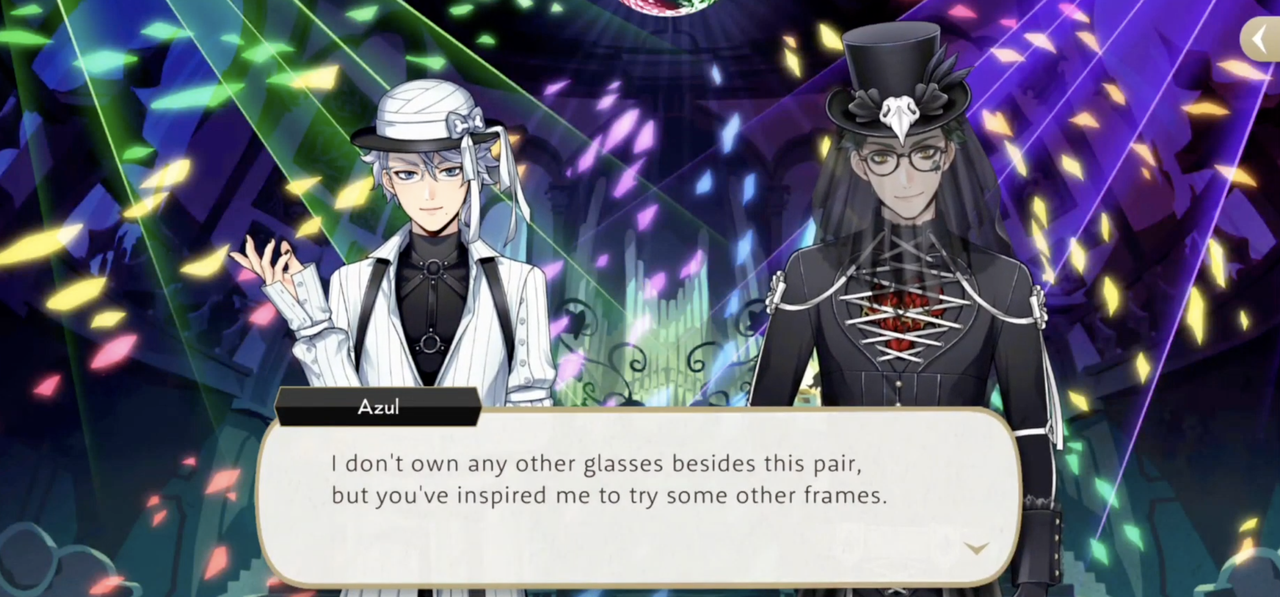 Azul says that he owns only one pair of glasses, though his labwear goggles are also prescription, and the glasses he wears during Glorious Masquerade were provided to him by Noble Bell College (“They knew my glasses prescription—which is a tad disconcerting, admittedly.”)