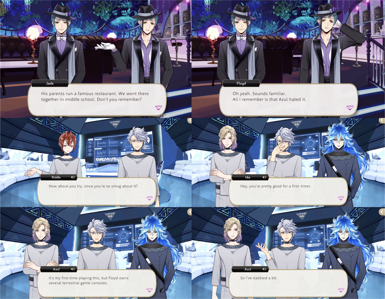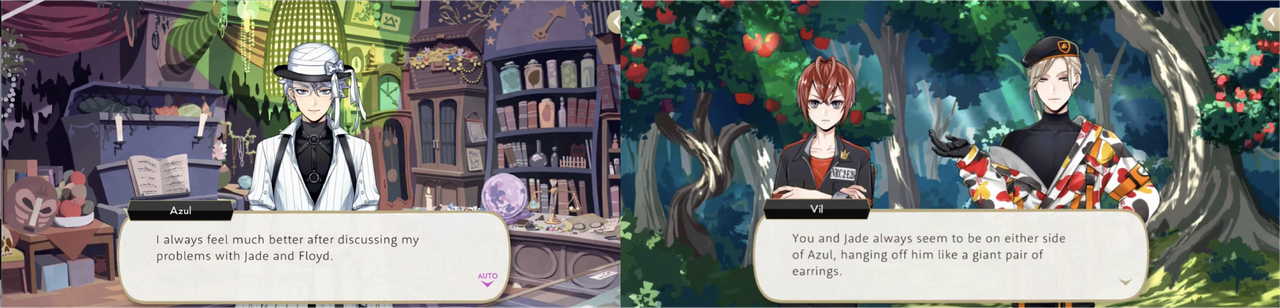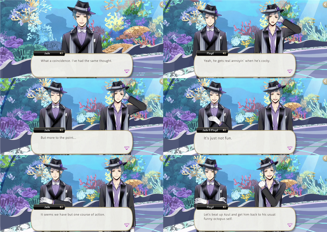 Azul tells Silver, “I always feel much better after discussing my problems with Jade and Floyd,” and Vil tells Floyd, “You and Jade always seem to be on either side of Azul, hanging off him like a giant pair of earrings.”