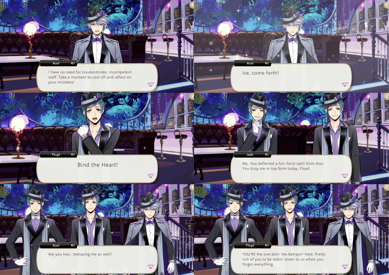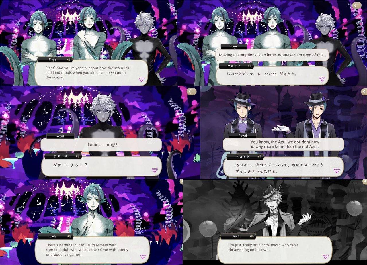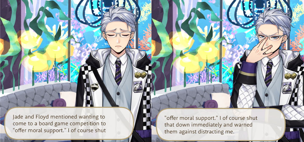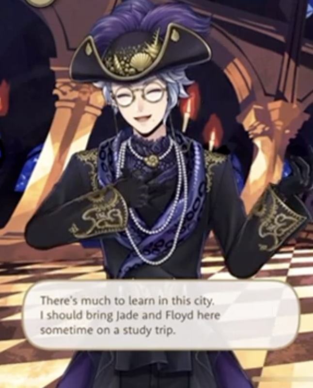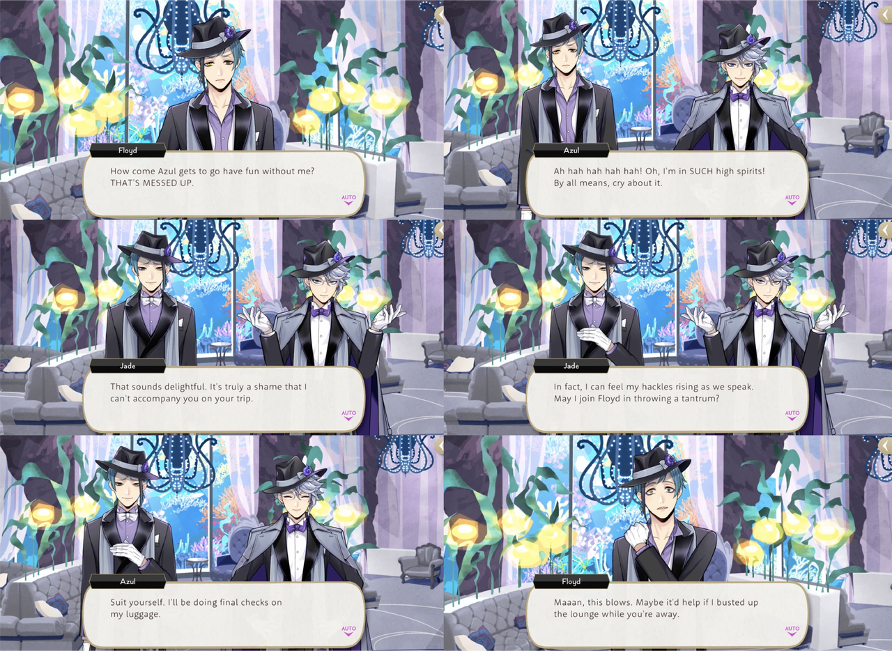 Floyd is not pleased by Azul alone being selected for the Glorious Masquerade event (“How come Azul gets to go have fun without me?”), to which Azul responds, “By all means, cry about it.” Jade asks if he may join Floyd in throwing a tantrum and Azul approves, but he intervenes when Floyd threatens to do damage to the lounge, telling him “You had better do your job” and promising to bring back entertaining stories.