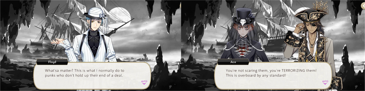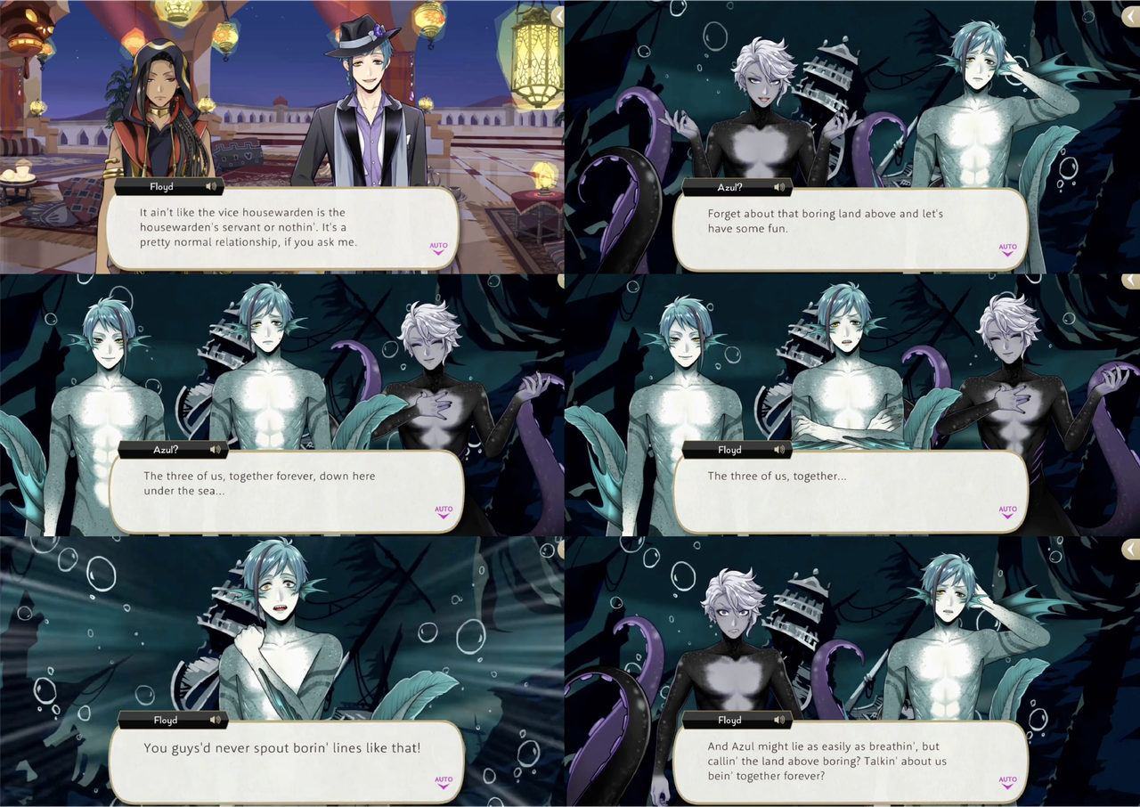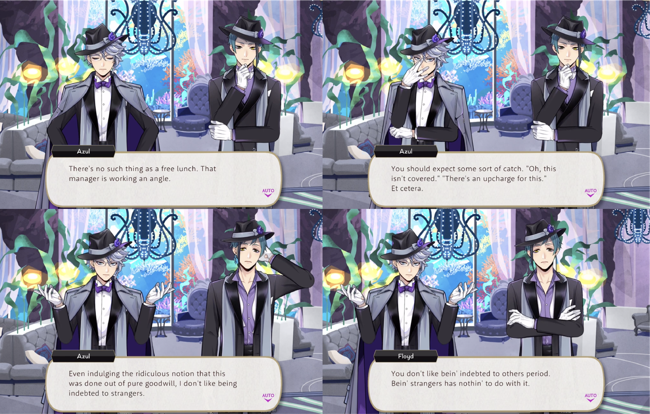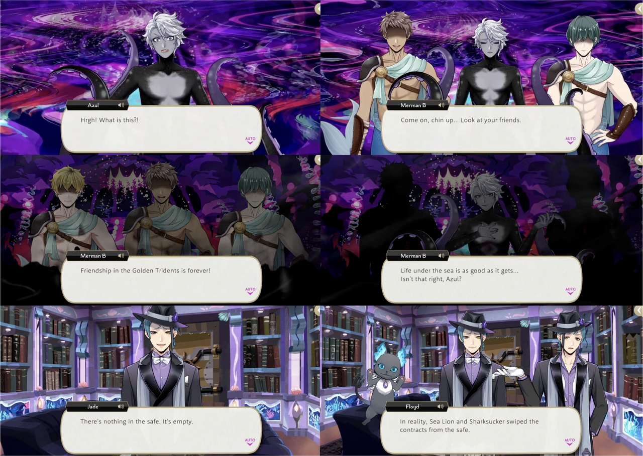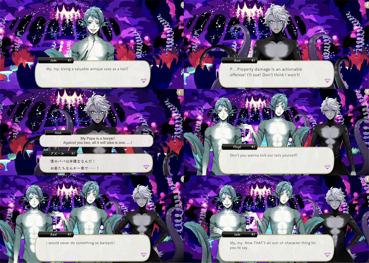 Floyd is not pleased by Azul alone being selected for the Glorious Masquerade event (“How come Azul gets to go have fun without me?”), to which Azul responds, “By all means, cry about it.” Jade asks if he may join Floyd in throwing a tantrum and Azul approves, but he intervenes when Floyd threatens to do damage to the lounge, telling him “You had better do your job” and promising to bring back entertaining stories.