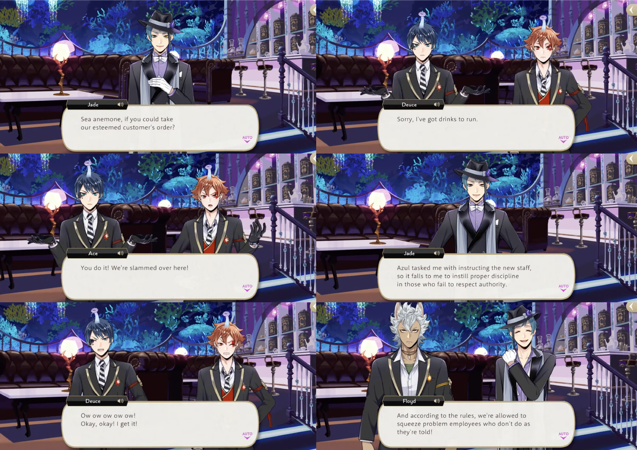 Azul describes Jade and Floyd both as “Octavinelle’s upper management,” and in Book 3 charges Jade (and possibly Floyd) with training his 225 new anemone’d staff. They say that they cook and clean at Mostro Lounge, and they also run the lounge in Azul’s absence during Book 6.