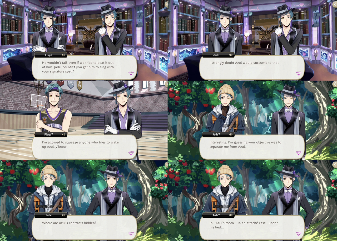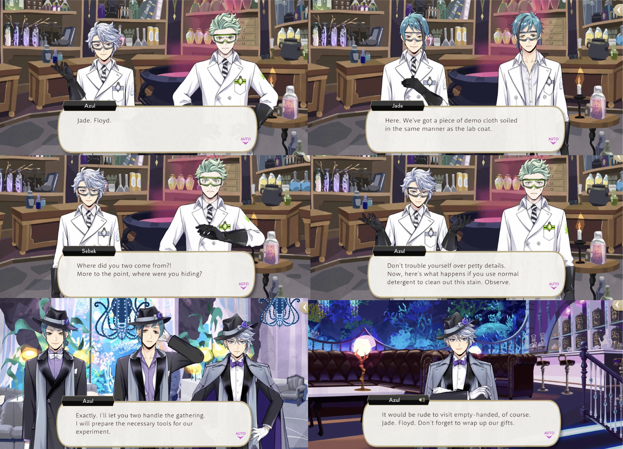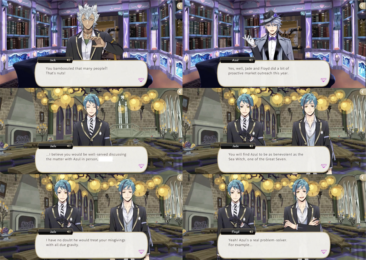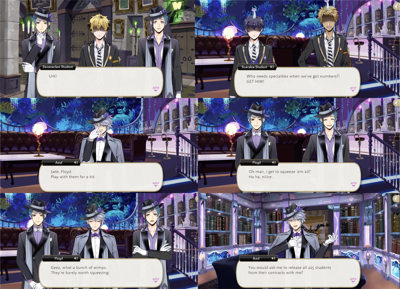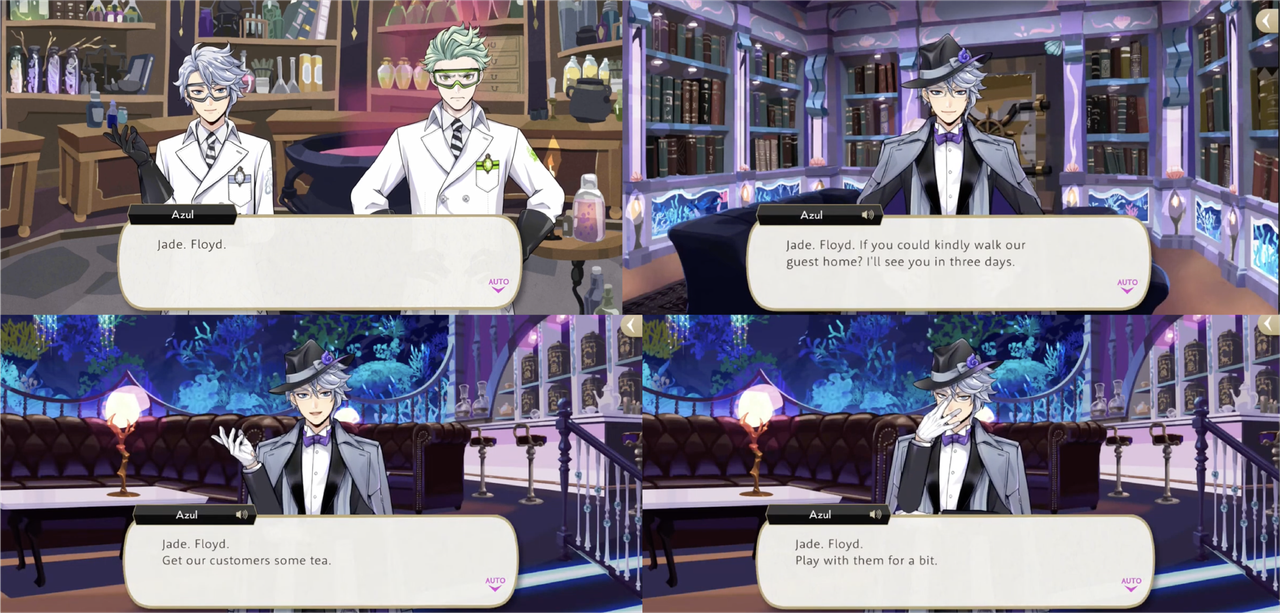 Throughout the game Azul is seen entrusting various tasks to the twins, including but not limited to gathering things he needs to fulfill contracts, seeing to unruly guests, preparing a gift for a visit, leading the students of Ocatvinelle to safety during Book 7, and trouncing opponents, including Malleus.