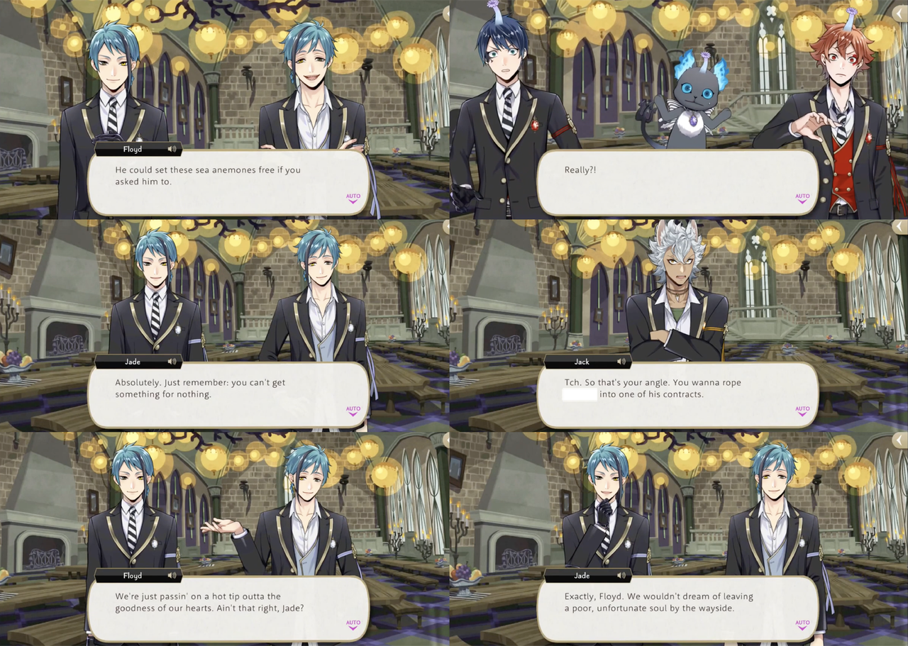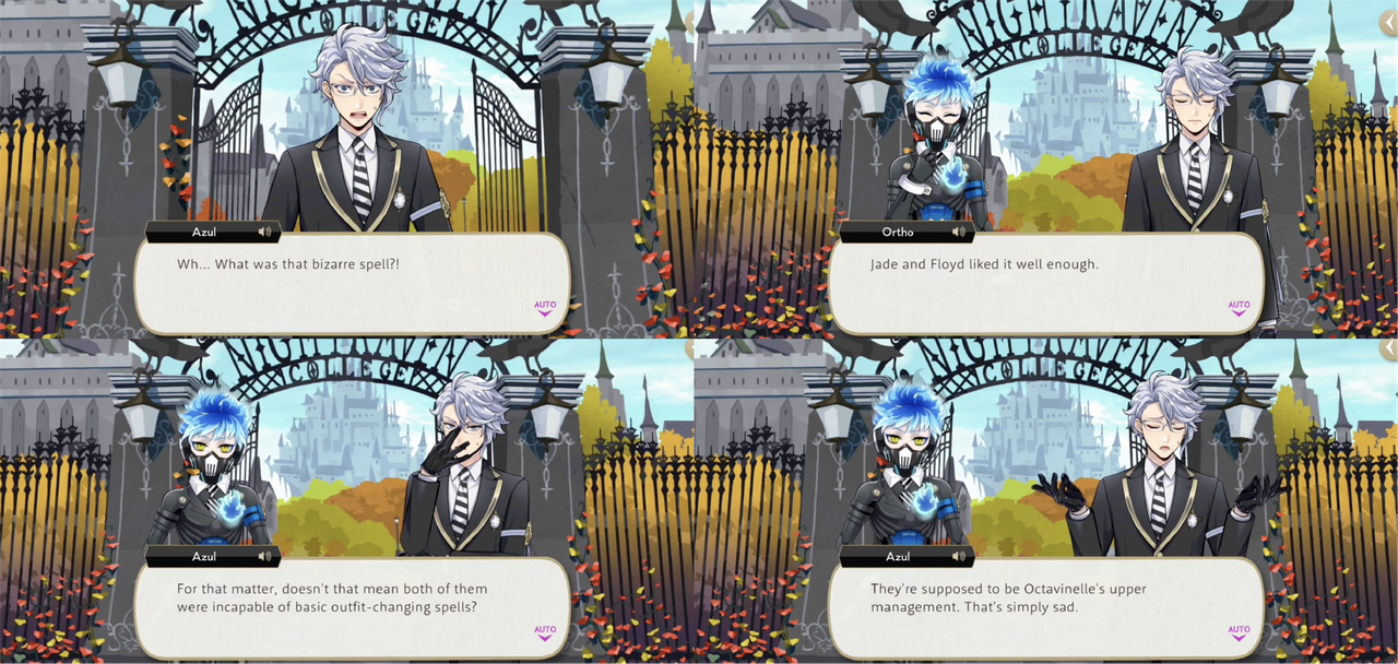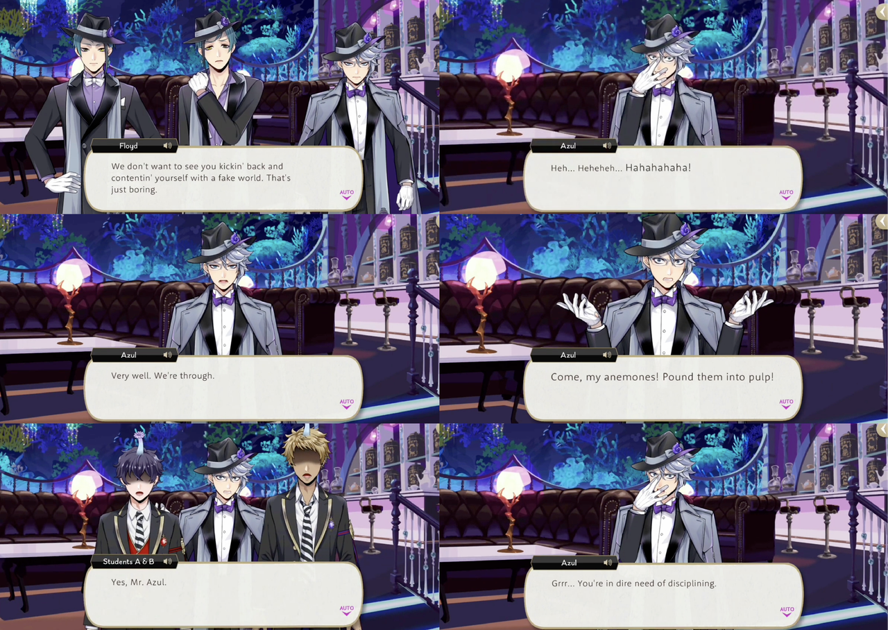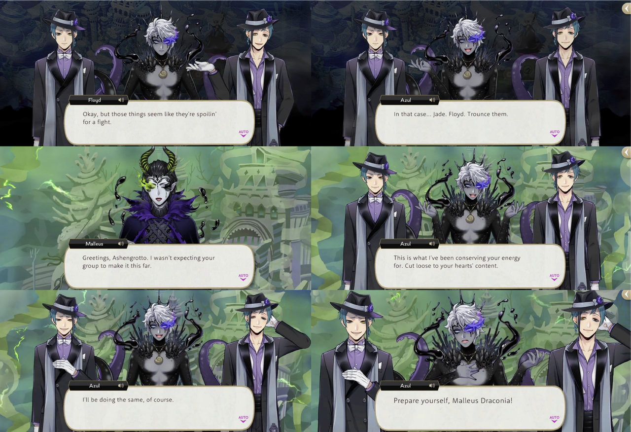 Throughout the game Azul is seen entrusting various tasks to the twins, including but not limited to gathering things he needs to fulfill contracts, seeing to unruly guests, preparing a gift for a visit, leading the students of Ocatvinelle to safety during Book 7, and trouncing opponents, including Malleus.