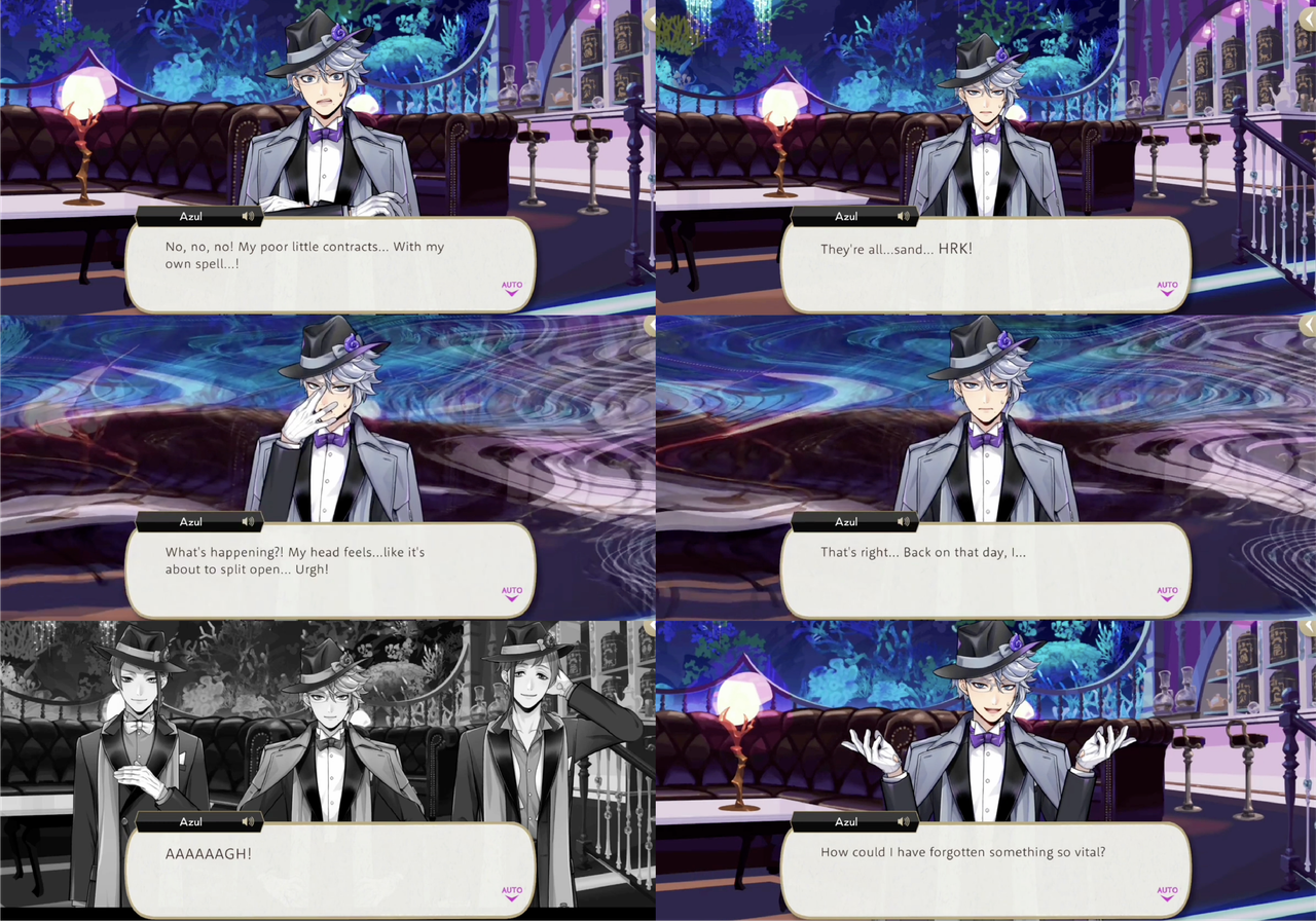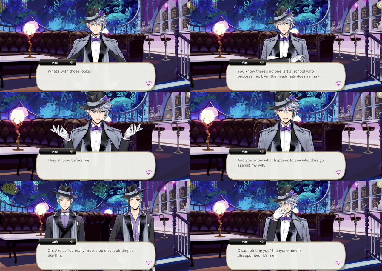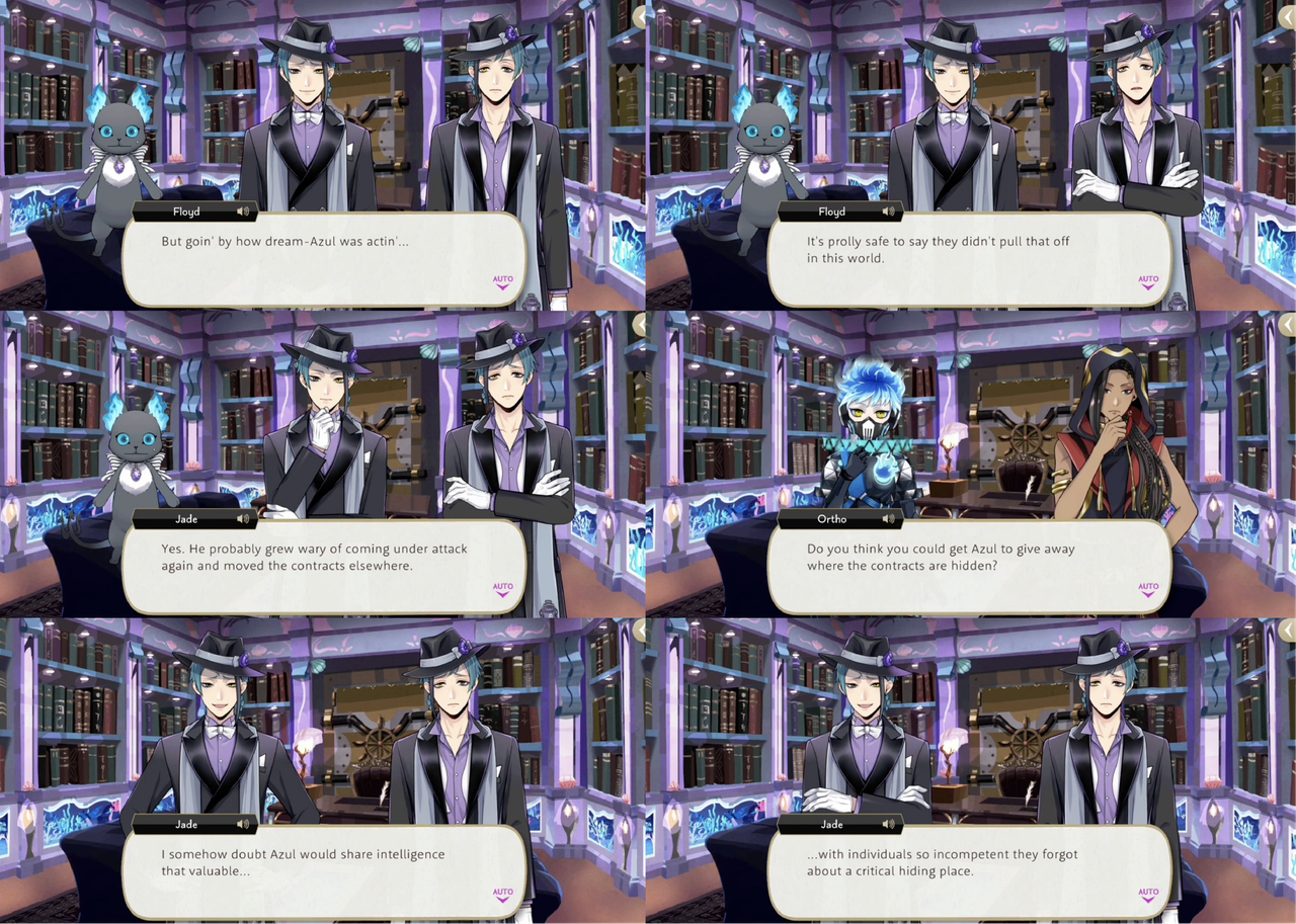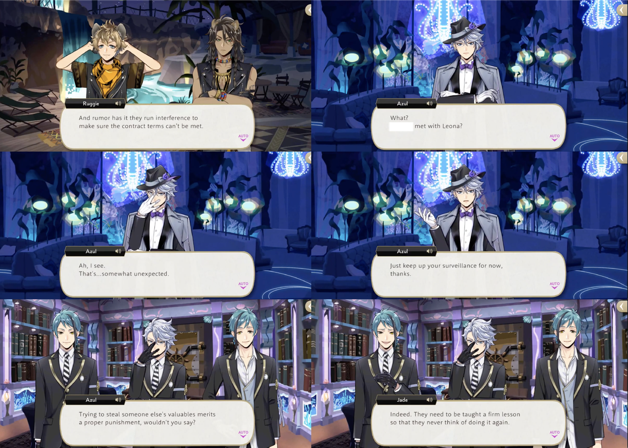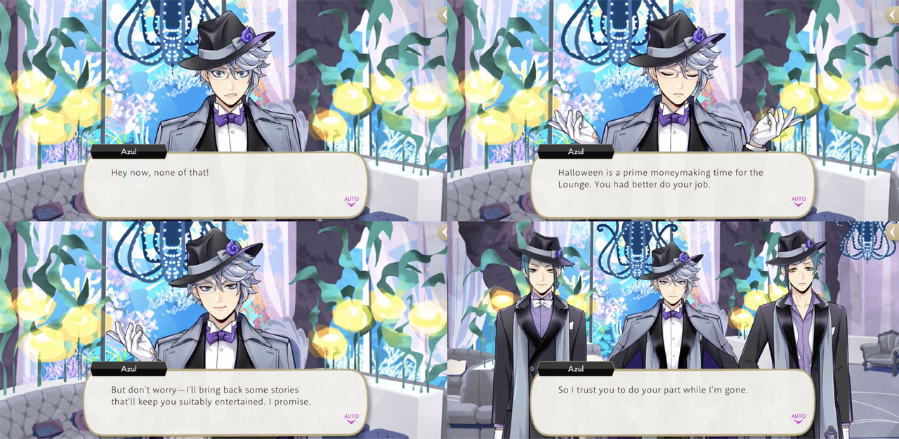 Throughout the game Azul is seen entrusting various tasks to the twins, including but not limited to gathering things he needs to fulfill contracts, seeing to unruly guests, preparing a gift for a visit, leading the students of Ocatvinelle to safety during Book 7, and trouncing opponents, including Malleus.