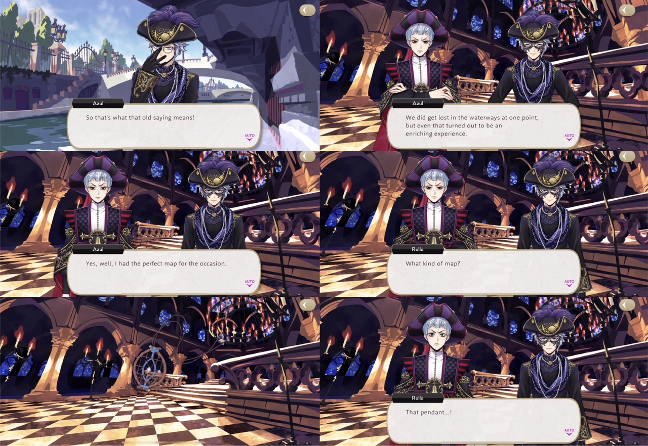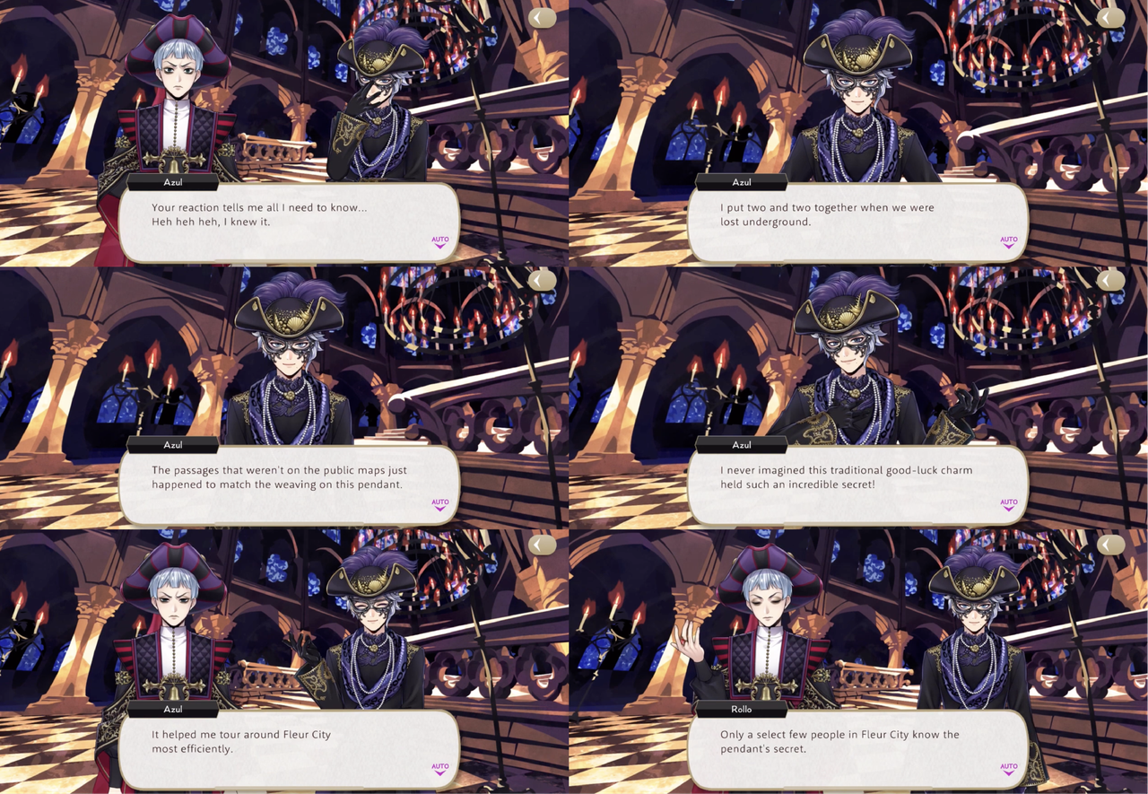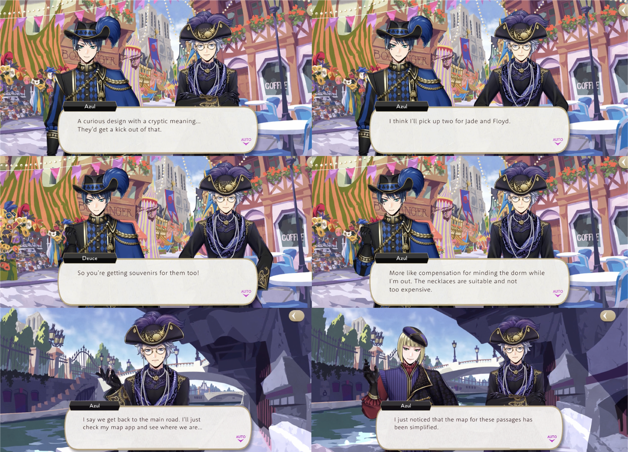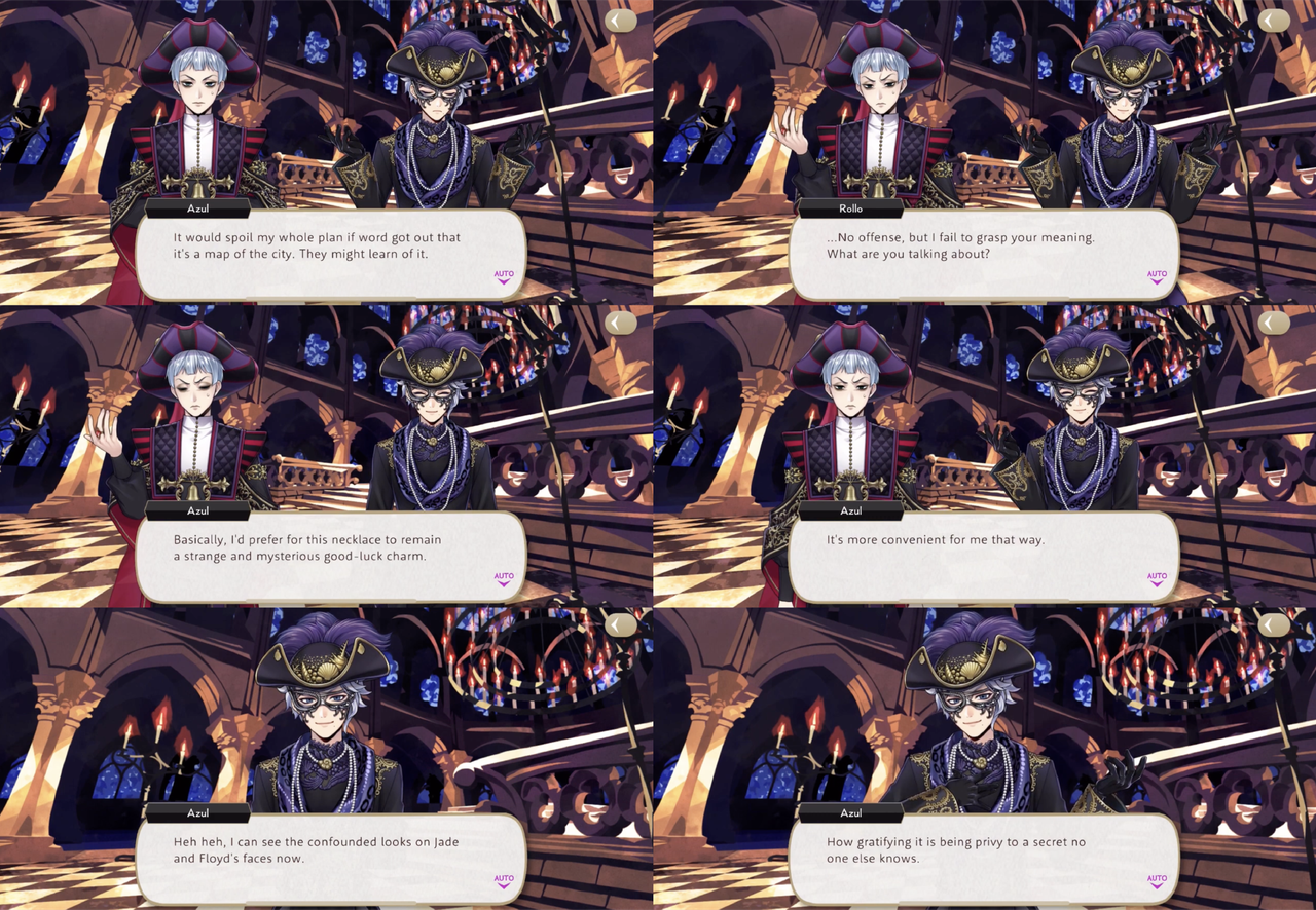 Azul picks up a pair of necklaces with “a curious design with a cryptic meaning” during the Glorious Masquerade event, but when Deuce asks if they are souvenirs Azul says, “More like compensation for minding the dorm while I’m out. The necklaces are suitable and not too expensive.”