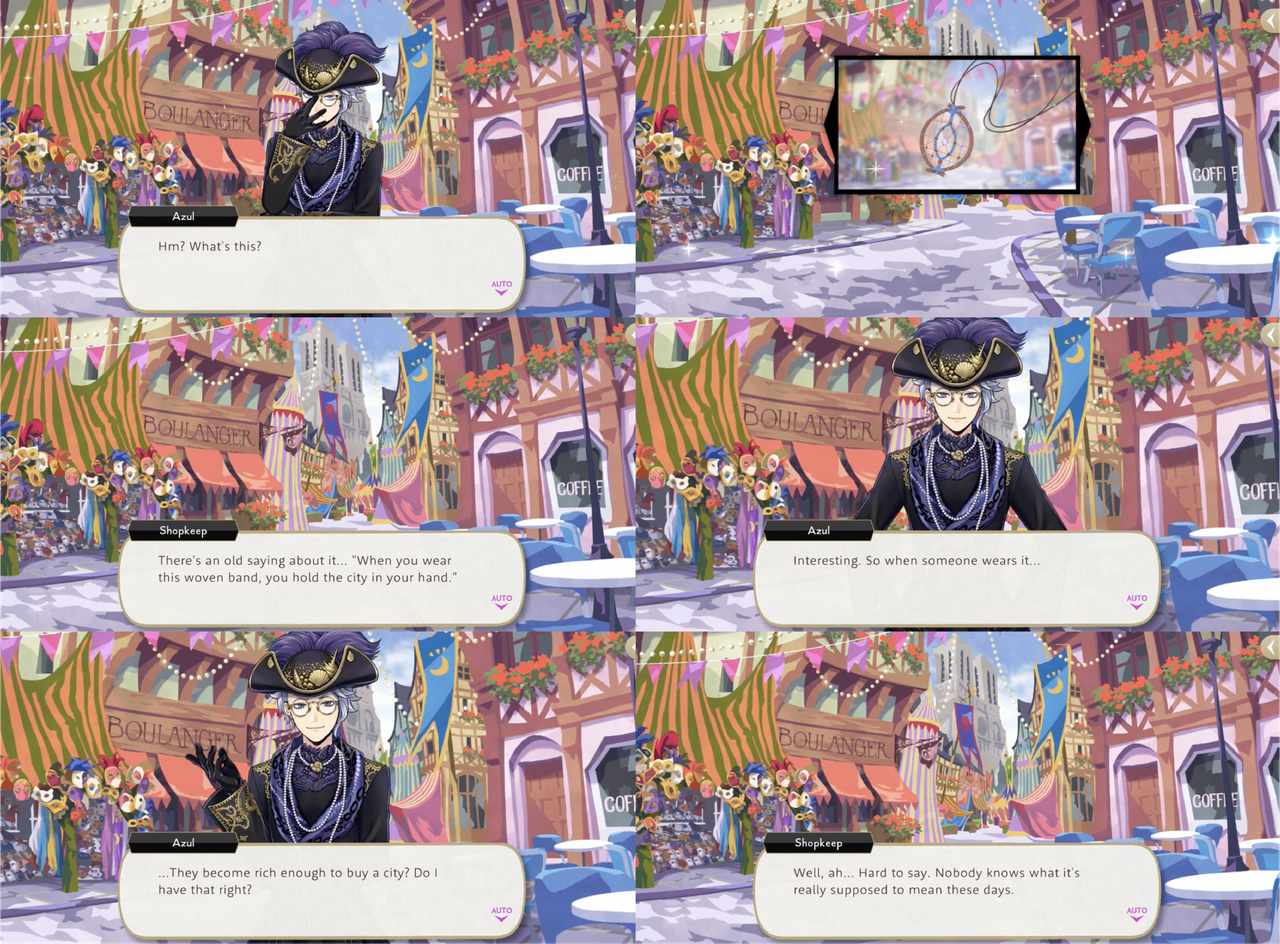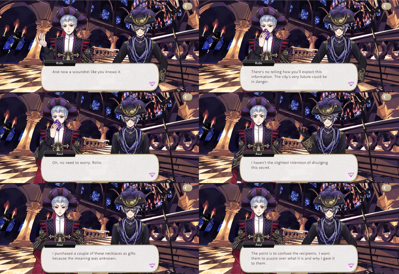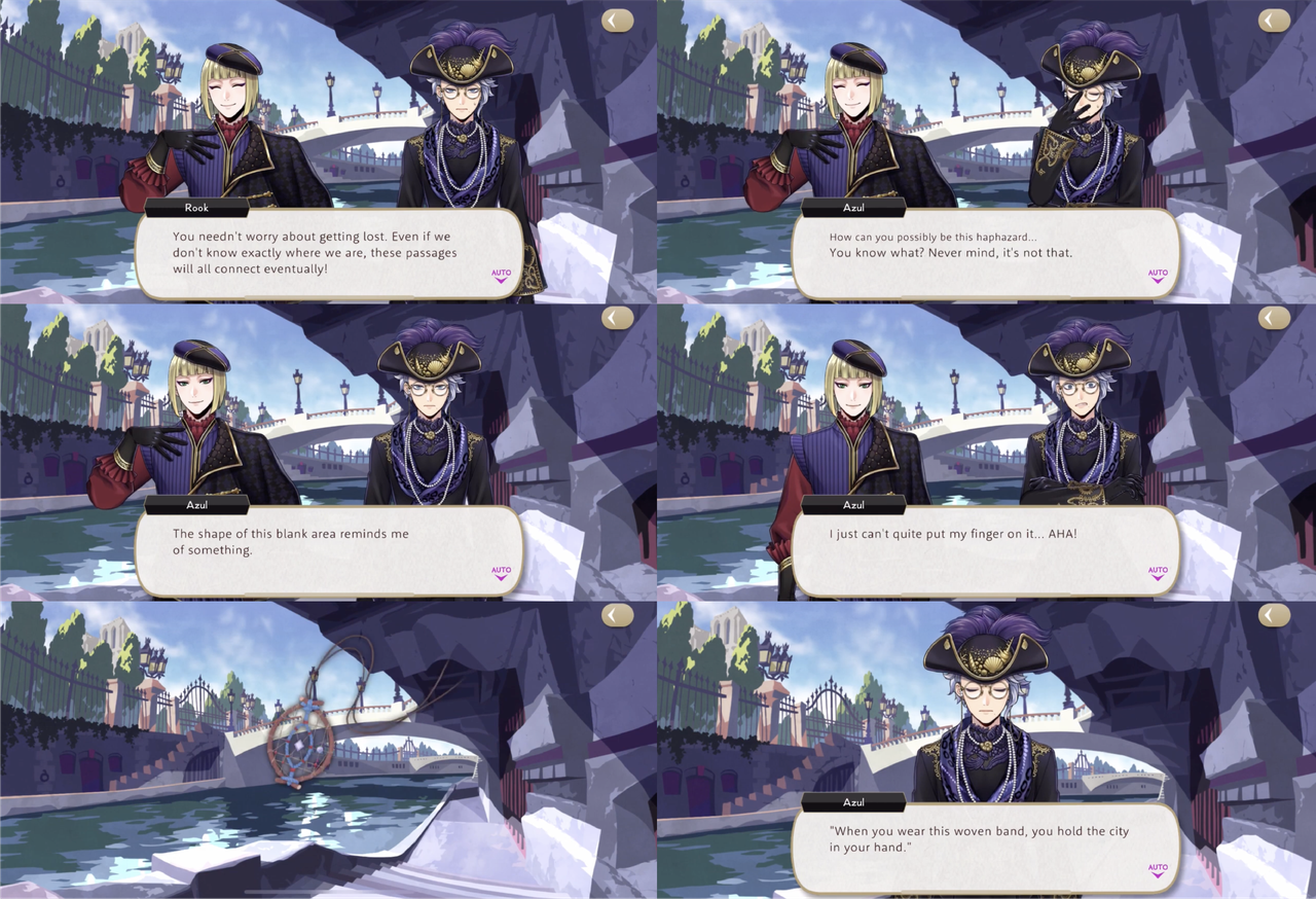 Azul picks up a pair of necklaces with “a curious design with a cryptic meaning” during the Glorious Masquerade event, but when Deuce asks if they are souvenirs Azul says, “More like compensation for minding the dorm while I’m out. The necklaces are suitable and not too expensive.”