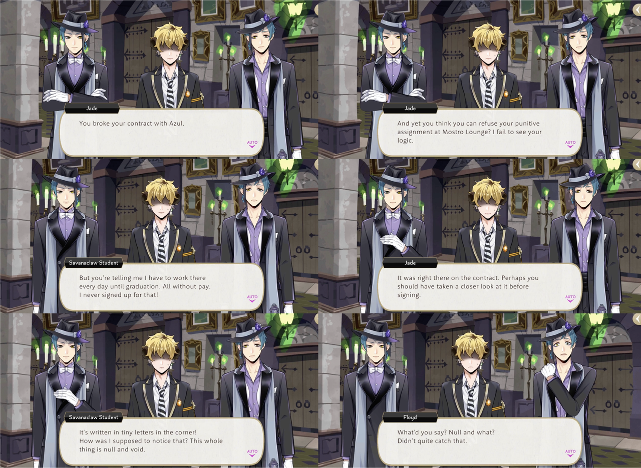 Azul also has the twins seize Ramshackle Dorm as collateral, interfere with Jack’s group’s ability to fulfill their contract, keep surveillance on their movements, and punish the group for trying to destroy a contract, all of which are possibly activities that Jade and Floyd are accustomed to performing for Azul.