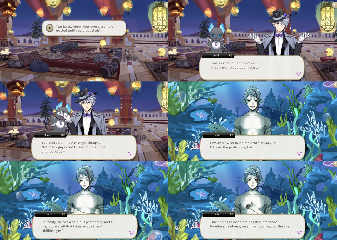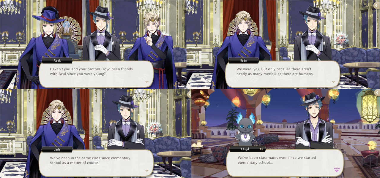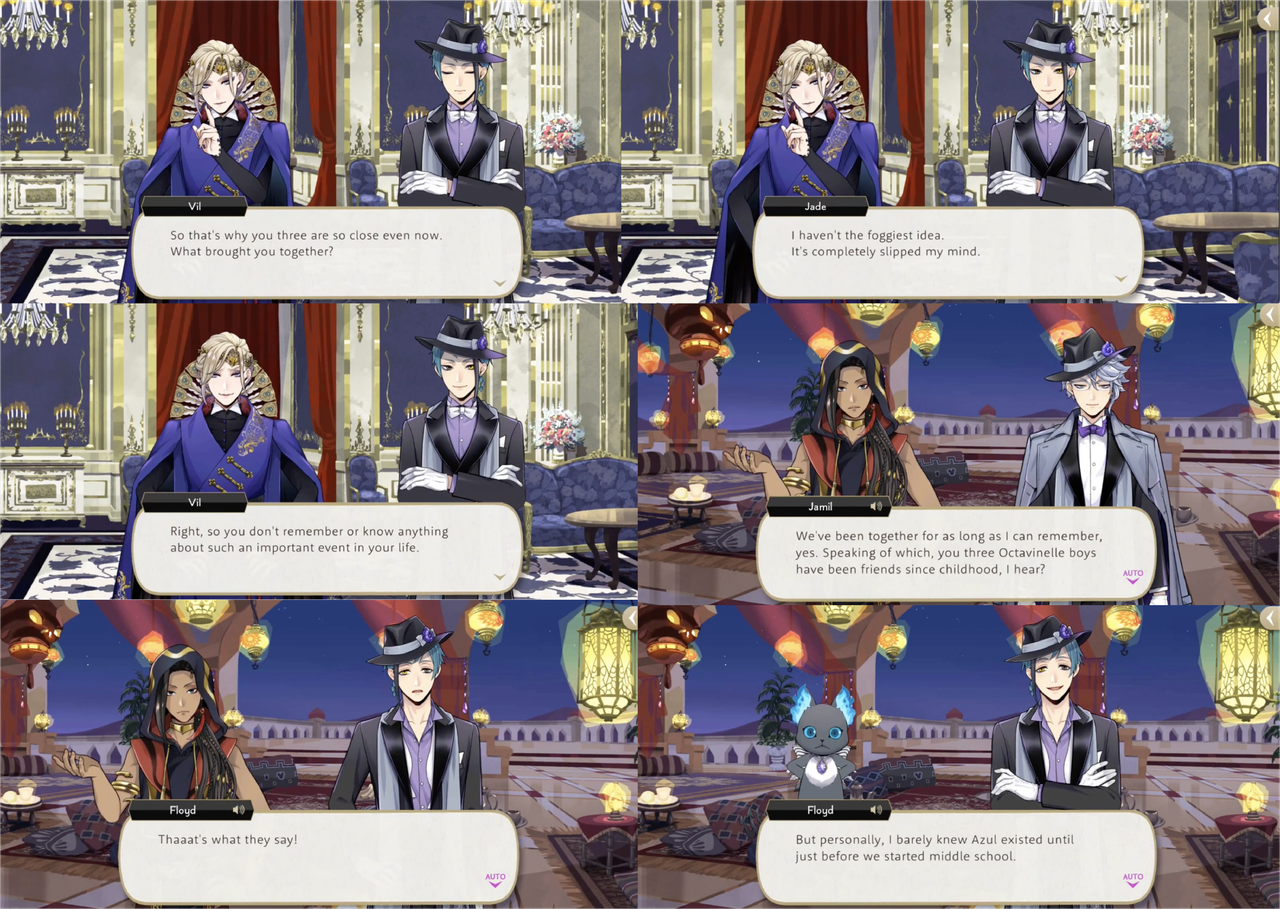 When Jamil asks about the three being together since childhood Floyd is similarly vague, saying that he “barely knew Azul existed until just before (they) started middle school.” The prefect seems unconvinced (“You barely knew your own classmate existed until you graduated?”).