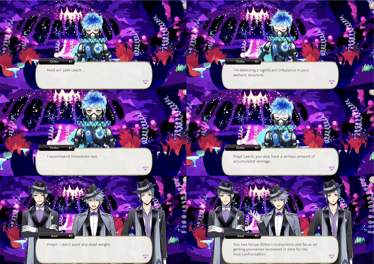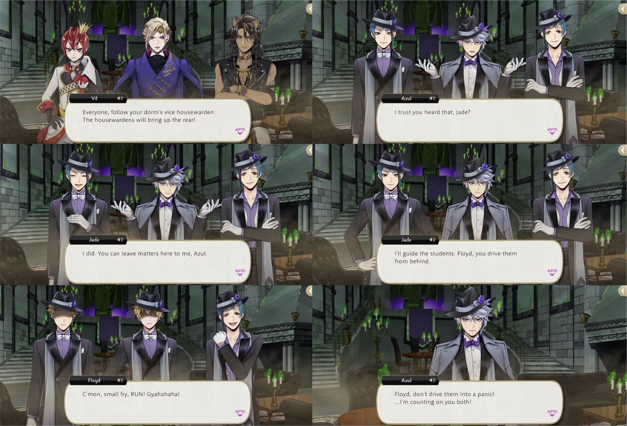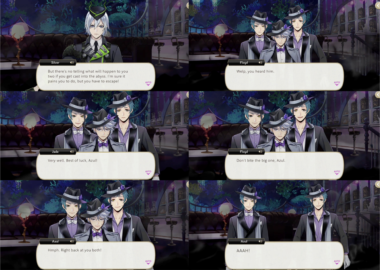 After Azul escapes from the abyss he greets the group of students with, “Floyd! Jade! And the rest of you!,” and when Ortho deems the twins too injured to continue on, Azul instructs them to stay behind and recover in anticipation of the fight against Malleus.