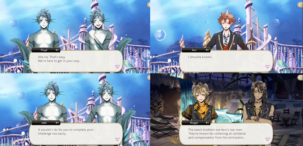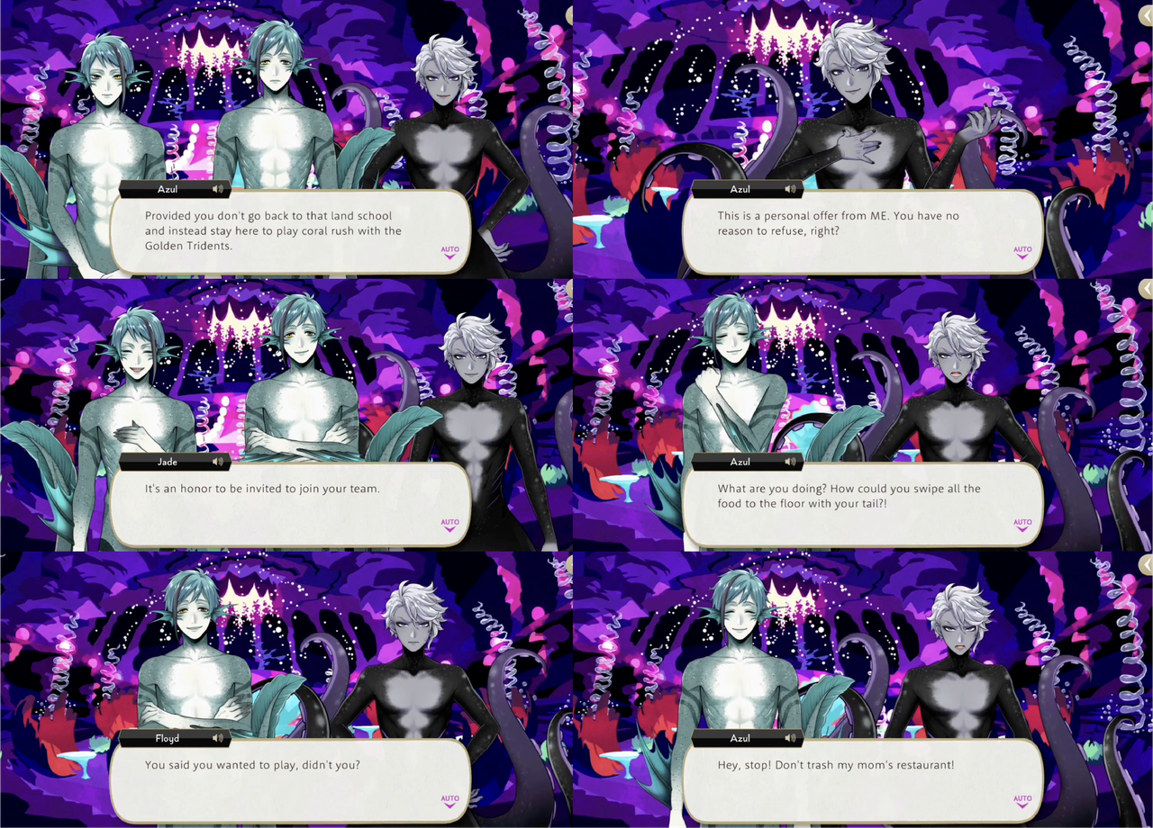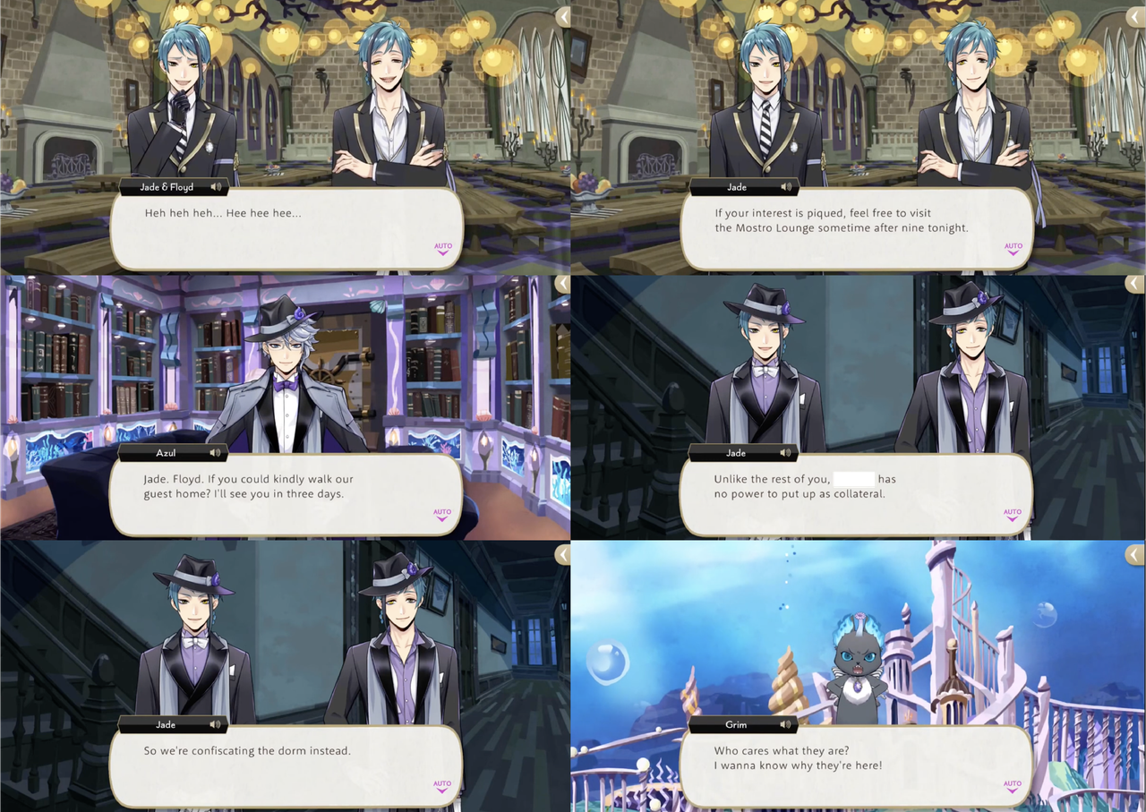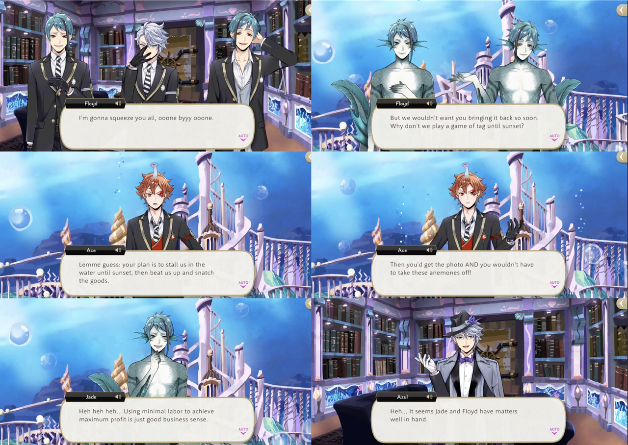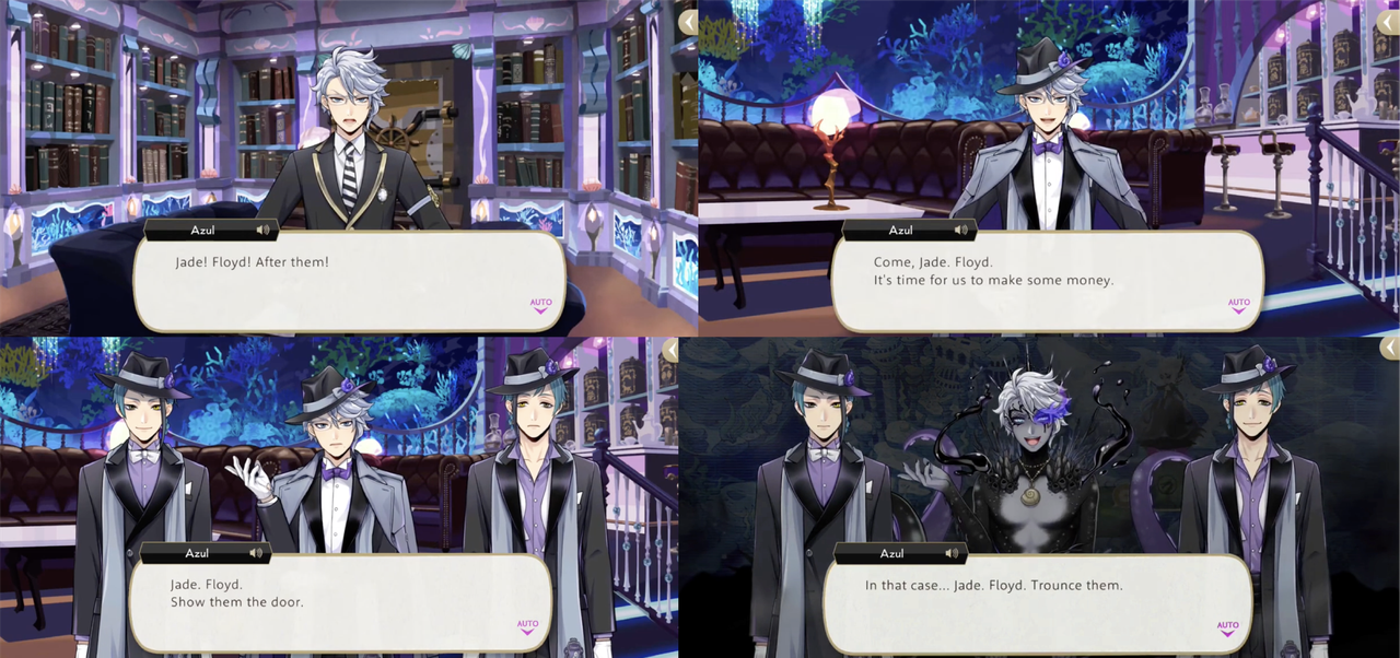 After evicting the “land-dwellers” from his party, Azul allows Jade and Floyd to stay with him on the condition that they join his Coral Rush team (“This is a personal offer from ME. You have no reason to refuse, right?”).