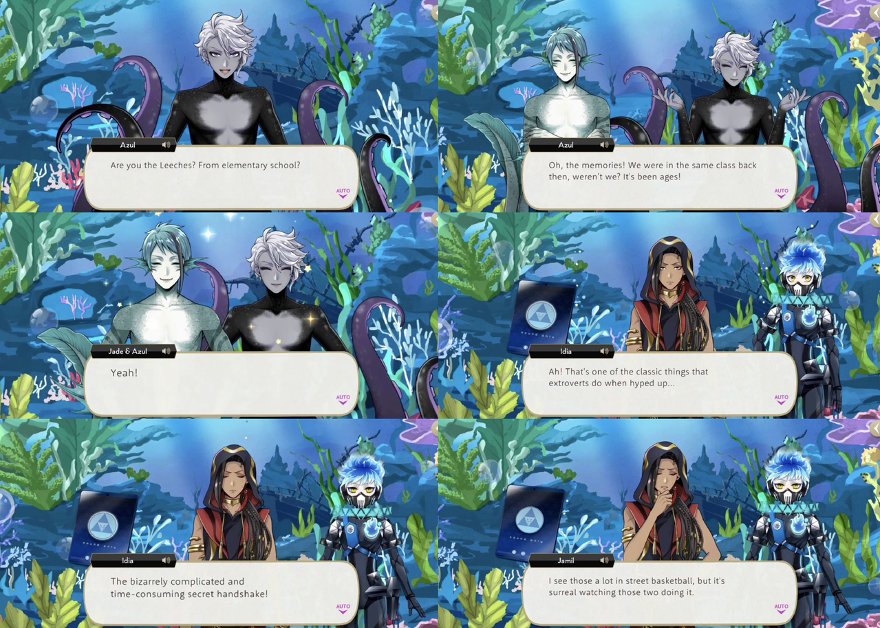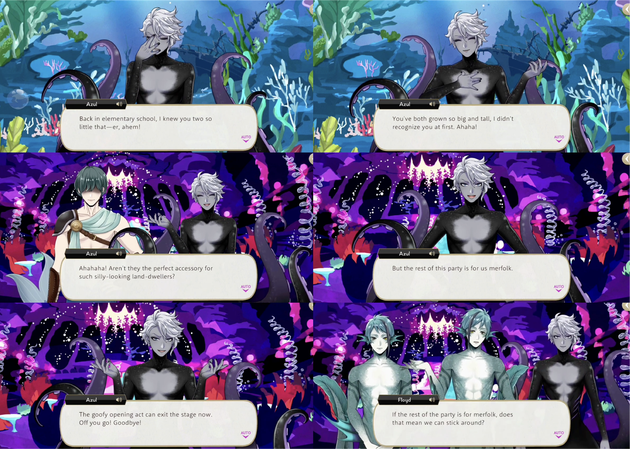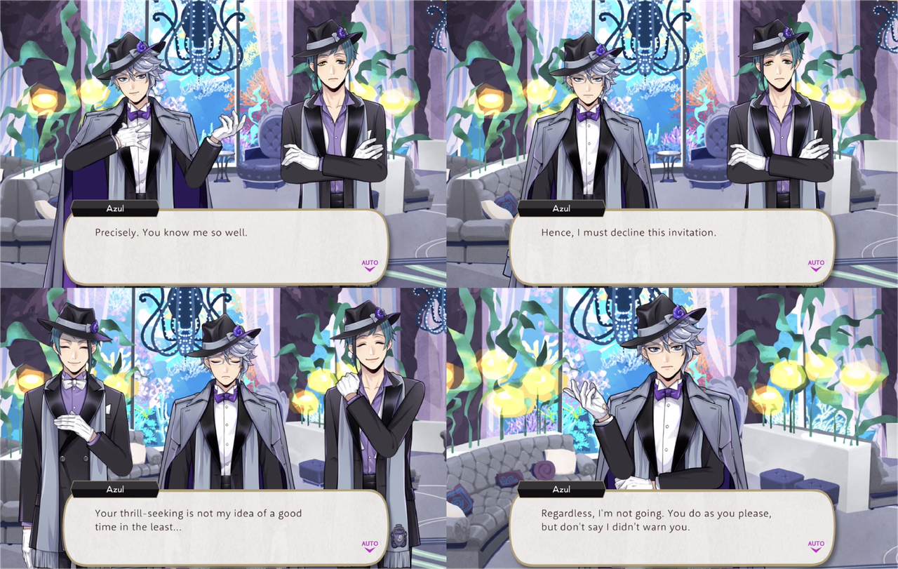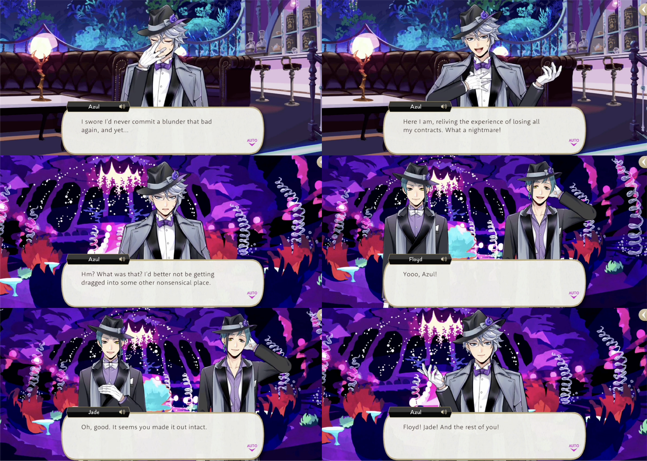 After evicting the “land-dwellers” from his party, Azul allows Jade and Floyd to stay with him on the condition that they join his Coral Rush team (“This is a personal offer from ME. You have no reason to refuse, right?”).