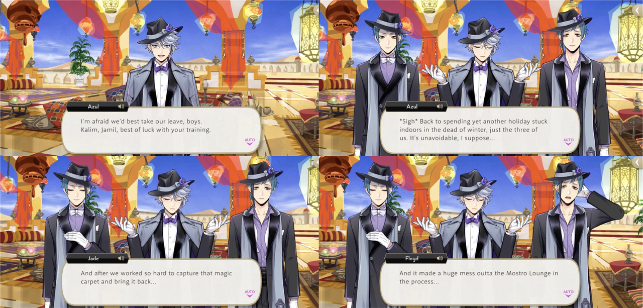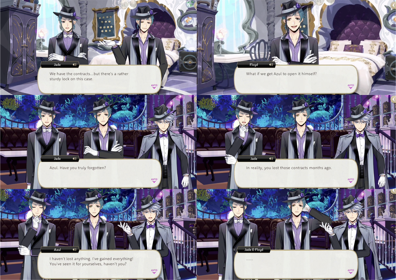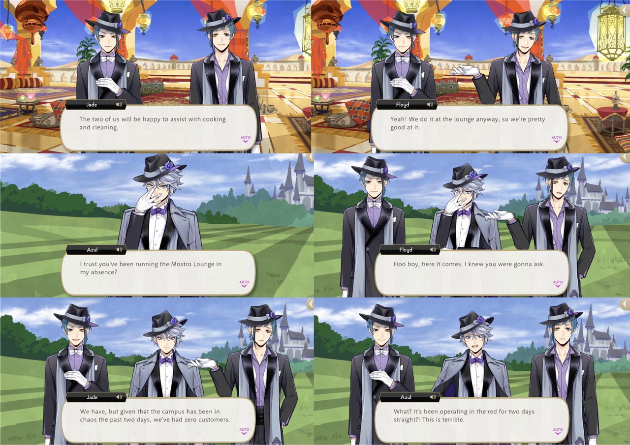 There are also instances when the twins go to Azul’s aid of their own accord, such as defending Azul when he is accused of setting up a false queue during New Year’s in order to be first in line to the school store himself, and when Azul announces a dramatic exit from Scarabia the twins both play along to guilt trip Kalim without needing to be asked.