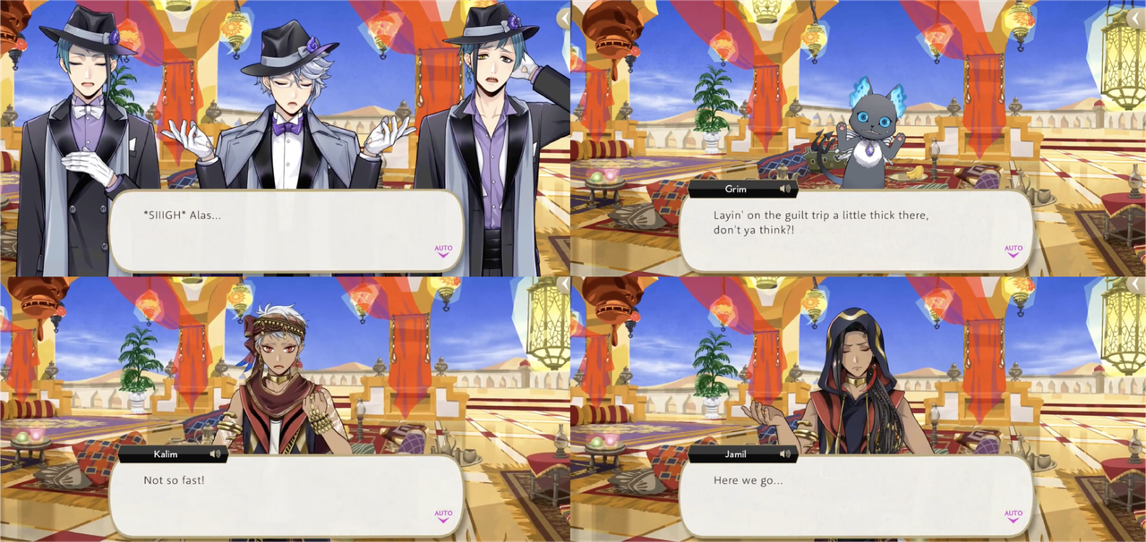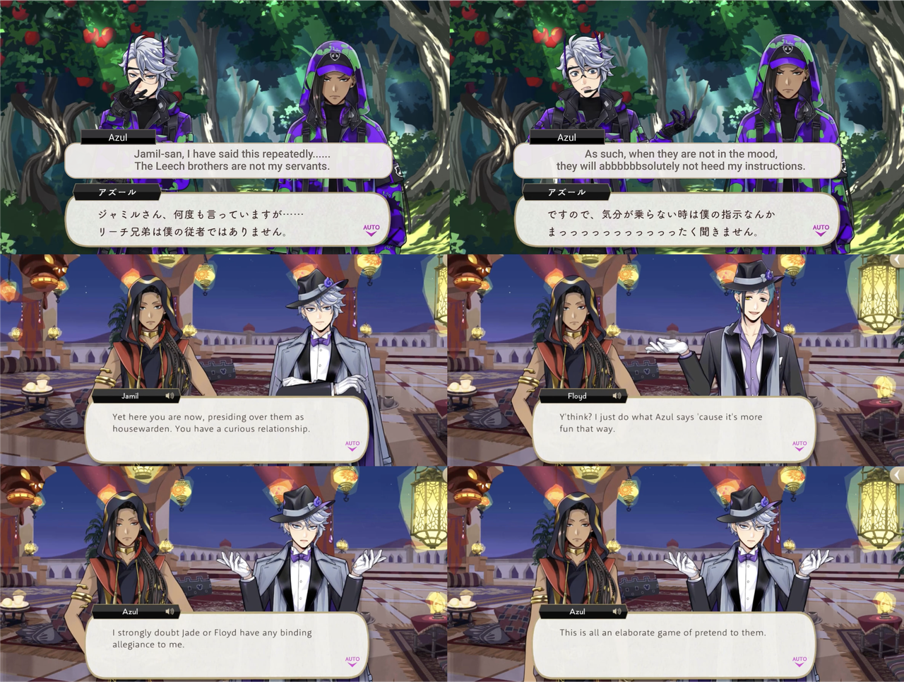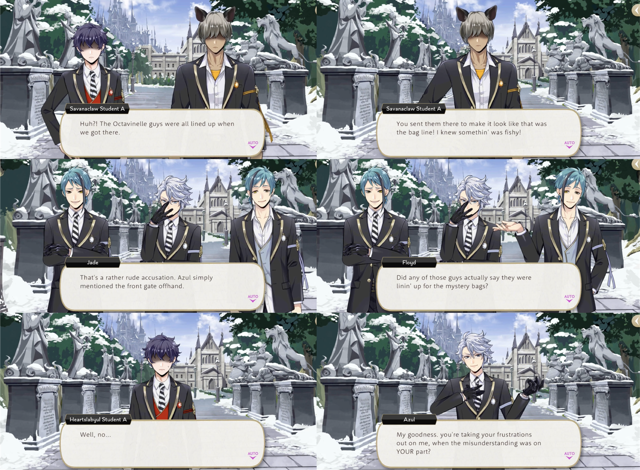 There are also instances when the twins go to Azul’s aid of their own accord, such as defending Azul when he is accused of setting up a false queue during New Year’s in order to be first in line to the school store himself, and when Azul announces a dramatic exit from Scarabia the twins both play along to guilt trip Kalim without needing to be asked.