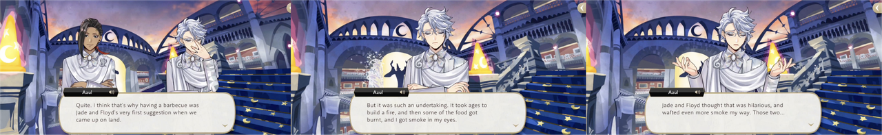 Relating an anecdote from when they first came on land, Azul talks about having a barbecue during which he got smoke in his eyes, and “Jade and Floyd thought that was hilarious, and wafted even more smoke (his) way.”