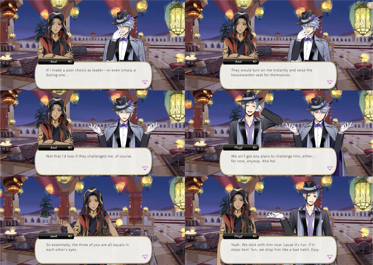 Floyd says he just does what Azul says “’cause it’s more fun that way,” and Azul explains (again to Jamil), “I strongly doubt Jade or Floyd have any binding allegiance to me. This is all an elaborate game of pretend to them.If I made a poor choice as leader—or even simply a boring one—They would turn on me instantly and seize the housewarden seat for themselves,” though he adds, “Not that I’d lose if they challenged me, of course.”