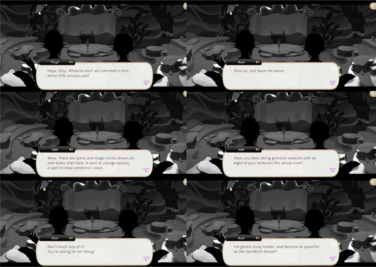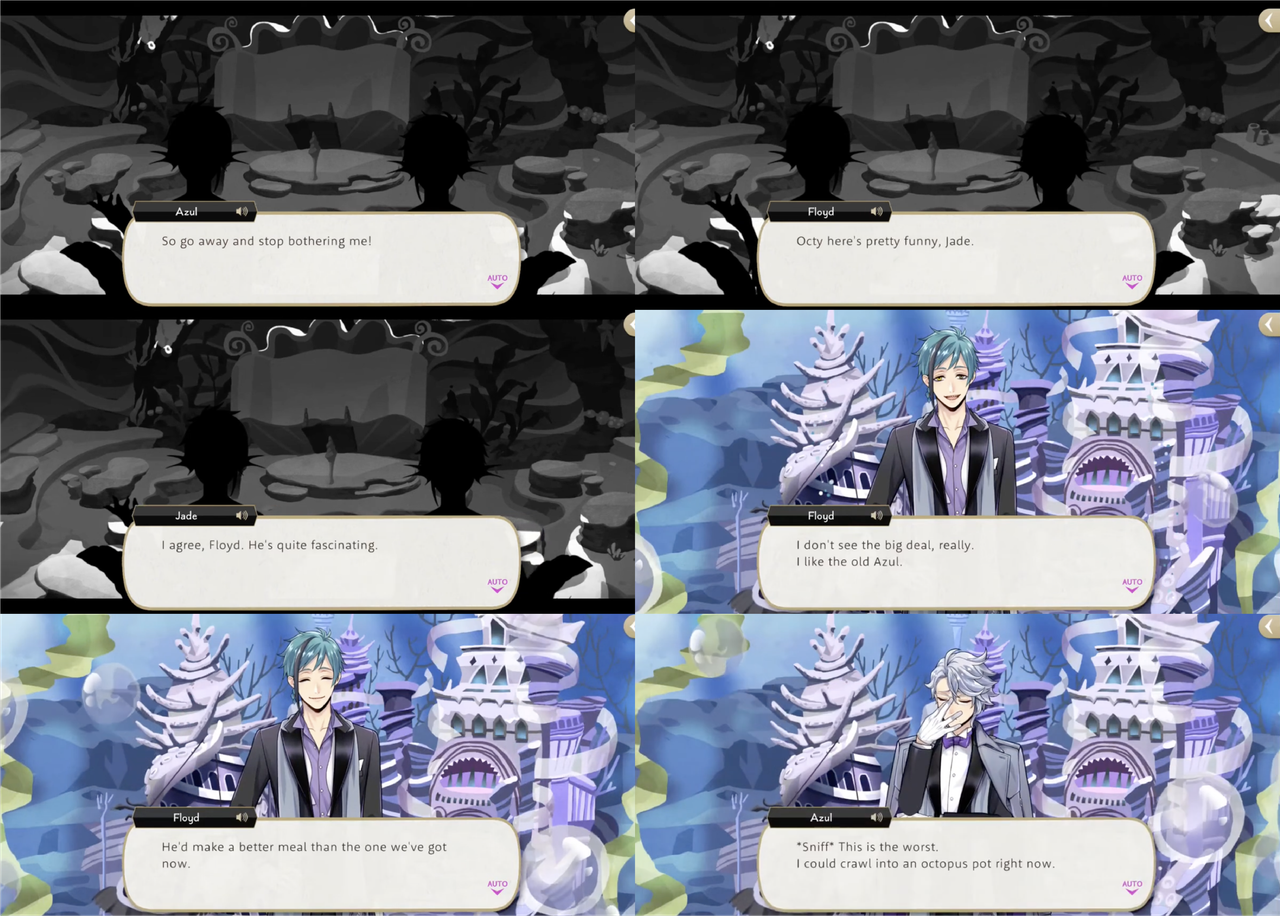 Due to there not being nearly as many mermaids as there are humans Jade, Floyd and Azul have been in the same classes since starting elementary school. In a flashback we see the twins approaching a child-Azul alone in a “teeny little octopus pot,” where they seem both impressed by Azul’s grimoire research and amused by Azul himself. Floyd says that he likes “old” Azul (“He’d make a better meal than the one we’ve got now”).