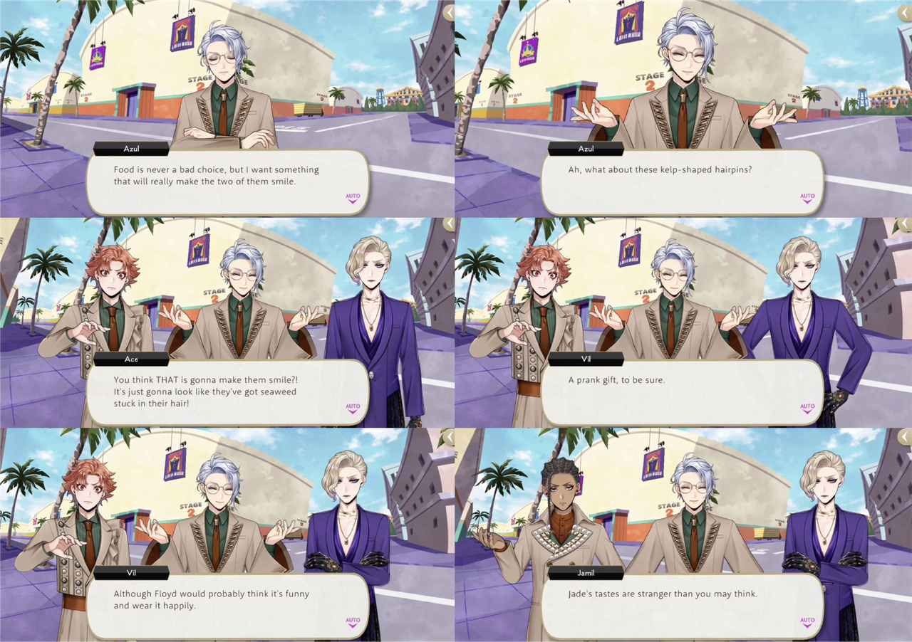 Azul also gets gifts from the Fairest City for Jade and Floyd (“Food is never a bad choice, but I want something that will really make the two of them smile”), ultimately selecting kelp-shaped hairpins.