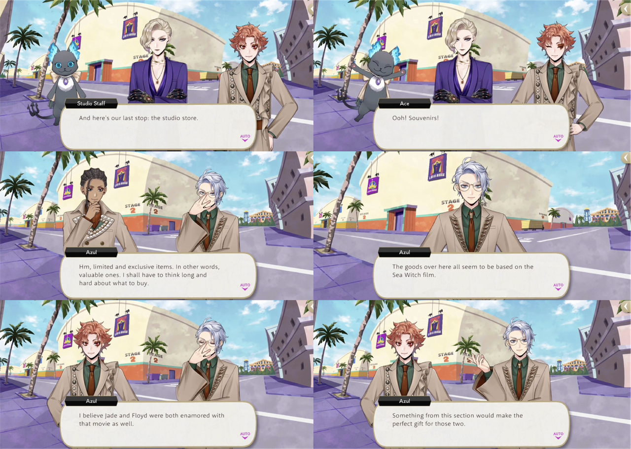 Azul has a voice line about bringing Jade and Floyd with him to the Fairest City for a study trip.