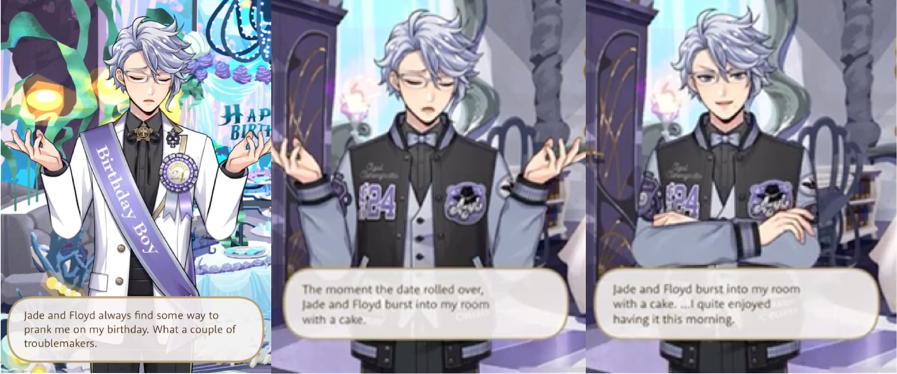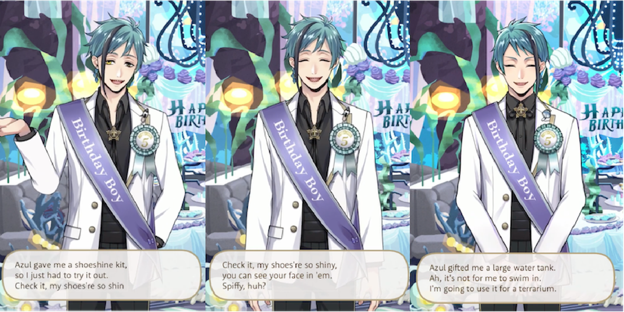 The twins have voice lines about Azul gifting them with birthday presents that support their hobbies (a shoeshine kit for Floyd, a water tank for a terrarium for Jade), while Azul says, “Jade and Floyd always find some way to prank me on my birthday,” and that the twins burst into his room with cake at midnight.