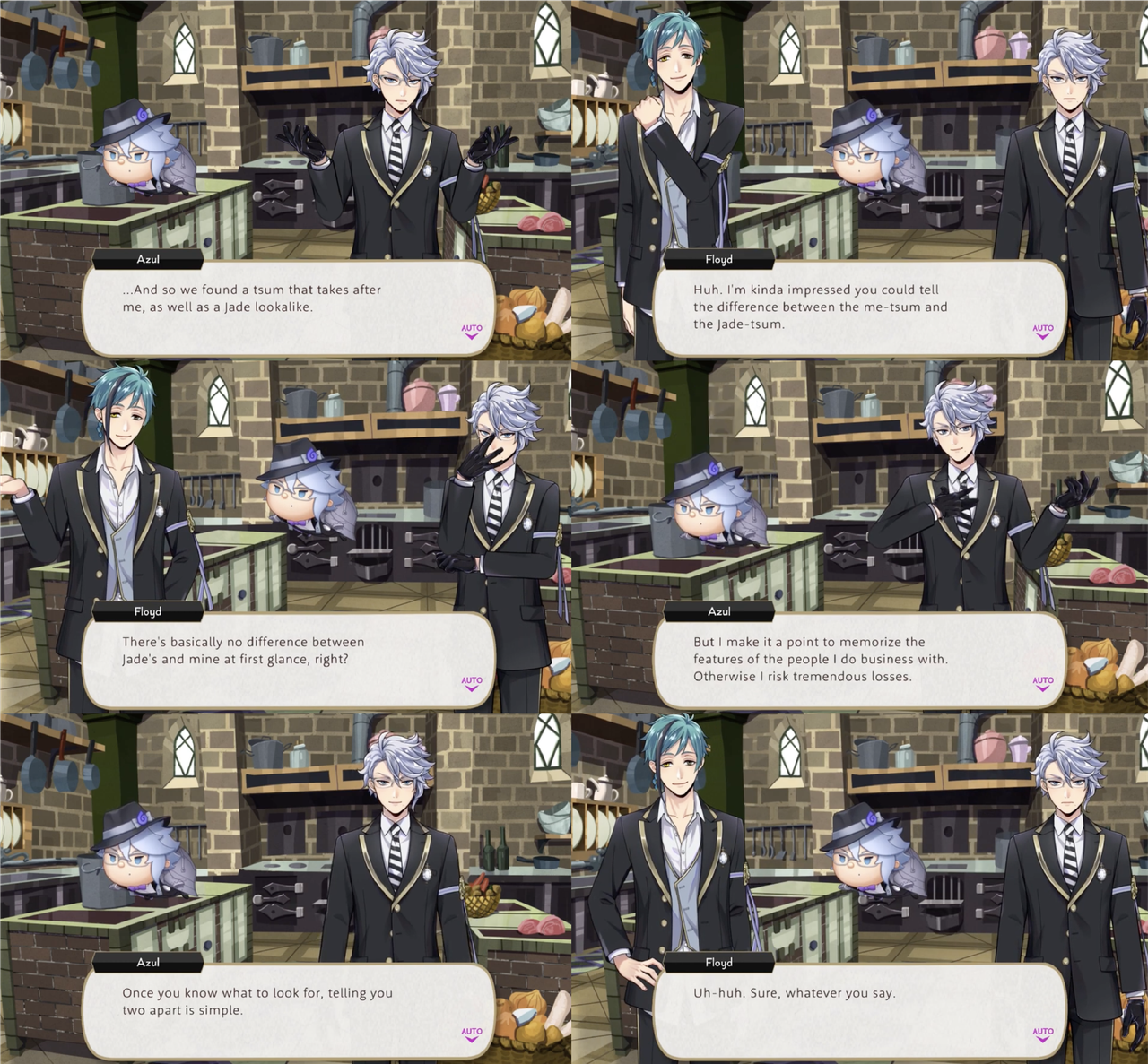 Floyd says he is impressed that Azul is able to tell the difference between his and Jade’s tsums during Tsumsted. Azul explains, “I make it a point to memorize the features of the people I do business with. Otherwise I risk tremendous losses. Once you know what to look for, telling you two apart is simple,” but Floyd responds, “Uh-huh. Sure, whatever you say.”