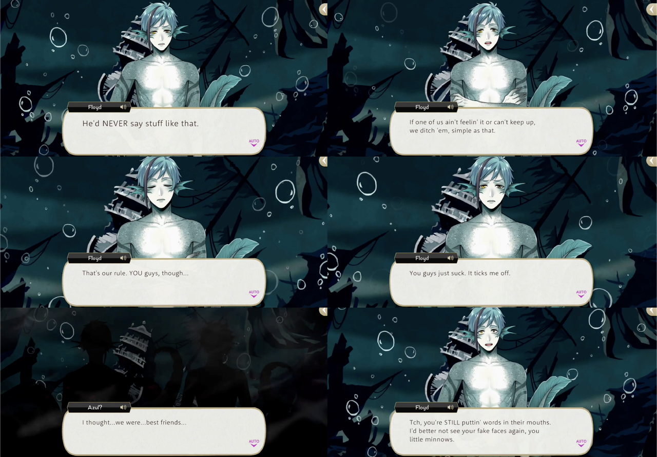 This balance of their relationship comes into play in Book 7 where Floyd realizes he is in a dream after a dream-version of Azul says, “The three of us, together forever, down here under the sea.” Floyd responds, “Talkin’ about us bein’ together forever? He’d NEVER say stuff like that. If one of us ain’t feelin’ it or can’t keep up, we ditch ’em, simple as that. That’s our rule.” As it disappears the dream-Azul says, “I thought we were best friends,” which seems to irritate Floyd even more.