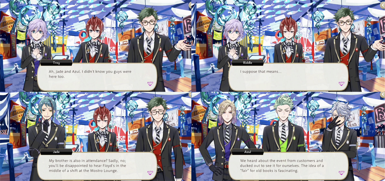 At the beginning of the NBC event we see Azul and Jade leave Floyd in the middle of a shift at the lounge to visit a used book fair together.