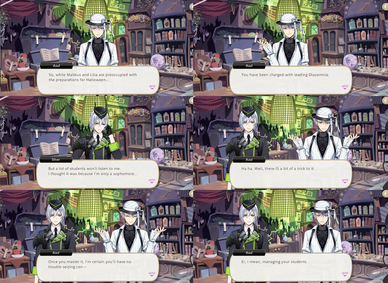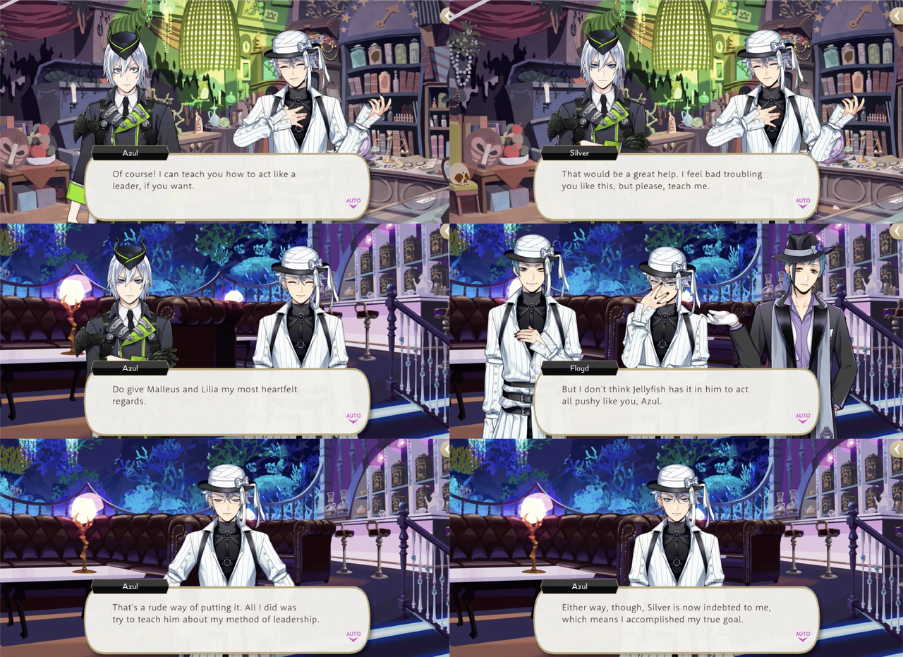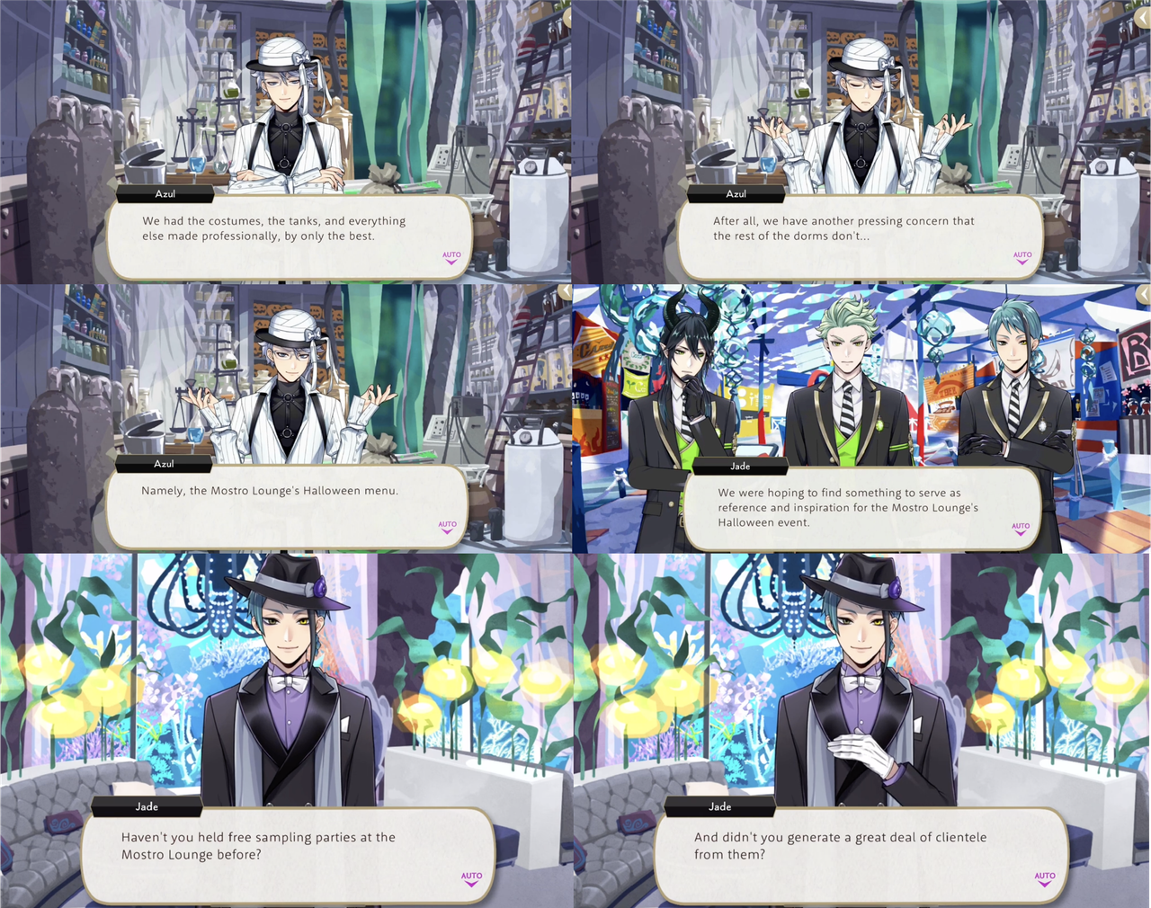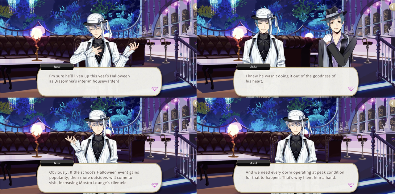 During Halloween Azul gives a struggling Silver a lesson on how to be respected as a leader at Diasomnia, both to get Silver indebted to him and for the sake of the lounge: “I’m sure he’ll liven up this year’s Halloween as Diasomnia’s interim housewarden!…If the school’s Halloween event gains popularity, then more outsiders will come to visit, increasing Mostro Lounge’s clientele. And we need every dorm operating at peak condition for that to happen. That’s why I lent him a hand.”