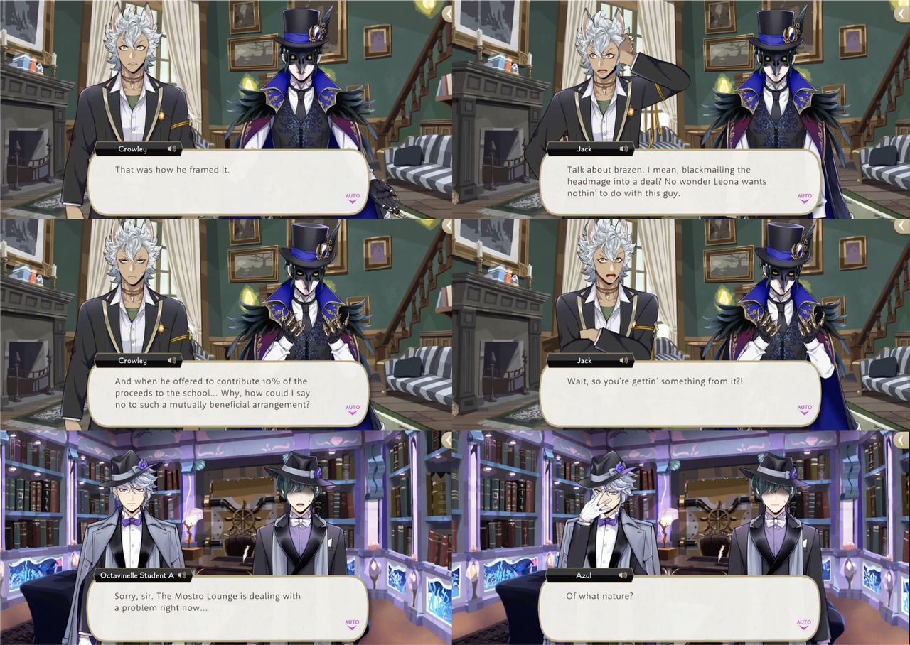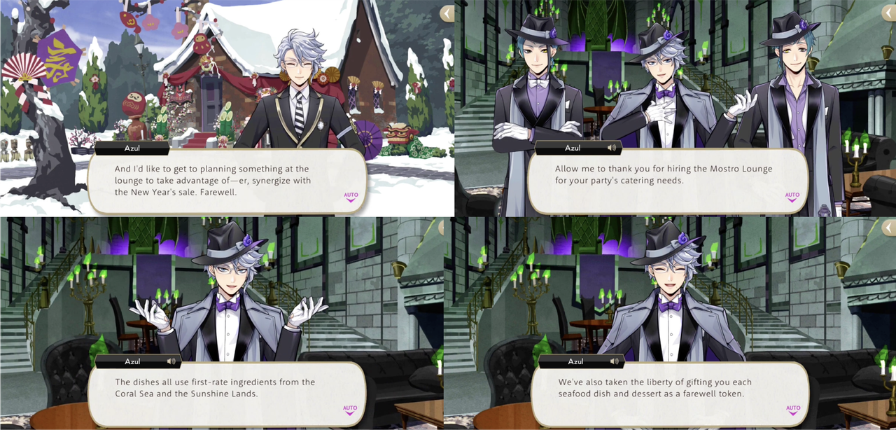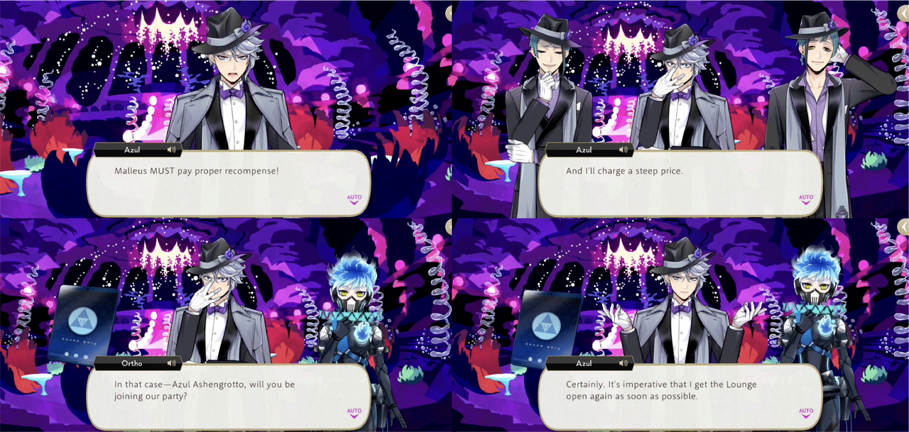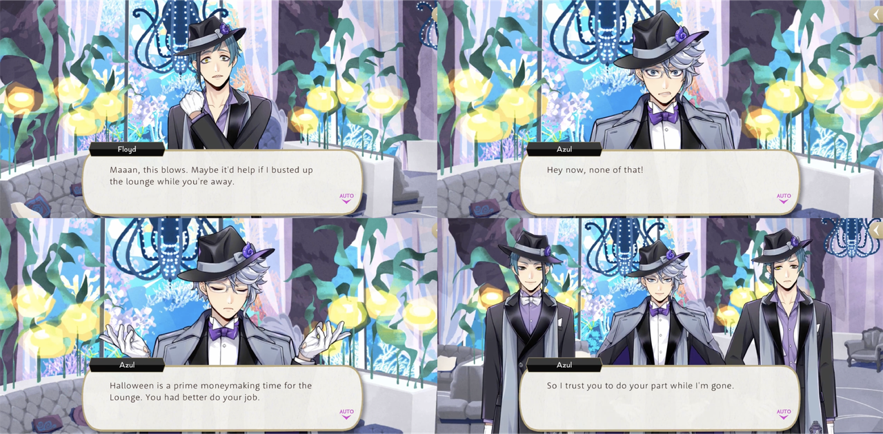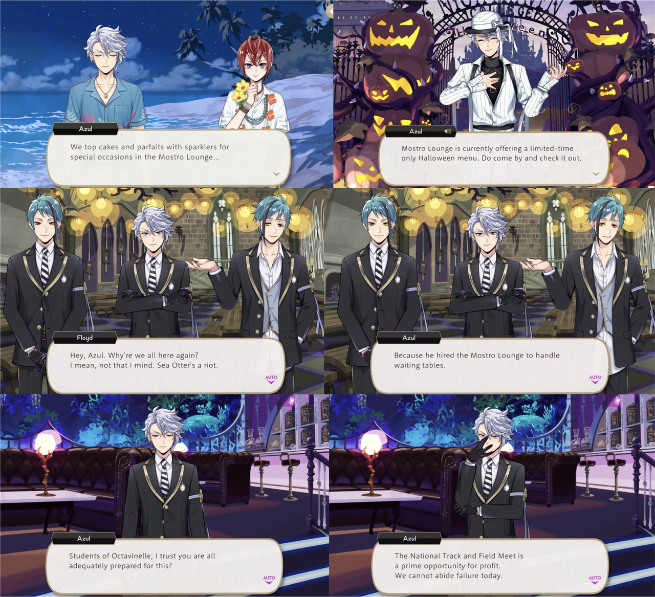 During Halloween Azul gives a struggling Silver a lesson on how to be respected as a leader at Diasomnia, both to get Silver indebted to him and for the sake of the lounge: “I’m sure he’ll liven up this year’s Halloween as Diasomnia’s interim housewarden!…If the school’s Halloween event gains popularity, then more outsiders will come to visit, increasing Mostro Lounge’s clientele. And we need every dorm operating at peak condition for that to happen. That’s why I lent him a hand.”