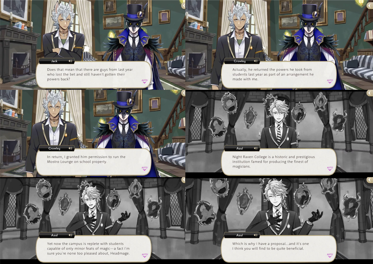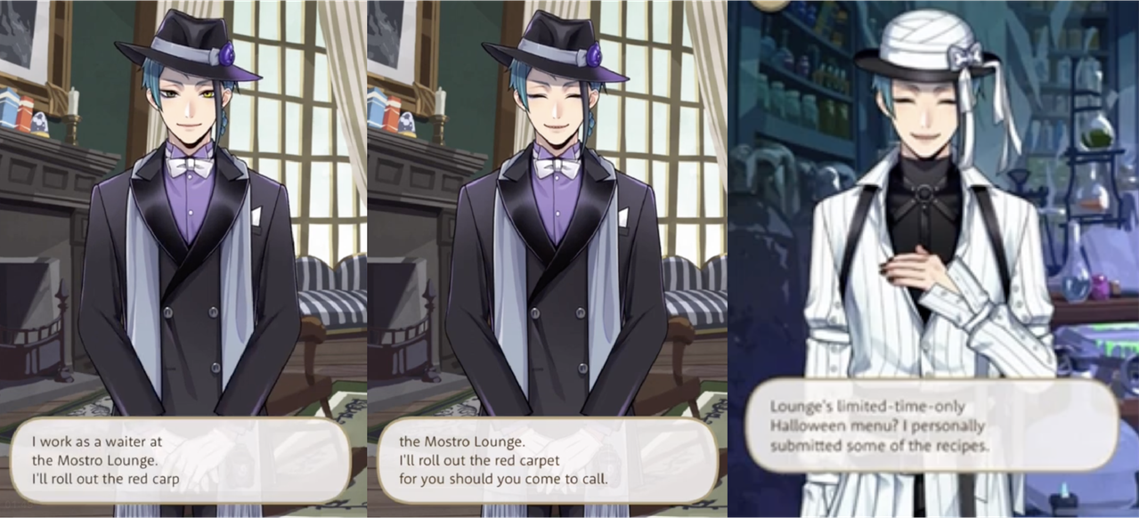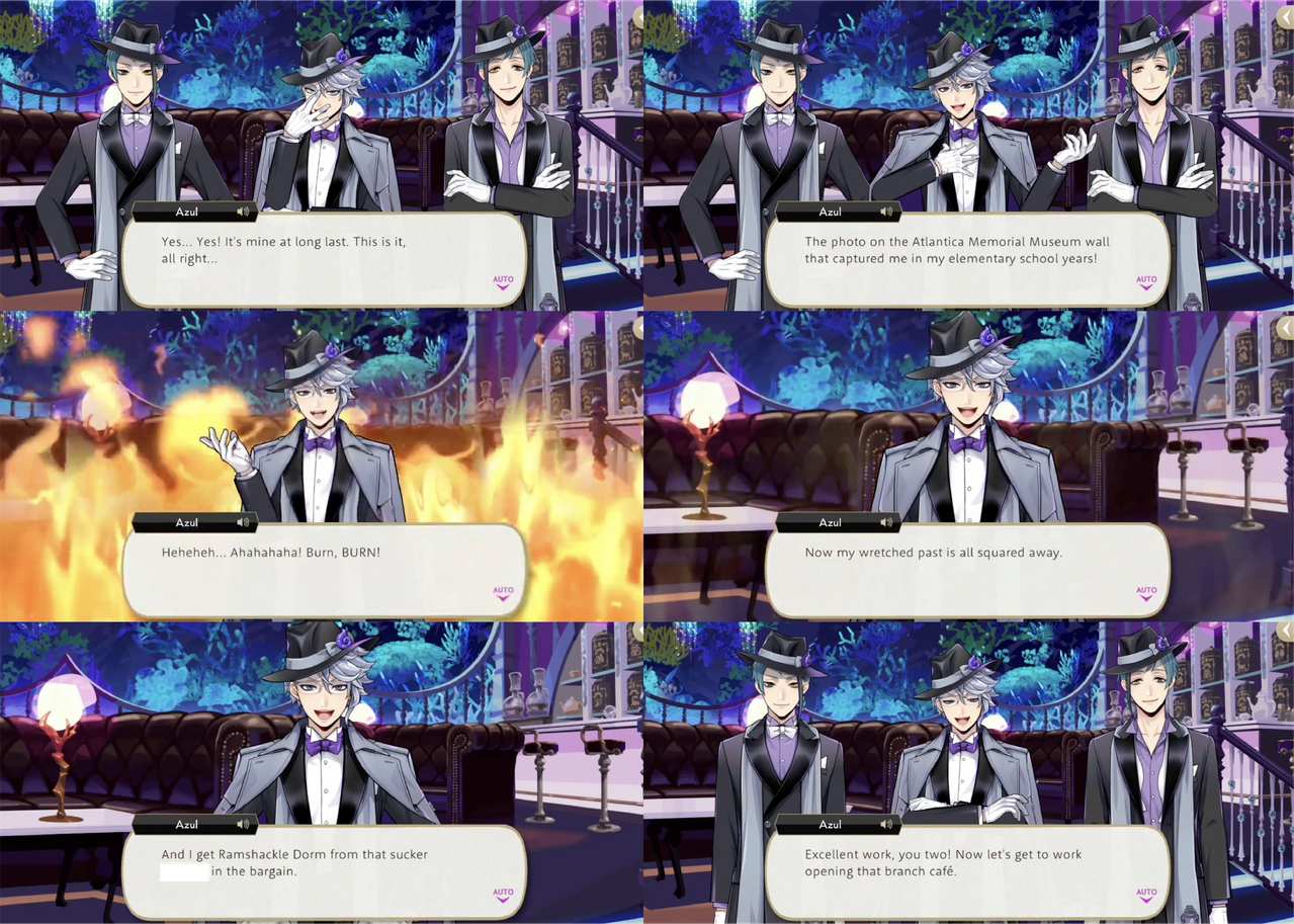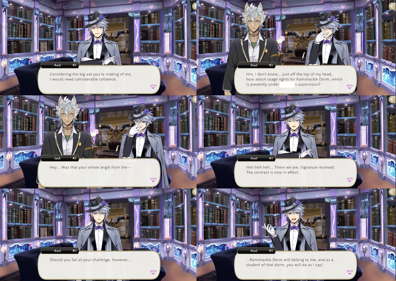 During Halloween Azul gives a struggling Silver a lesson on how to be respected as a leader at Diasomnia, both to get Silver indebted to him and for the sake of the lounge: “I’m sure he’ll liven up this year’s Halloween as Diasomnia’s interim housewarden!…If the school’s Halloween event gains popularity, then more outsiders will come to visit, increasing Mostro Lounge’s clientele. And we need every dorm operating at peak condition for that to happen. That’s why I lent him a hand.”