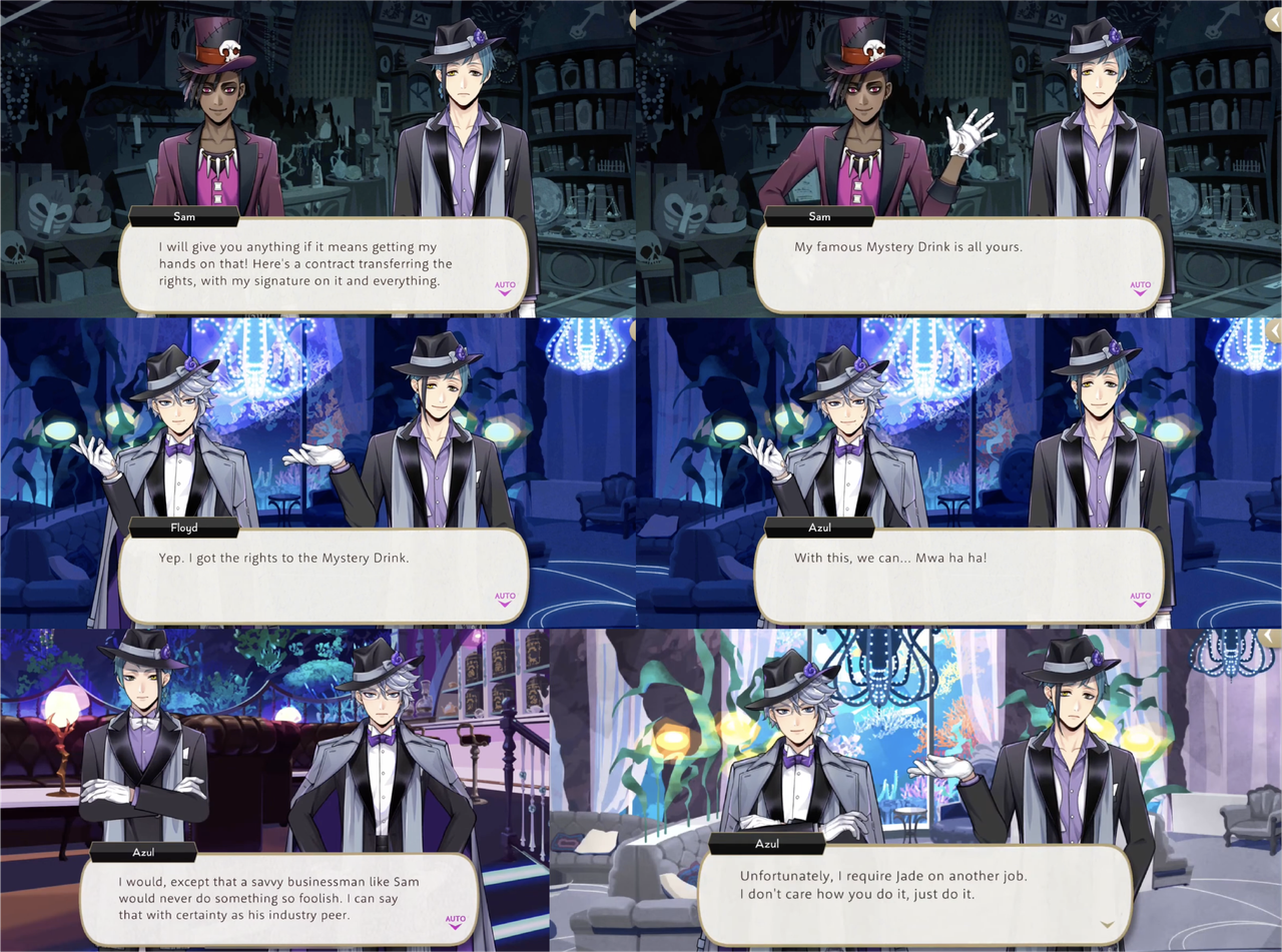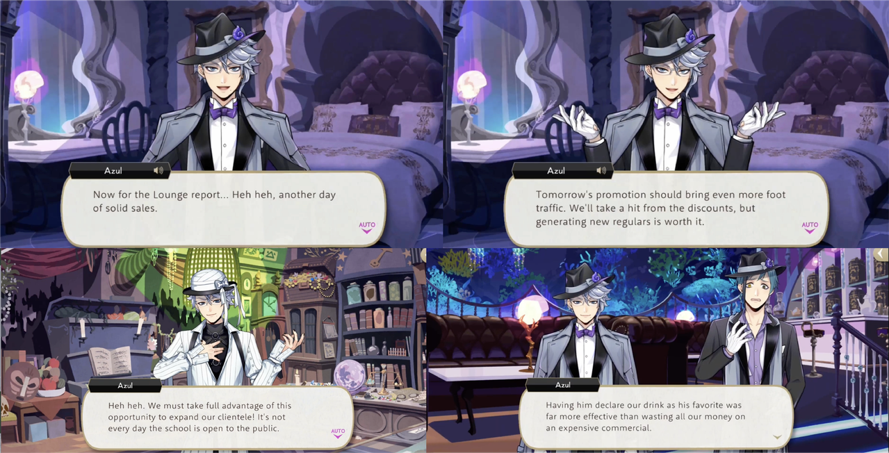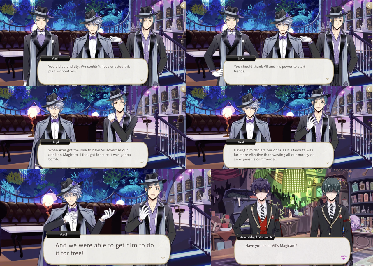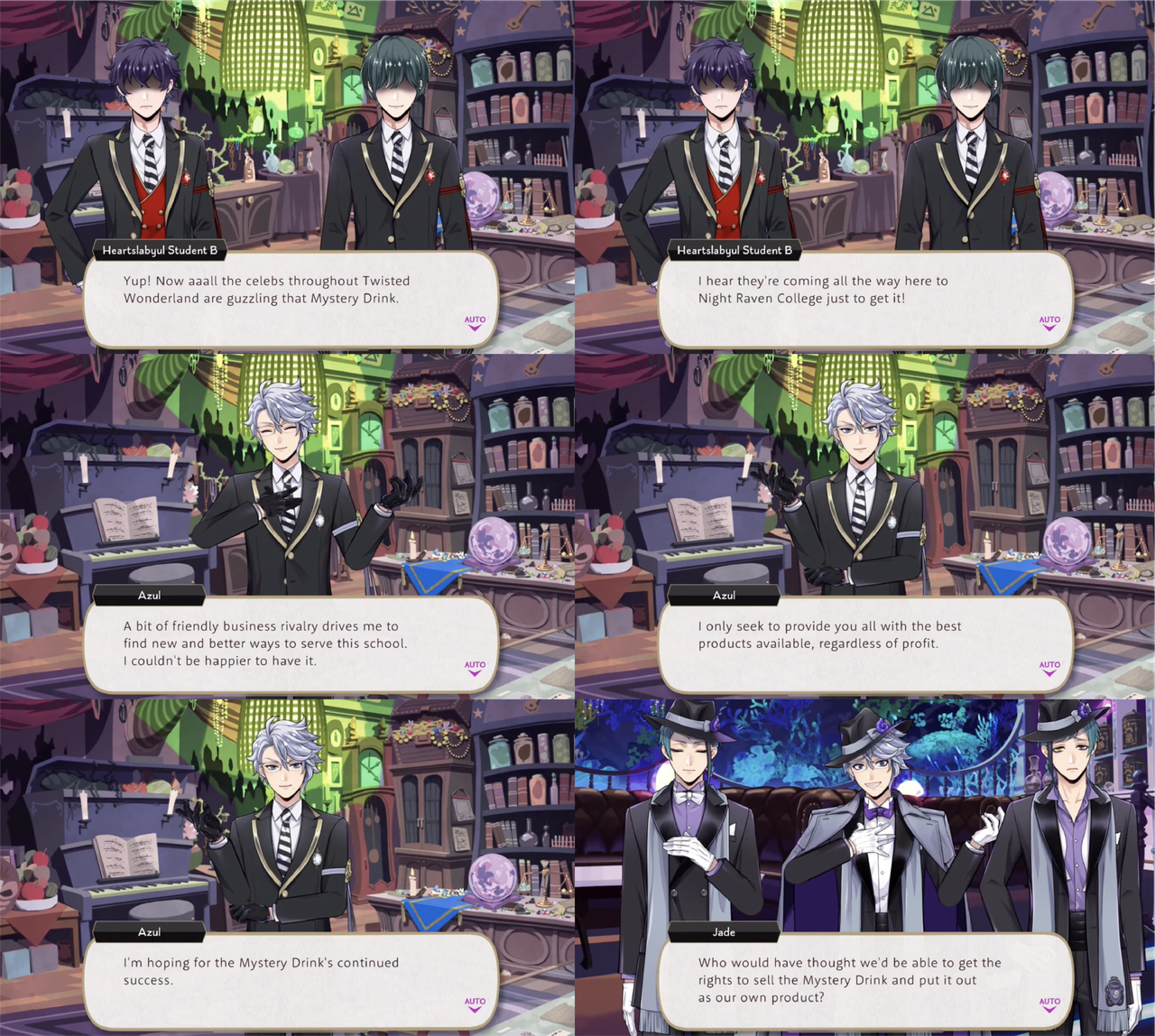 The promotion is a success, with students saying “aaall the celebs throughout Twisted Wonderland are guzzling that Mystery Drink,” and “coming all the way here to Night Raven College just to get it.” Azul says that he “couldn’t be happier” to have the school store as a rival (“A bit of friendly business rivalry drives me to find new and better ways to serve this school”),, and “I only seek to provide you all with the best products available, regardless of profit.”
