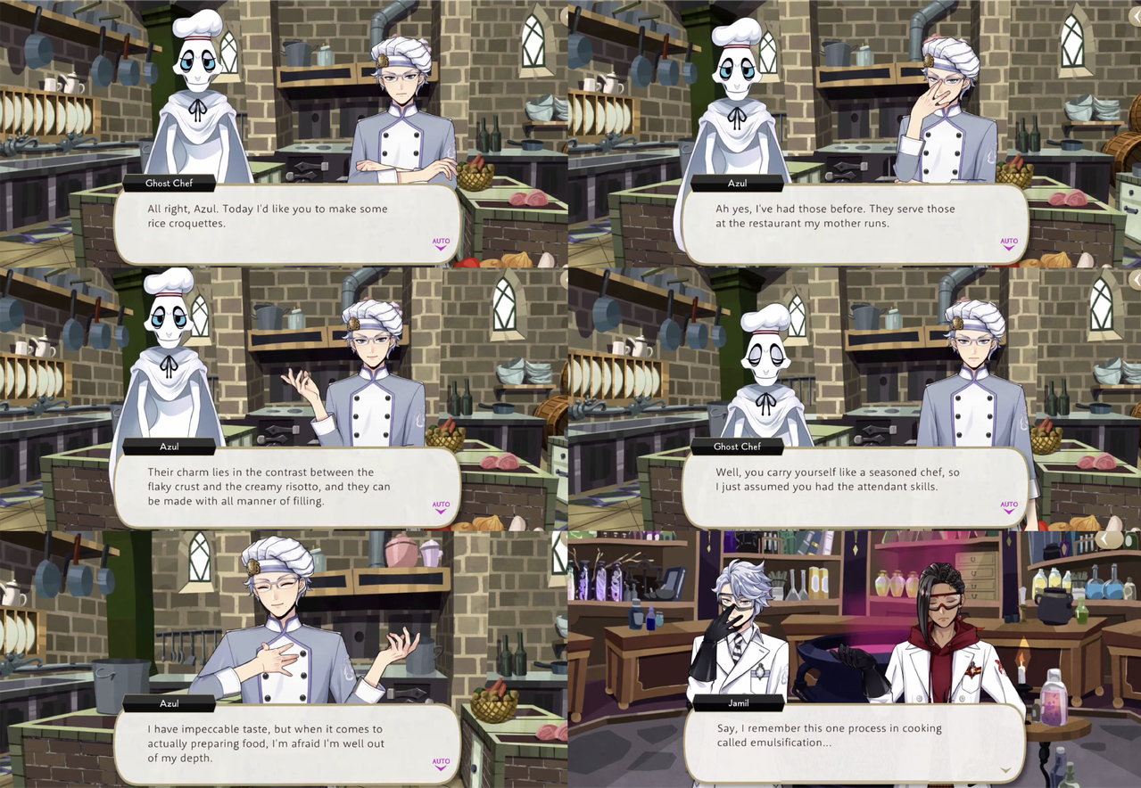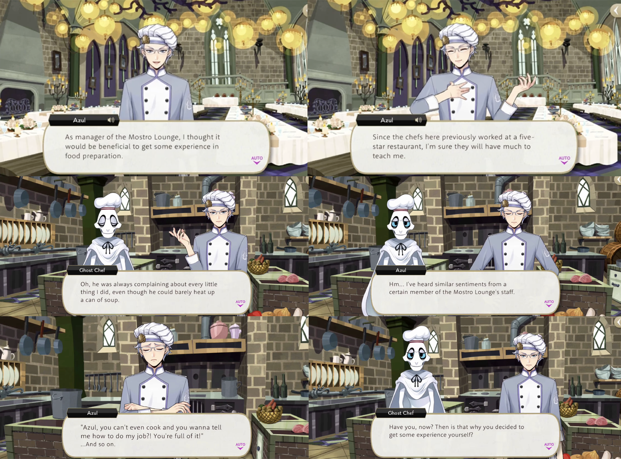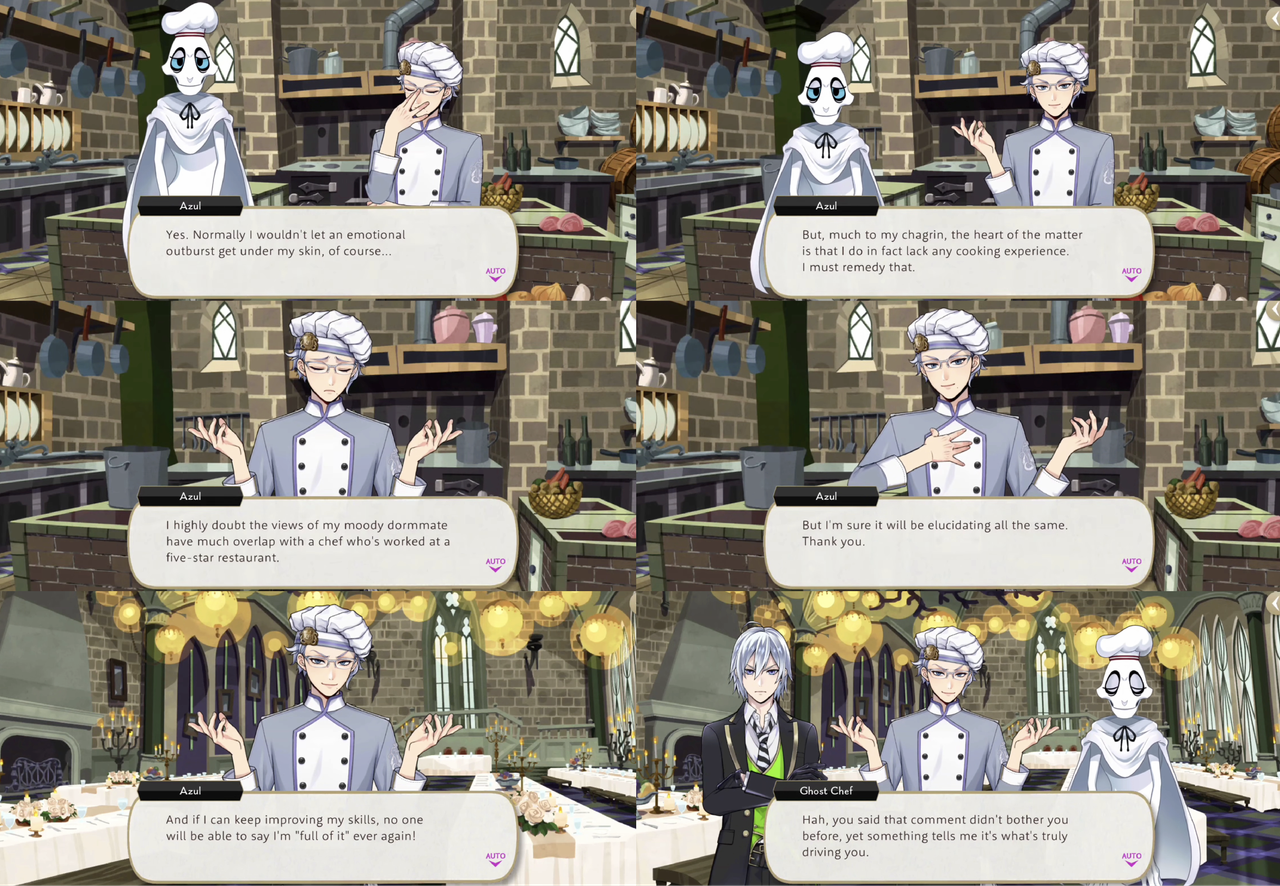 Azul says, “Normally I wouldn’t let an emotional outburst get under my skin,” but by the end of the event he says, “if I can keep improving my skills, no one will be able to say I’m ‘full of it’ ever again!,” and a ghost chef observes, “You said that comment didn’t bother you before, yet something tells me it’s what’s truly driving you.”