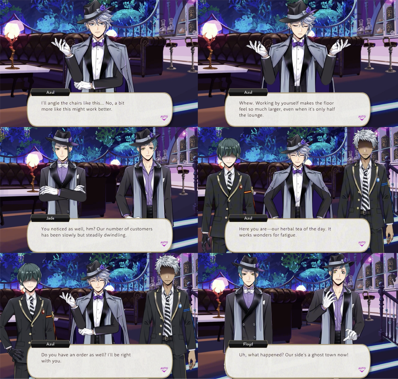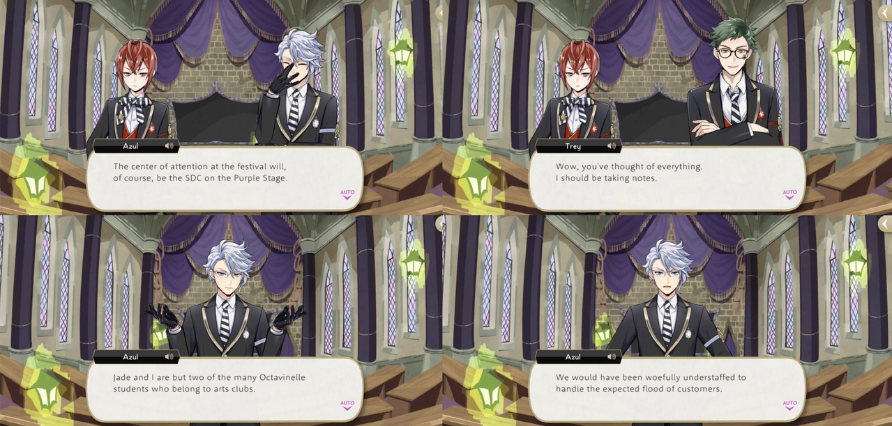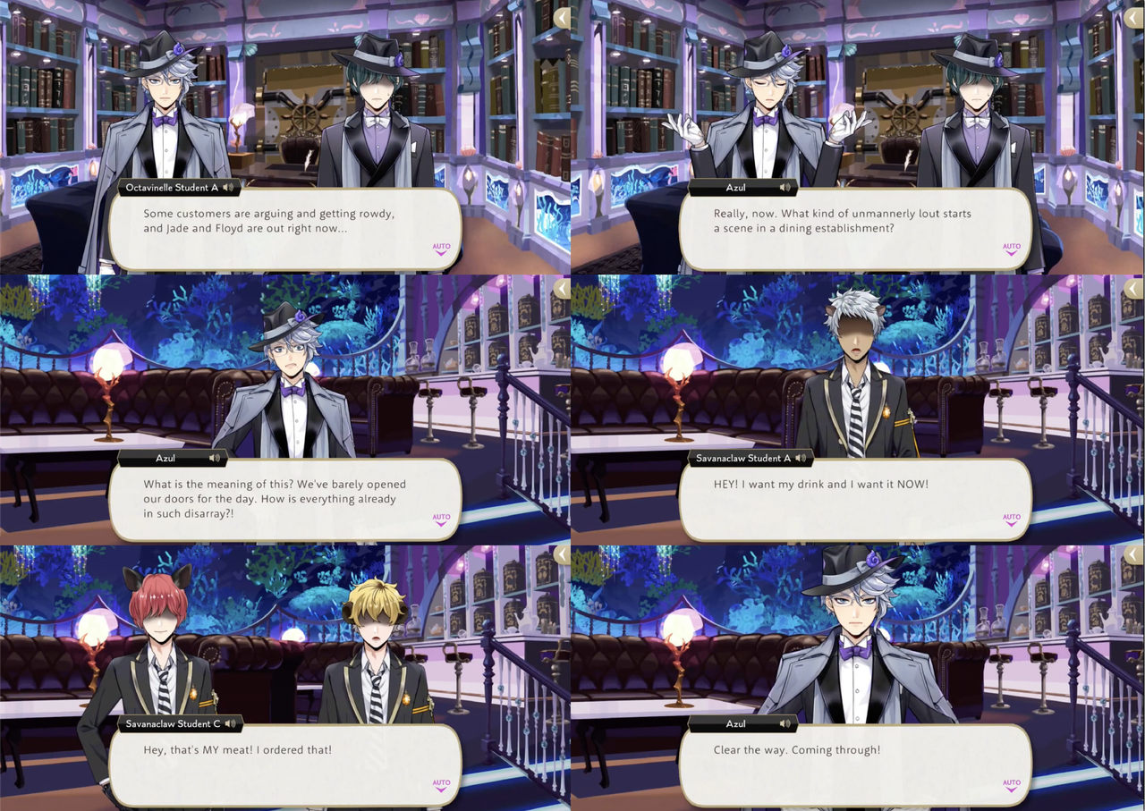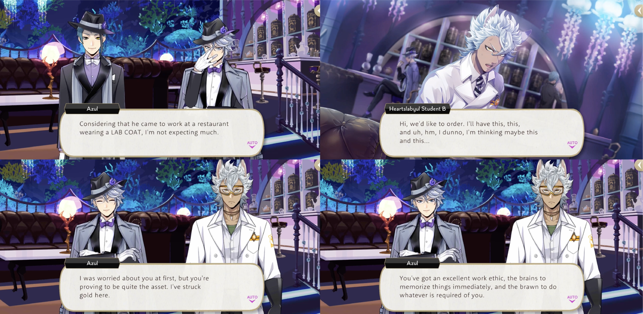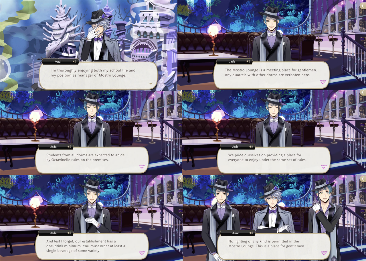 When Azul himself cannot oversee the lounge, it seems that he will entrust it to others in his absence: when he leaves campus for the social of Glorious Masquerade he leaves Jade and Floyd in charge (“Halloween is a prime moneymaking time for the Lounge. You had better do your job”), and despite the flood of off-campus visitors that attend NRC’s culture festival Azul leaves the lounge to members of sports clubs (“They’ll be running the shop and working the stands as drink vendors at each of the main stages”) as both he and Jade are “but two of the many Octavinelle students who belong to arts clubs” and they would have been “woefully understaffed to handle the expected flood of customers.”