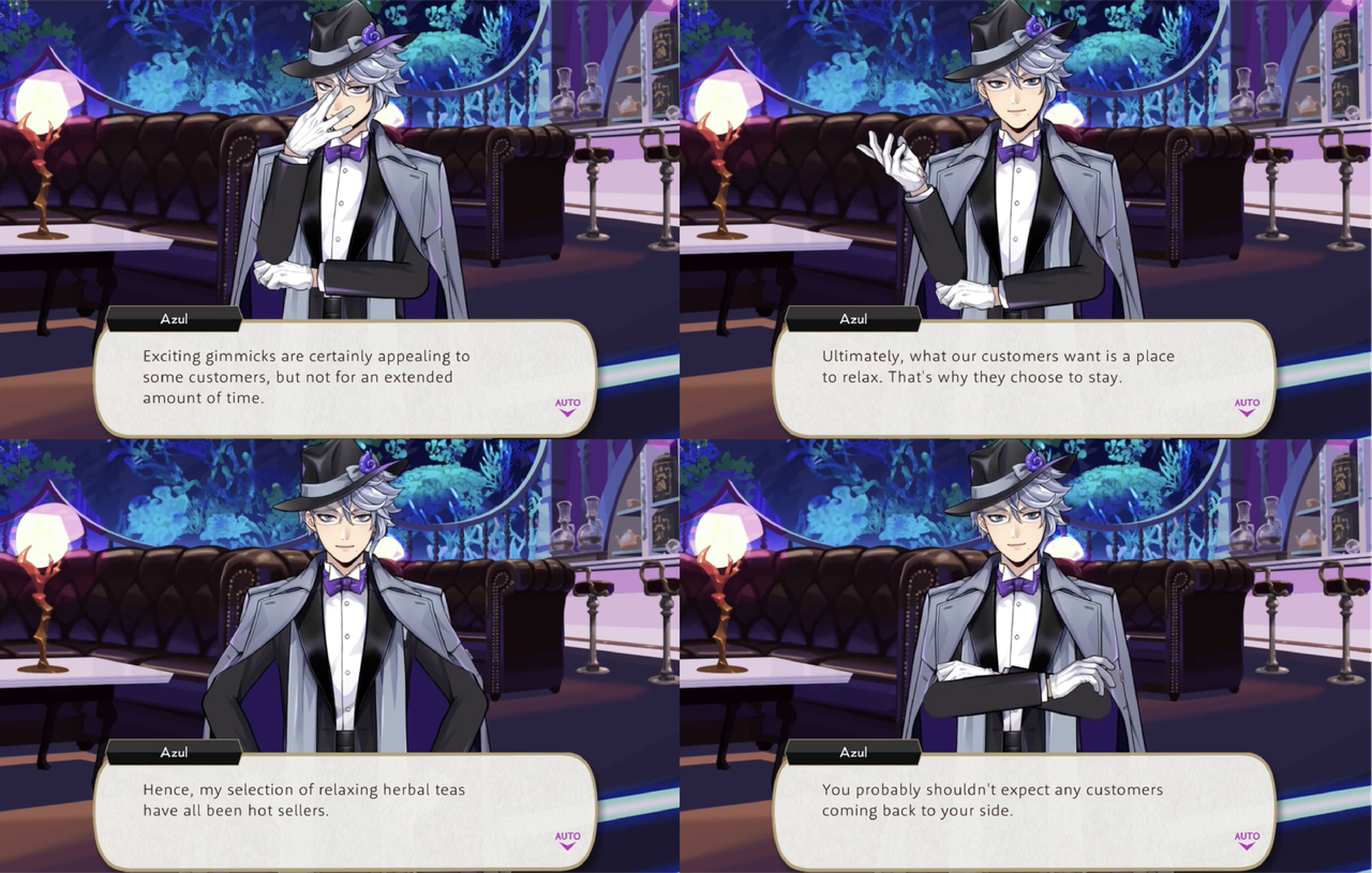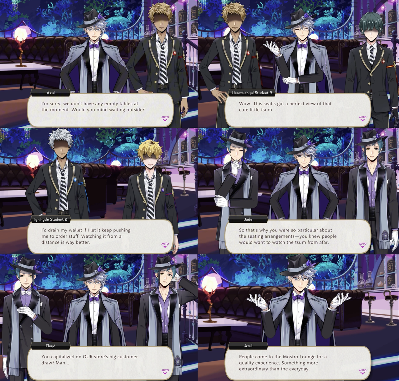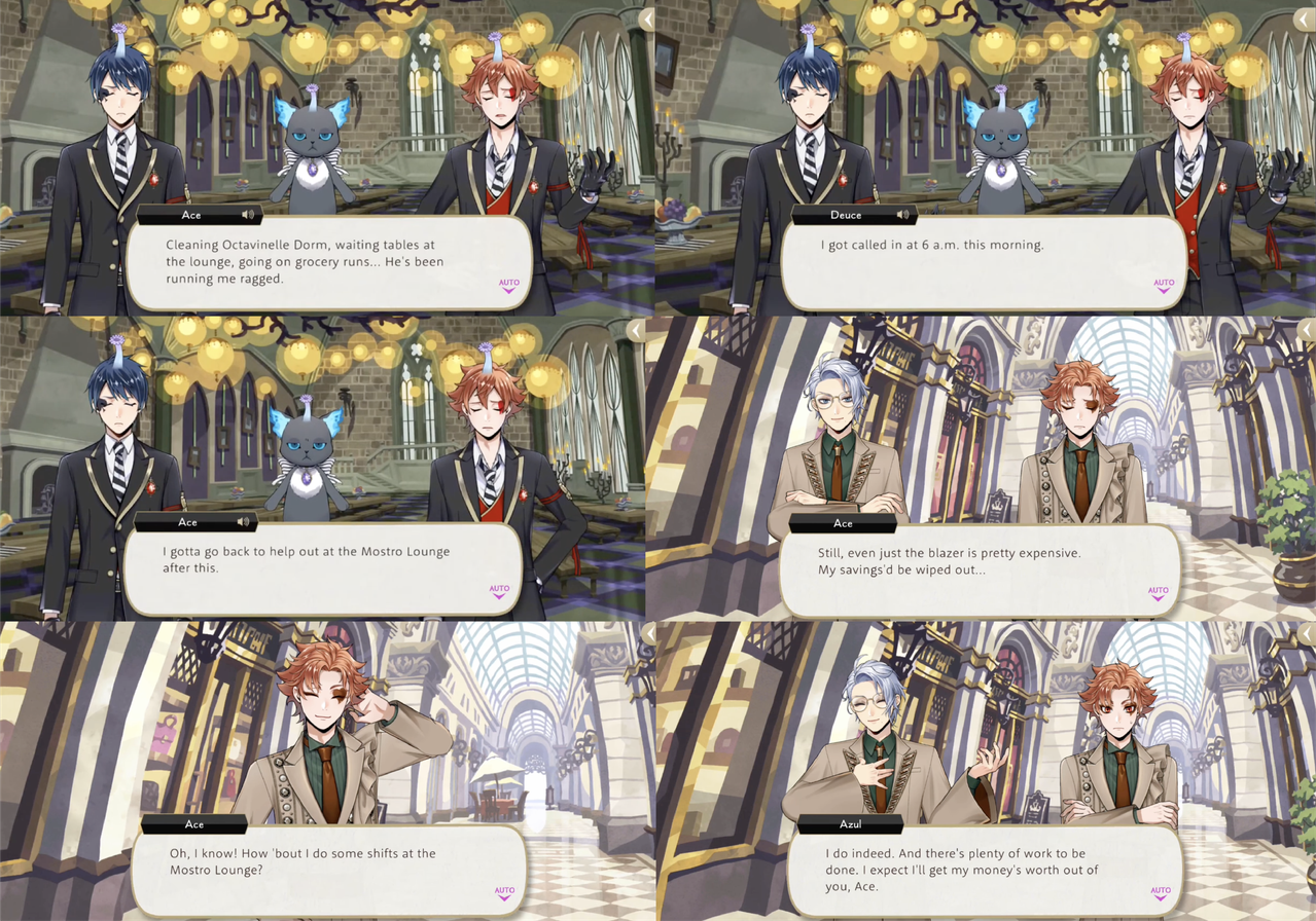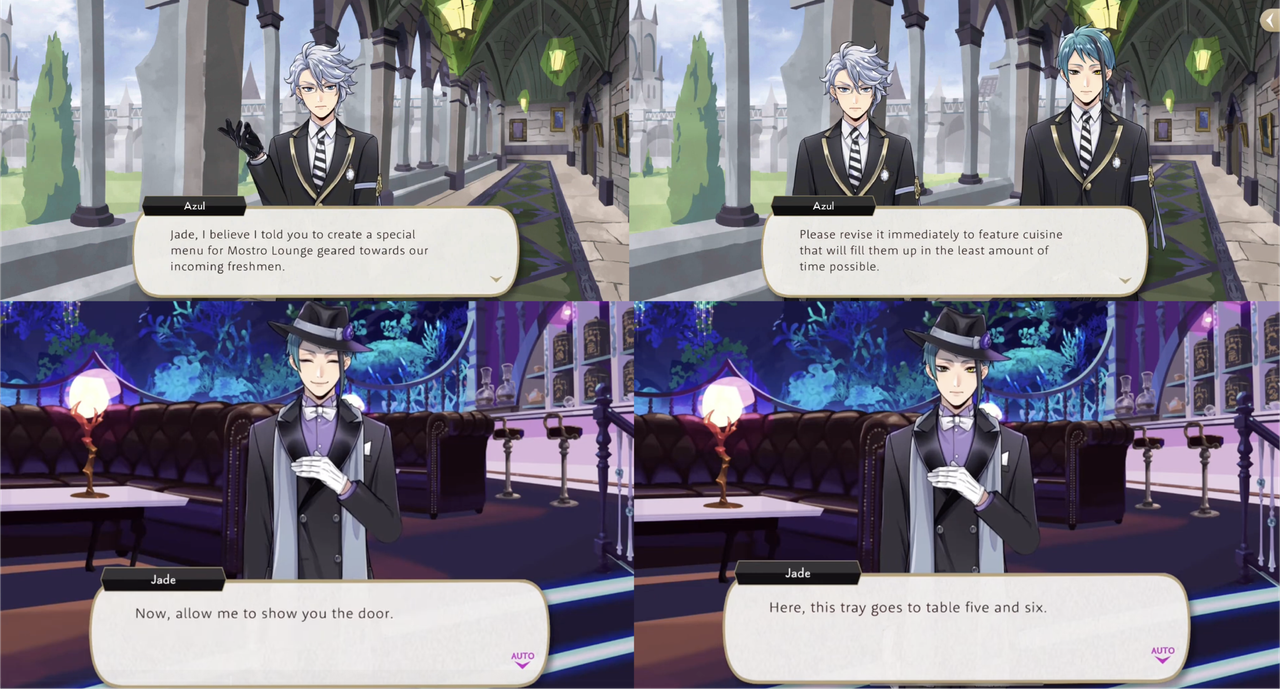 When Azul himself cannot oversee the lounge, it seems that he will entrust it to others in his absence: when he leaves campus for the social of Glorious Masquerade he leaves Jade and Floyd in charge (“Halloween is a prime moneymaking time for the Lounge. You had better do your job”), and despite the flood of off-campus visitors that attend NRC’s culture festival Azul leaves the lounge to members of sports clubs (“They’ll be running the shop and working the stands as drink vendors at each of the main stages”) as both he and Jade are “but two of the many Octavinelle students who belong to arts clubs” and they would have been “woefully understaffed to handle the expected flood of customers.”