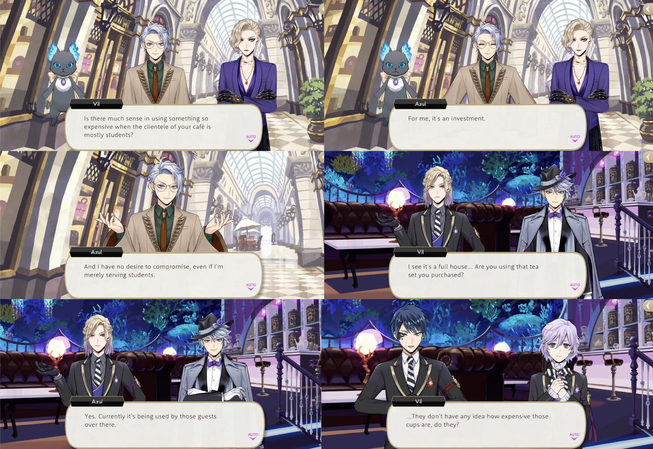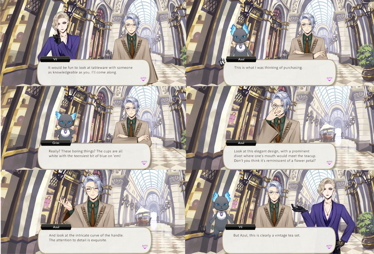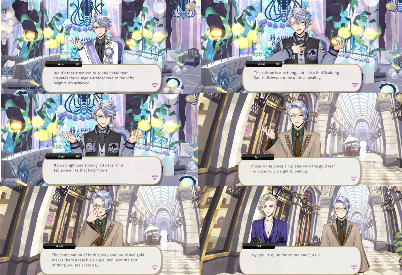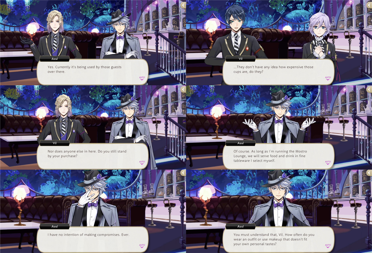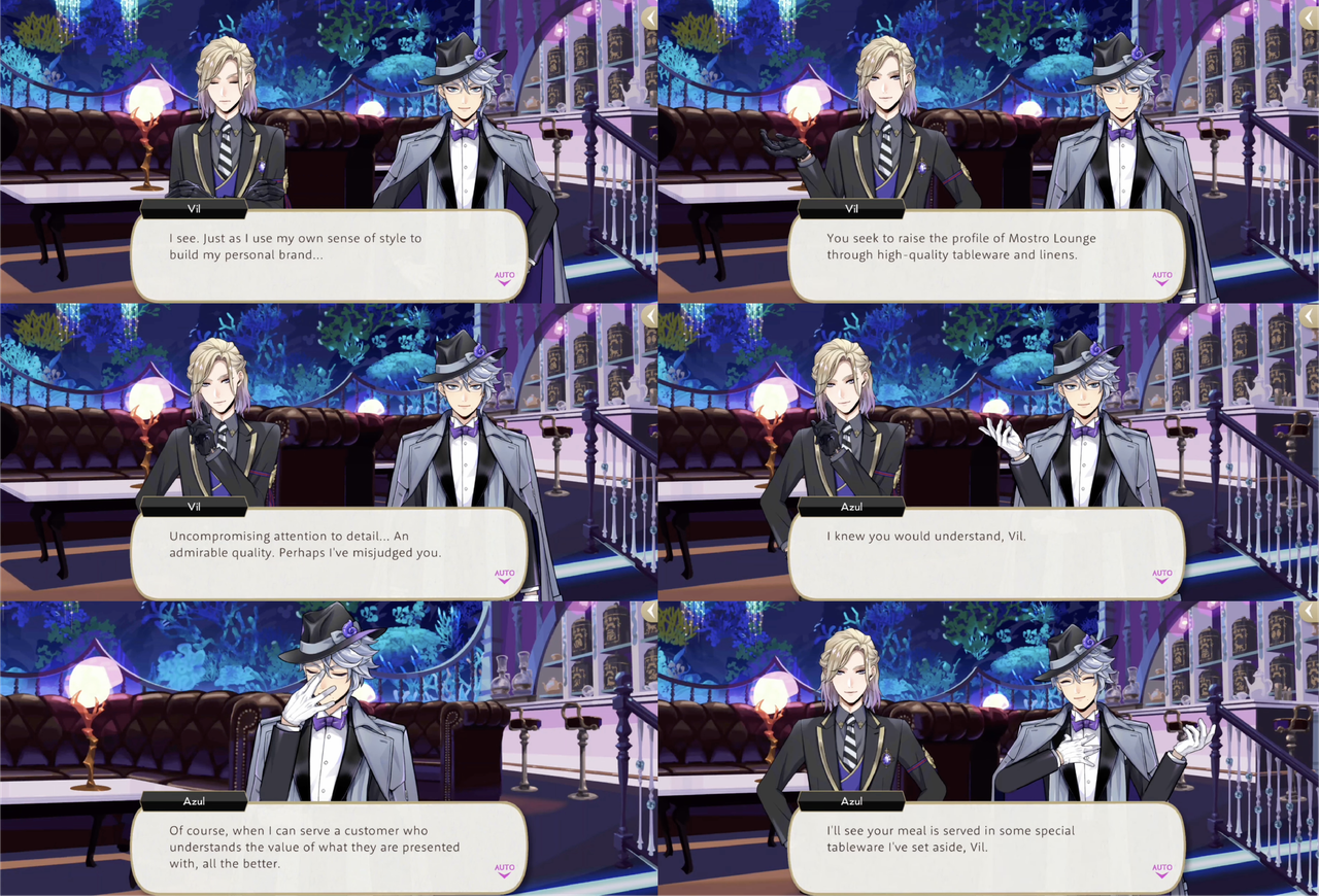 Vil visits the lounge after the events of Tapis Rouge, where the dishware that Azul purchased is being used by Deuce and Epel. Vil observes, “…They don’t have any idea how expensive those cups are, do they? Nor does anyone else in here. Do you still stand by your purchase?,” and Azul says, “Of course. As long as I’m running the Mostro Lounge, we will serve food and drink in fine tableware I select myself. I have no intention of making compromises. Ever.”