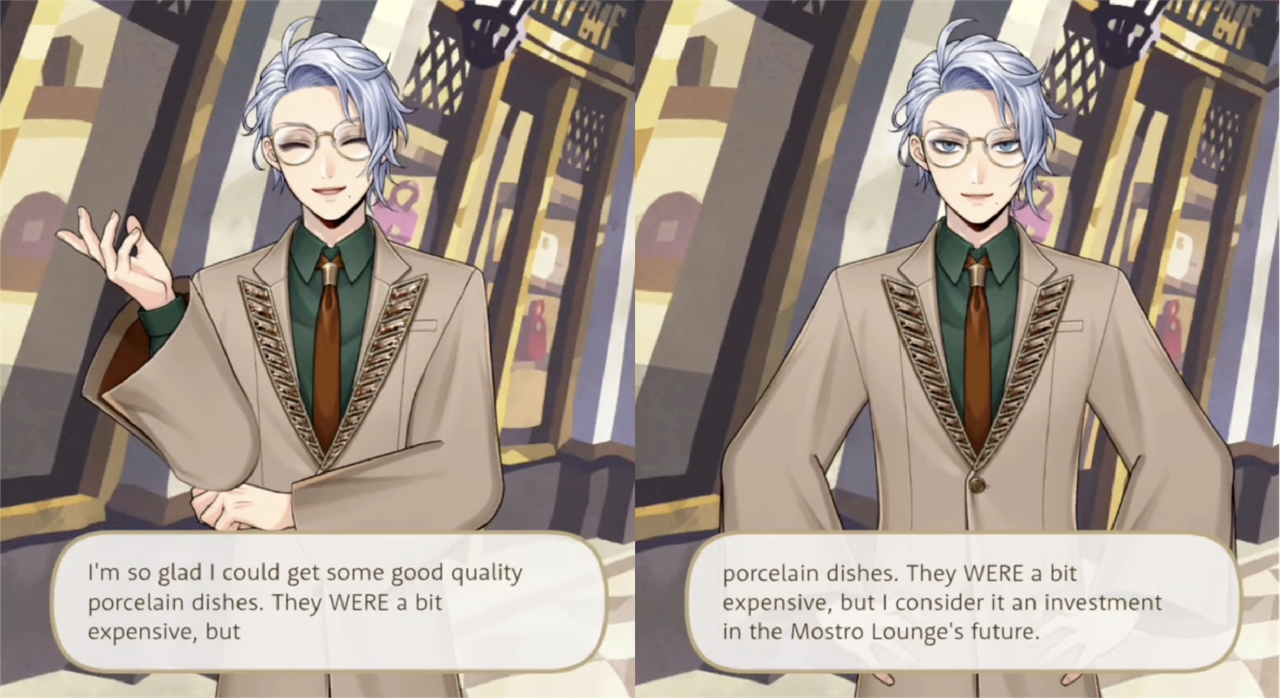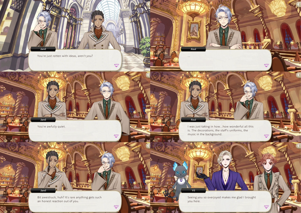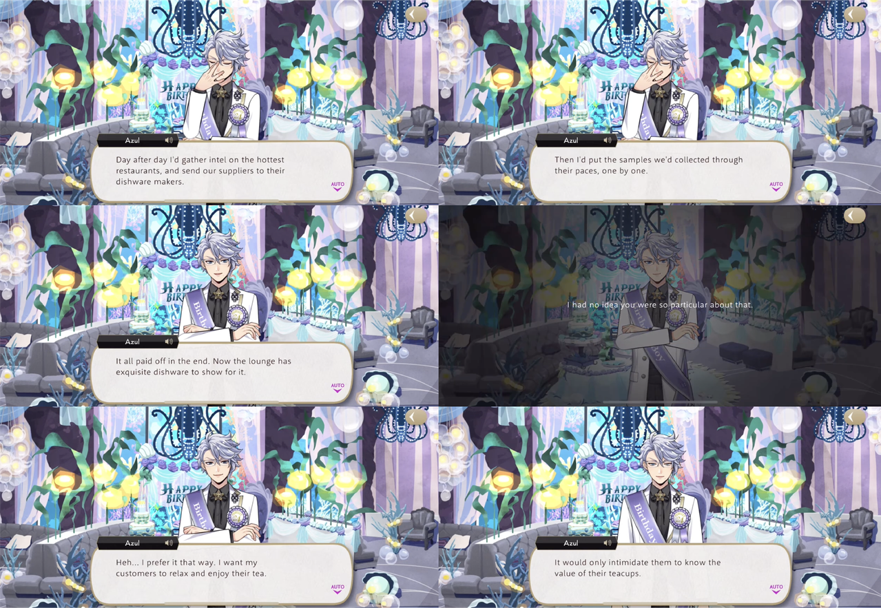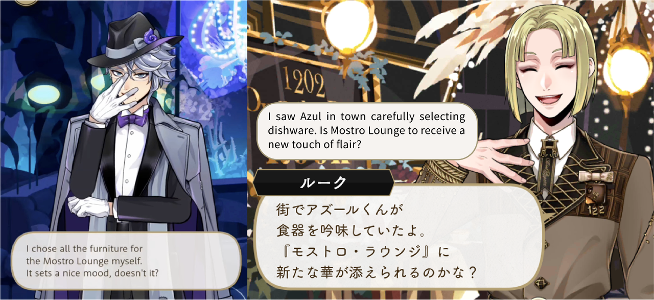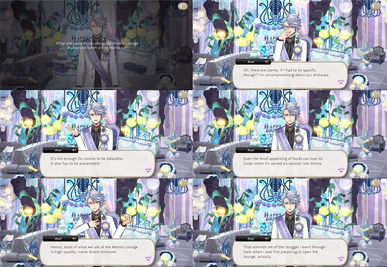 Vil visits the lounge after the events of Tapis Rouge, where the dishware that Azul purchased is being used by Deuce and Epel. Vil observes, “…They don’t have any idea how expensive those cups are, do they? Nor does anyone else in here. Do you still stand by your purchase?,” and Azul says, “Of course. As long as I’m running the Mostro Lounge, we will serve food and drink in fine tableware I select myself. I have no intention of making compromises. Ever.”