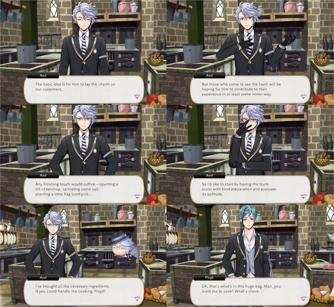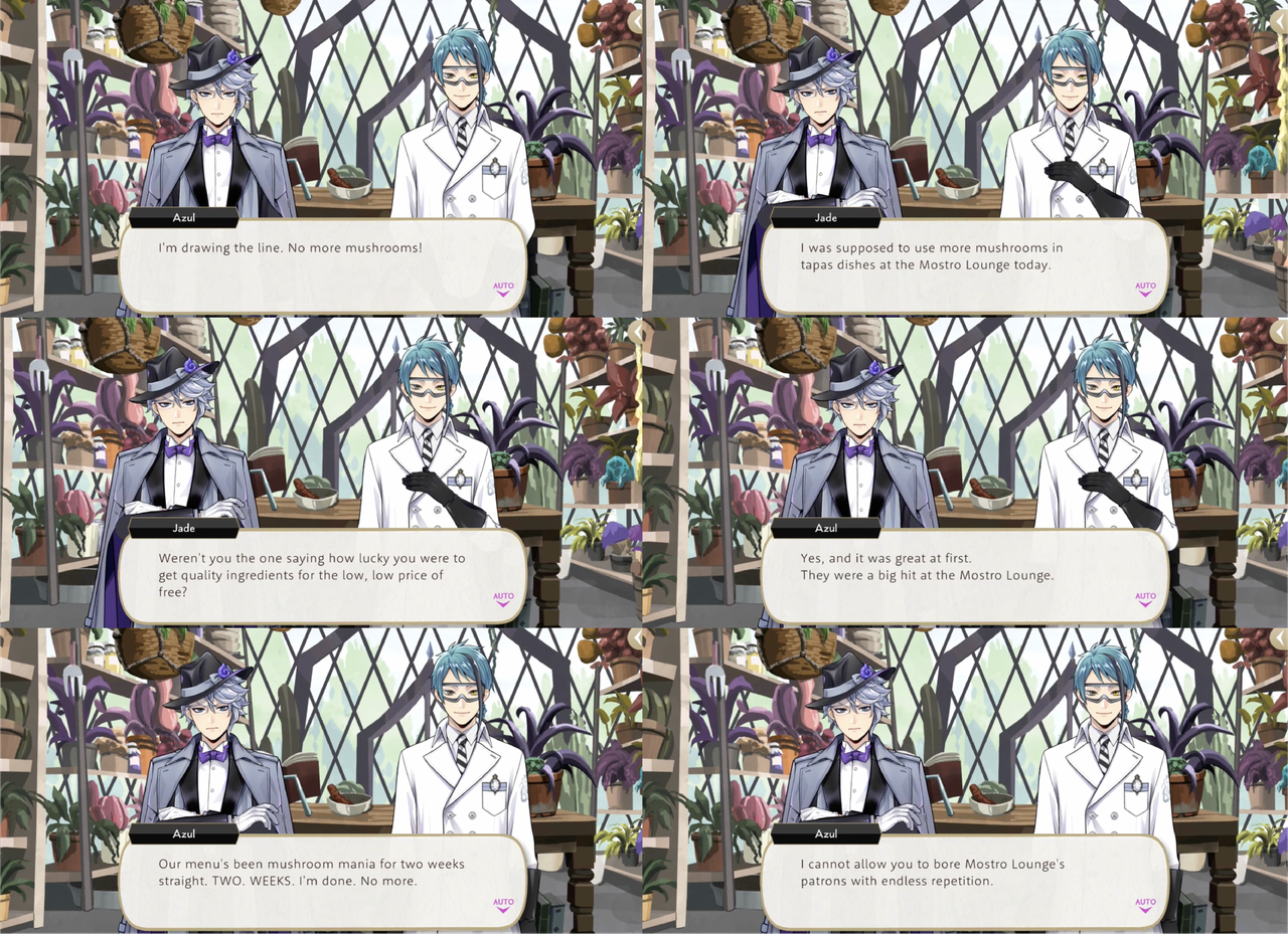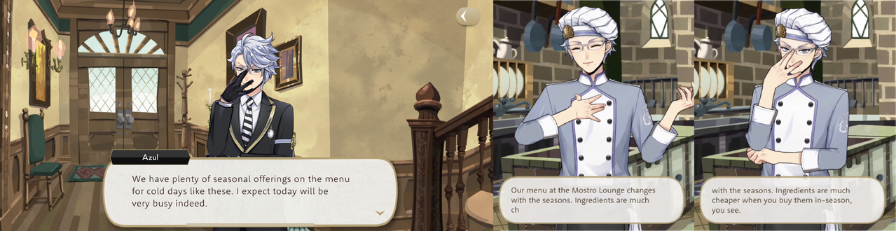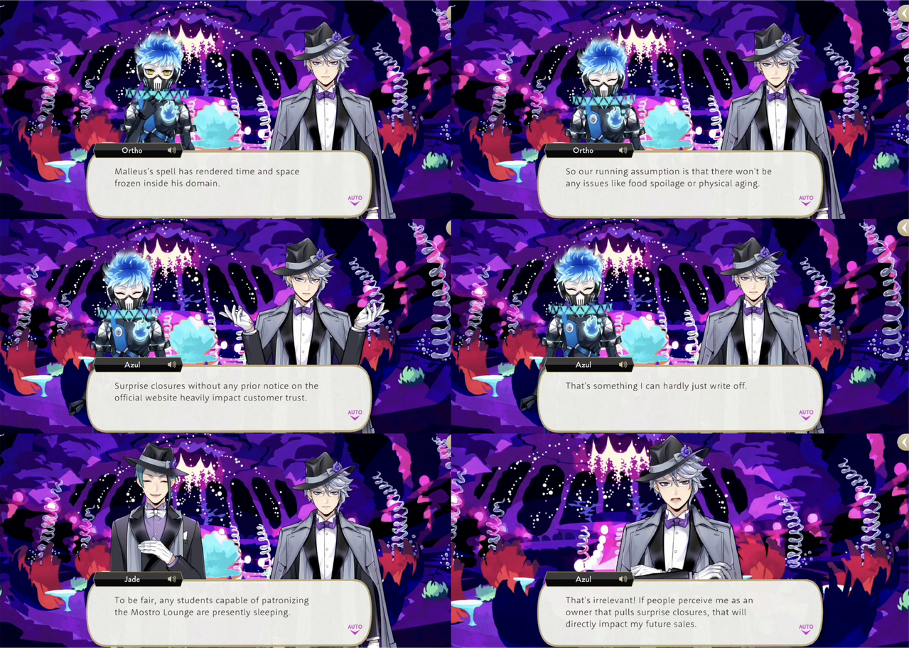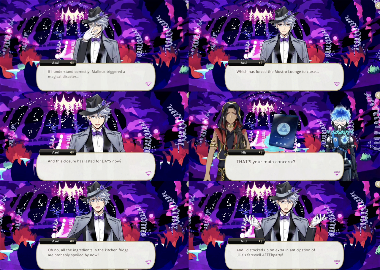 After hearing about Malleus’ unique magic steadily taking over the entire world Azul’s first response is, “Which has forced the Mostro Lounge to close, and this closure has lasted for DAYS now?!” He expresses concern about the ingredients spoiling (“And I’d stocked up on extra in anticipation of Lilia’s farewell AFTERparty!”), but Ortho assures him that there does not seem to be reason for concern about issues like food spoilage or physical aging.