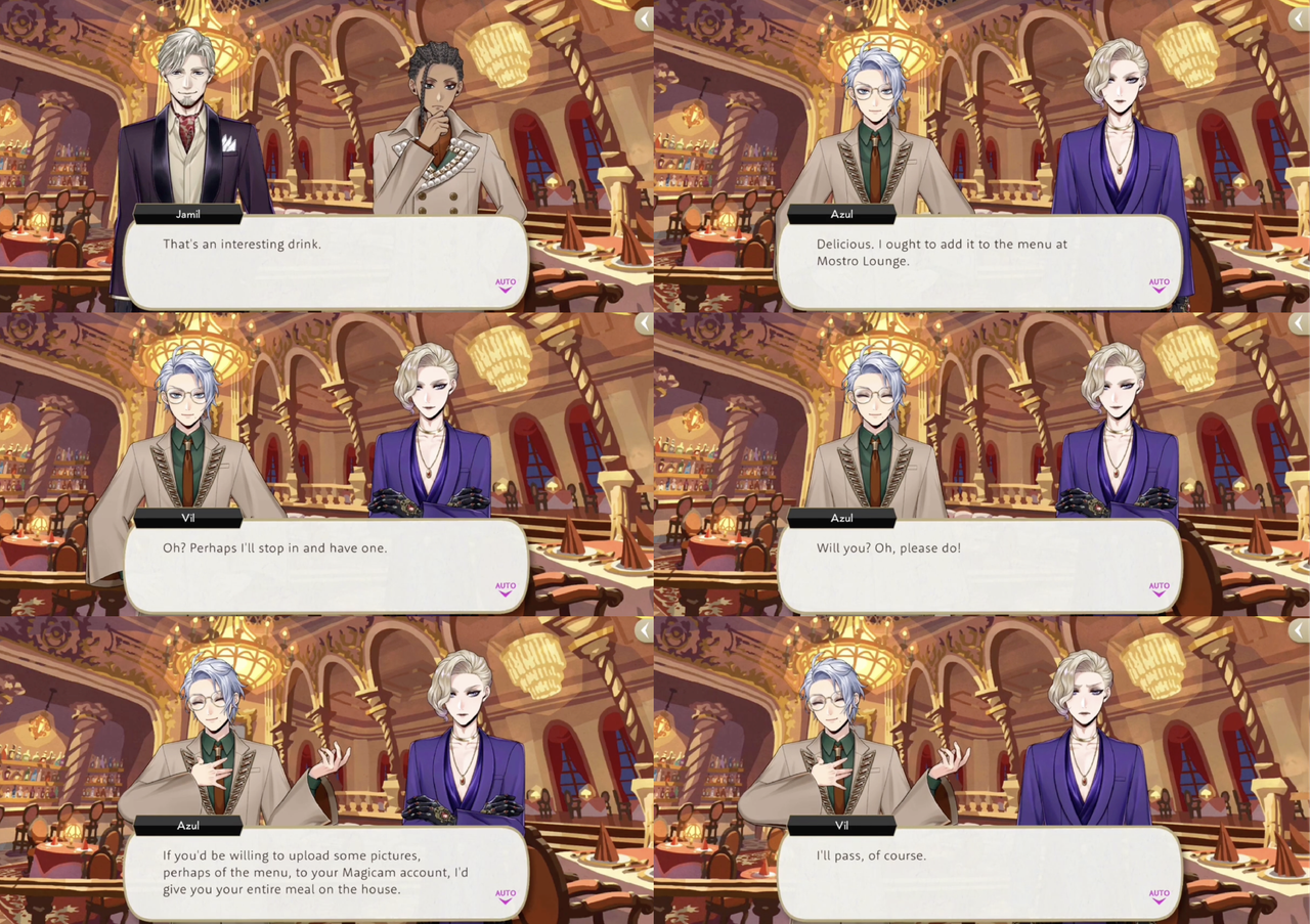 When Vil says, “Perhaps I’ll stop in and have one,” Azul replies, “If you’d be willing to upload some pictures, perhaps of the menu, to your Magicam account, I’d give you your entire meal on the house.” (Vil: “I’ll pass, of course.”)